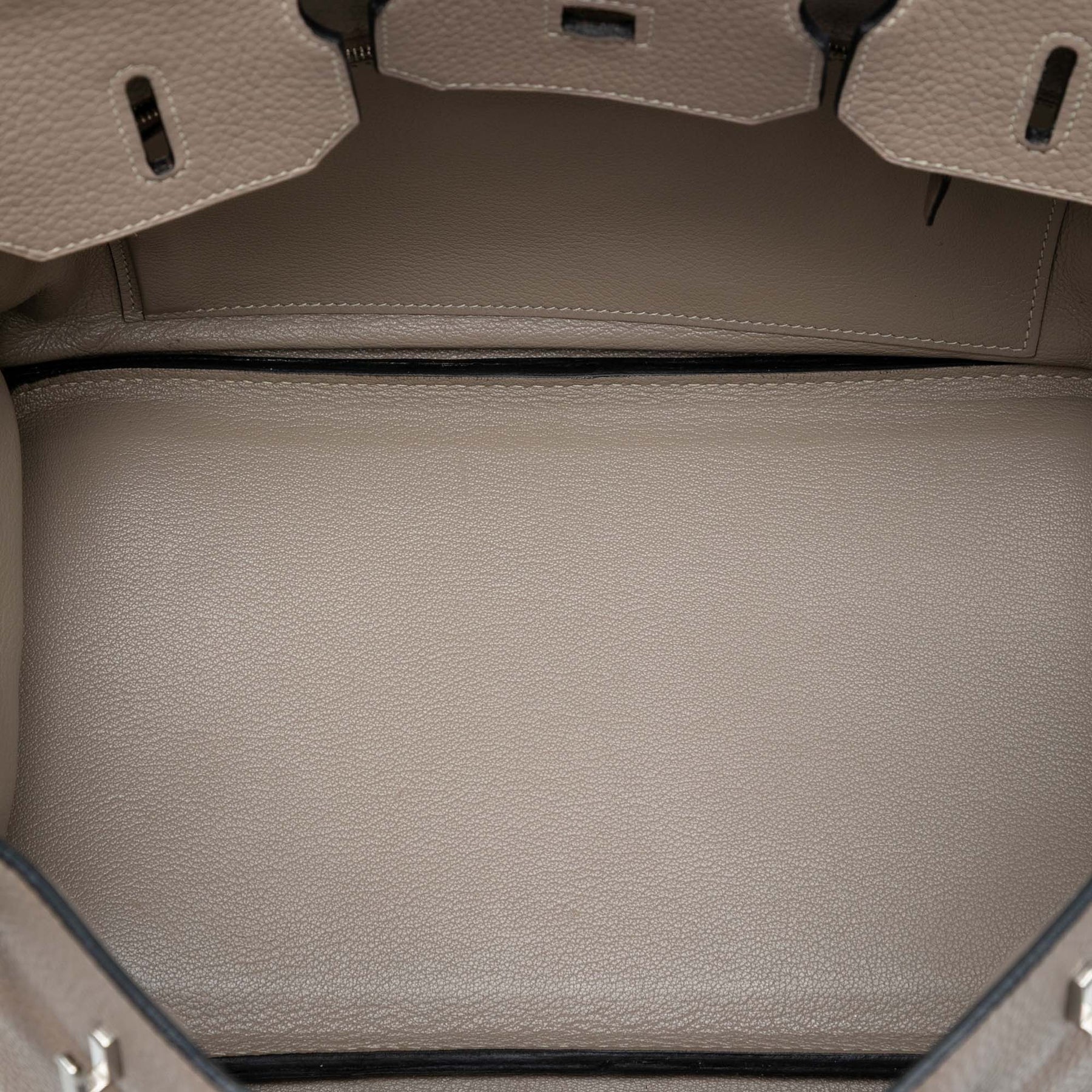 Ce Birkin 35 est confectionné en cuir Togo Gris Tourterelle, possède des anses roulées, un rabat avant avec fermoir tourniquet, ainsi que des poches intérieures plaquées et zippées. Les coins extérieurs ont été repeints. Son état est correct.