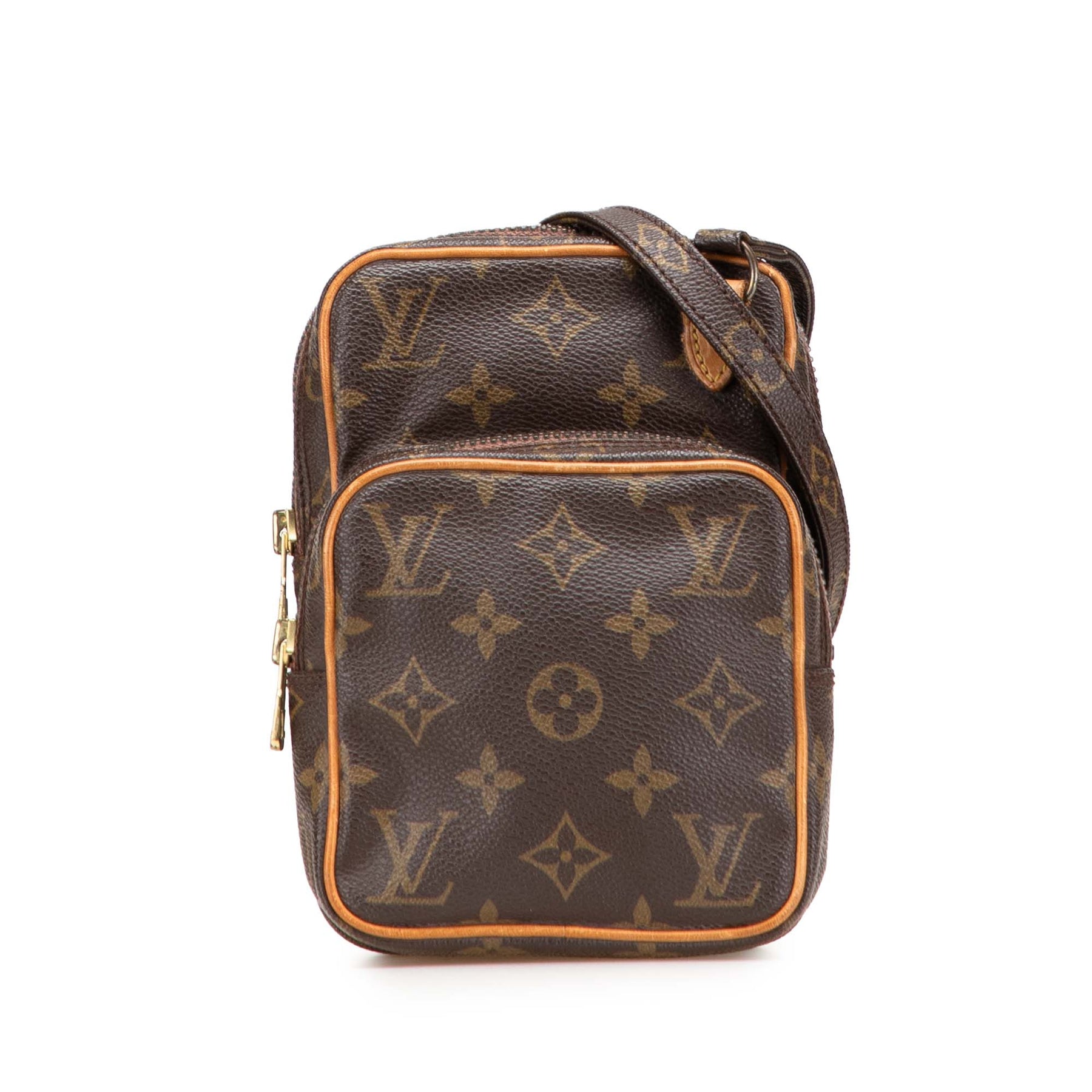 Le sac Mini Amazone est confectionné en toile monogrammée avec des finitions en cuir vachetta, une bandoulière plate ajustable, une fermeture zippée sur le dessus et une poche extérieure zippée à l'avant. Il est en bon état.