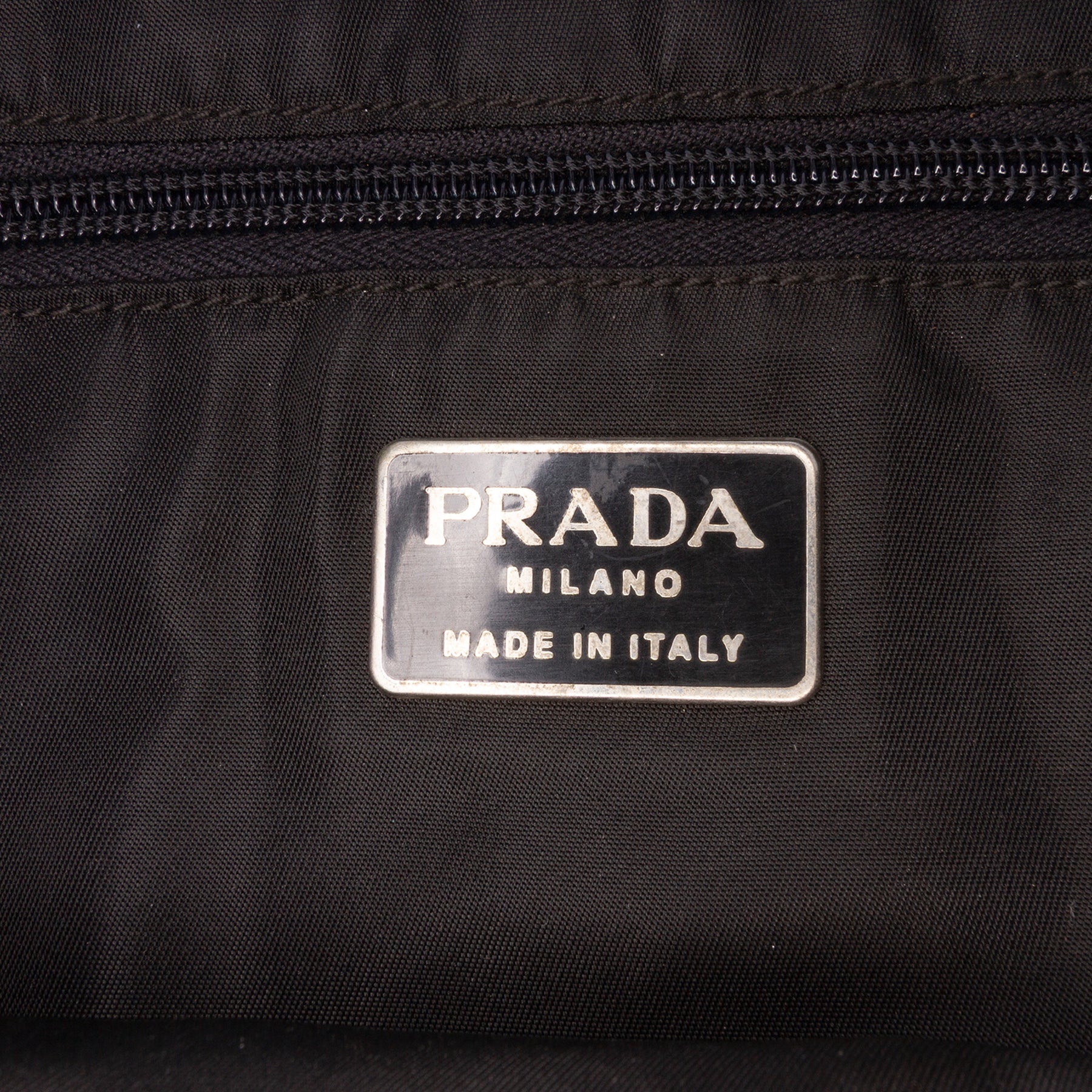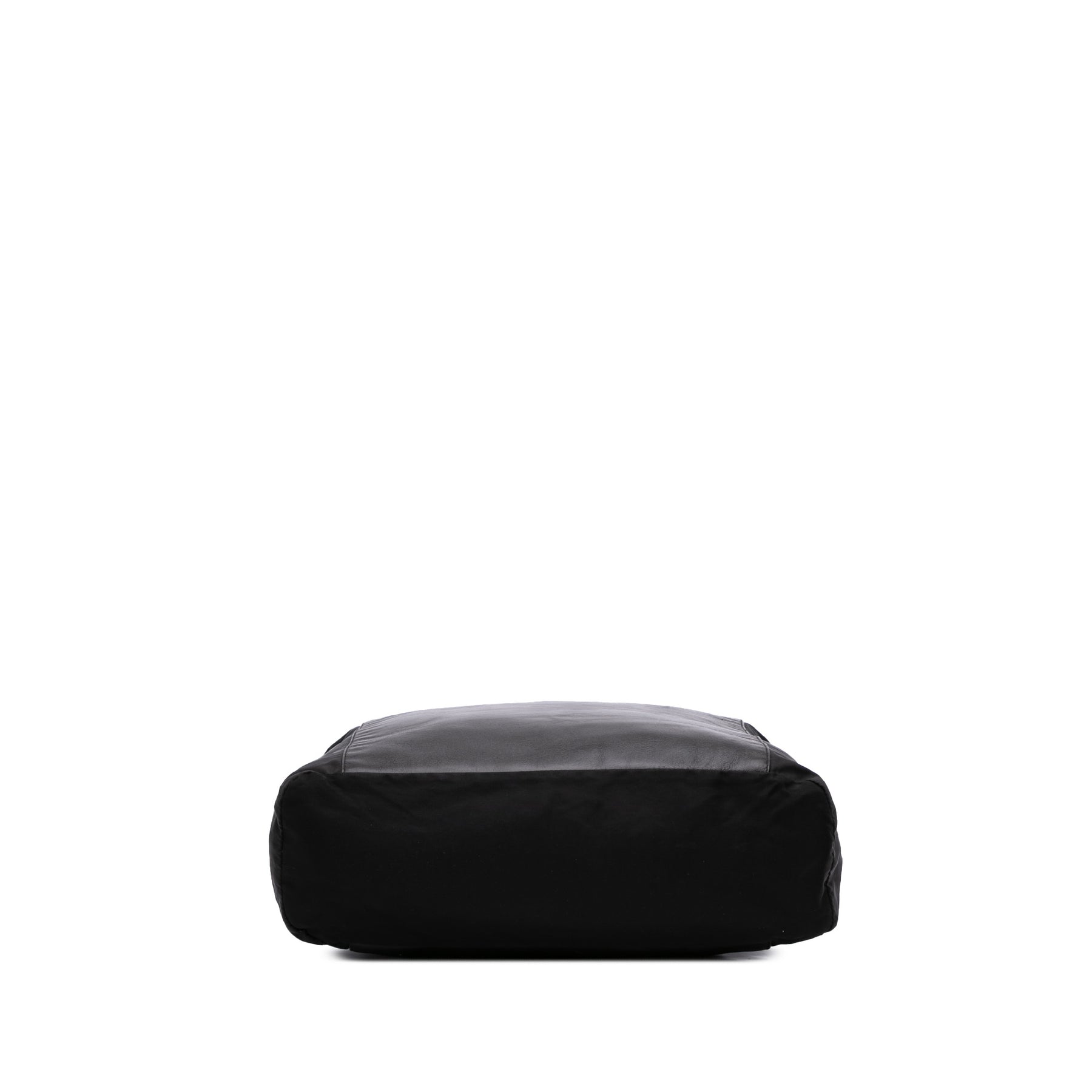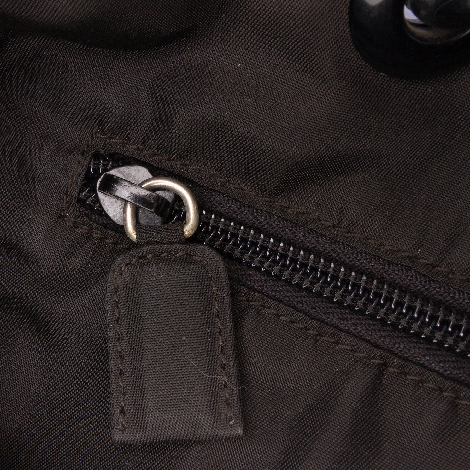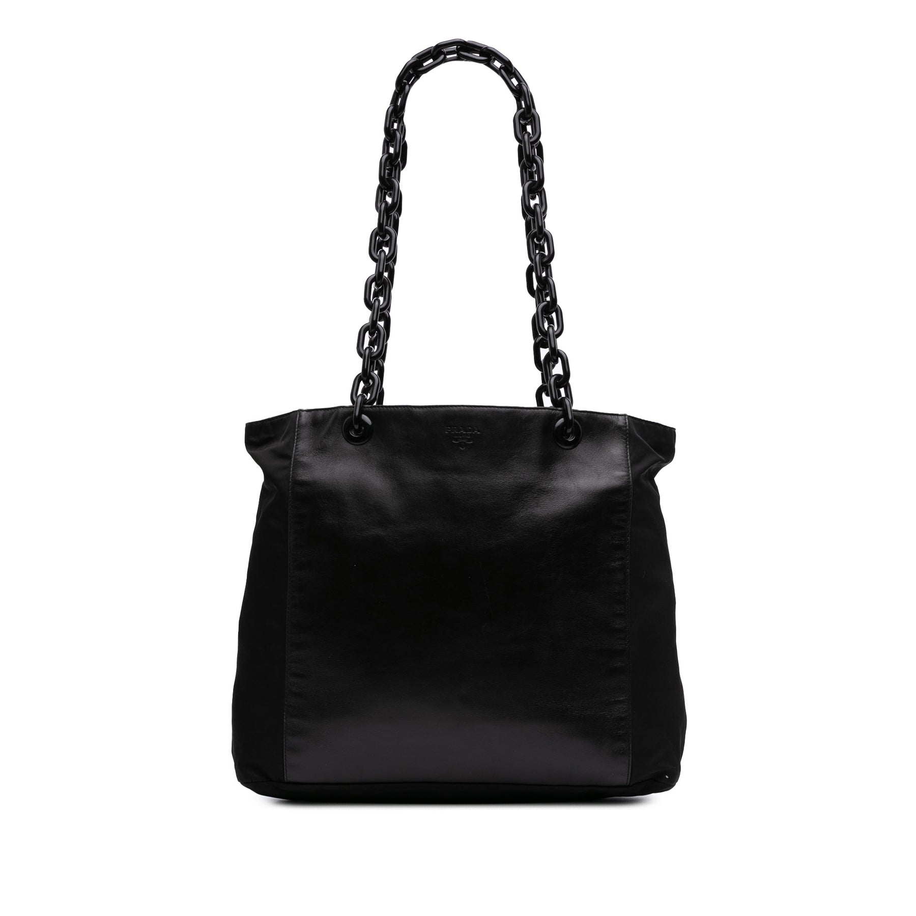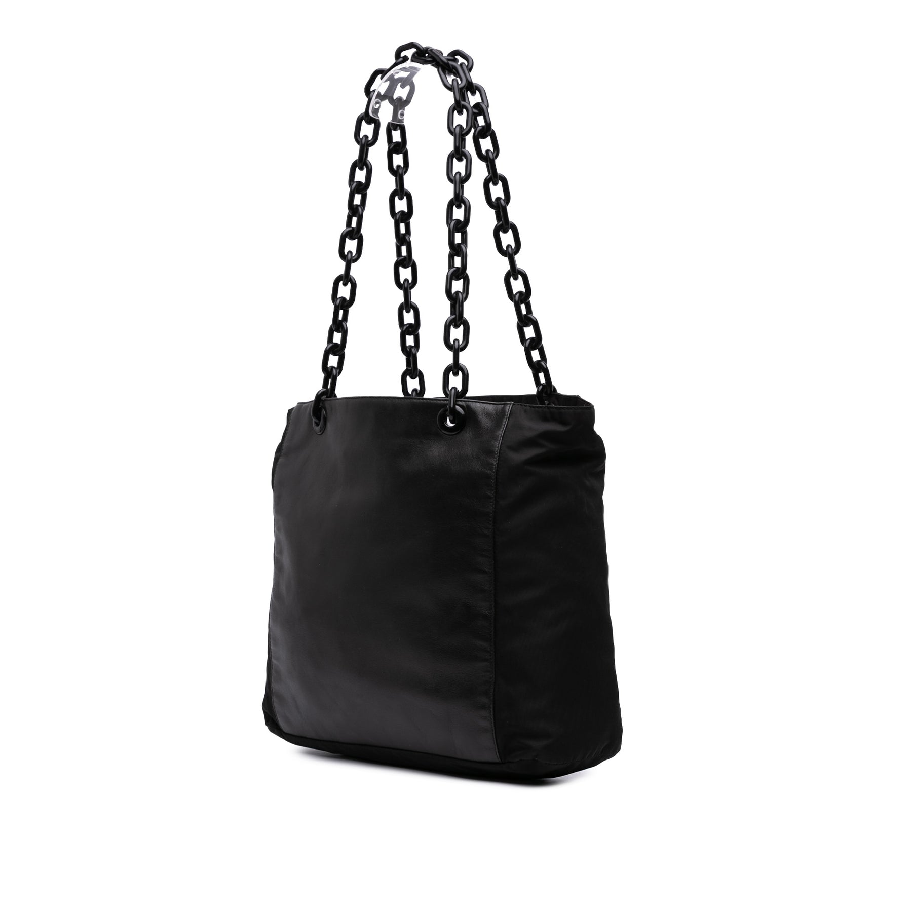Ce sac cabas est confectionné en nylon et cuir, avec des anses en chaîne de résine, une ouverture sur le dessus et des poches intérieures zippées. Il est en bon état.