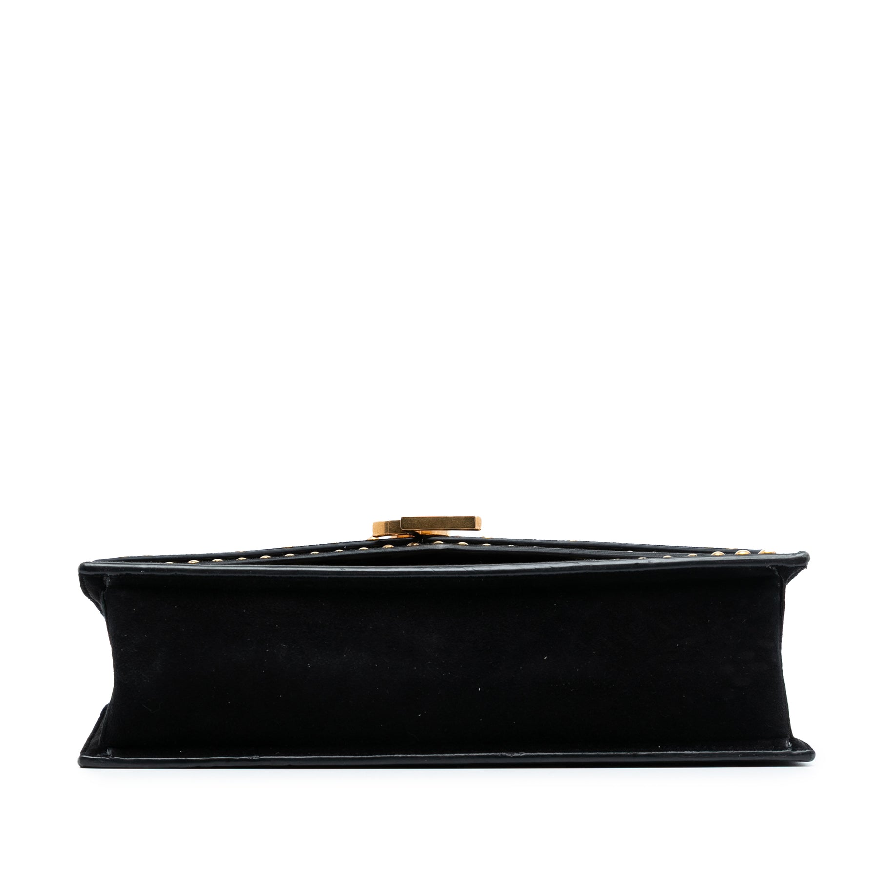 Ce sac bandoulière est en daim clouté, possède une bandoulière chaîne avec épaulette en cuir, un rabat avant à fermeture magnétique et une poche intérieure plaquée. Il est en excellent état.