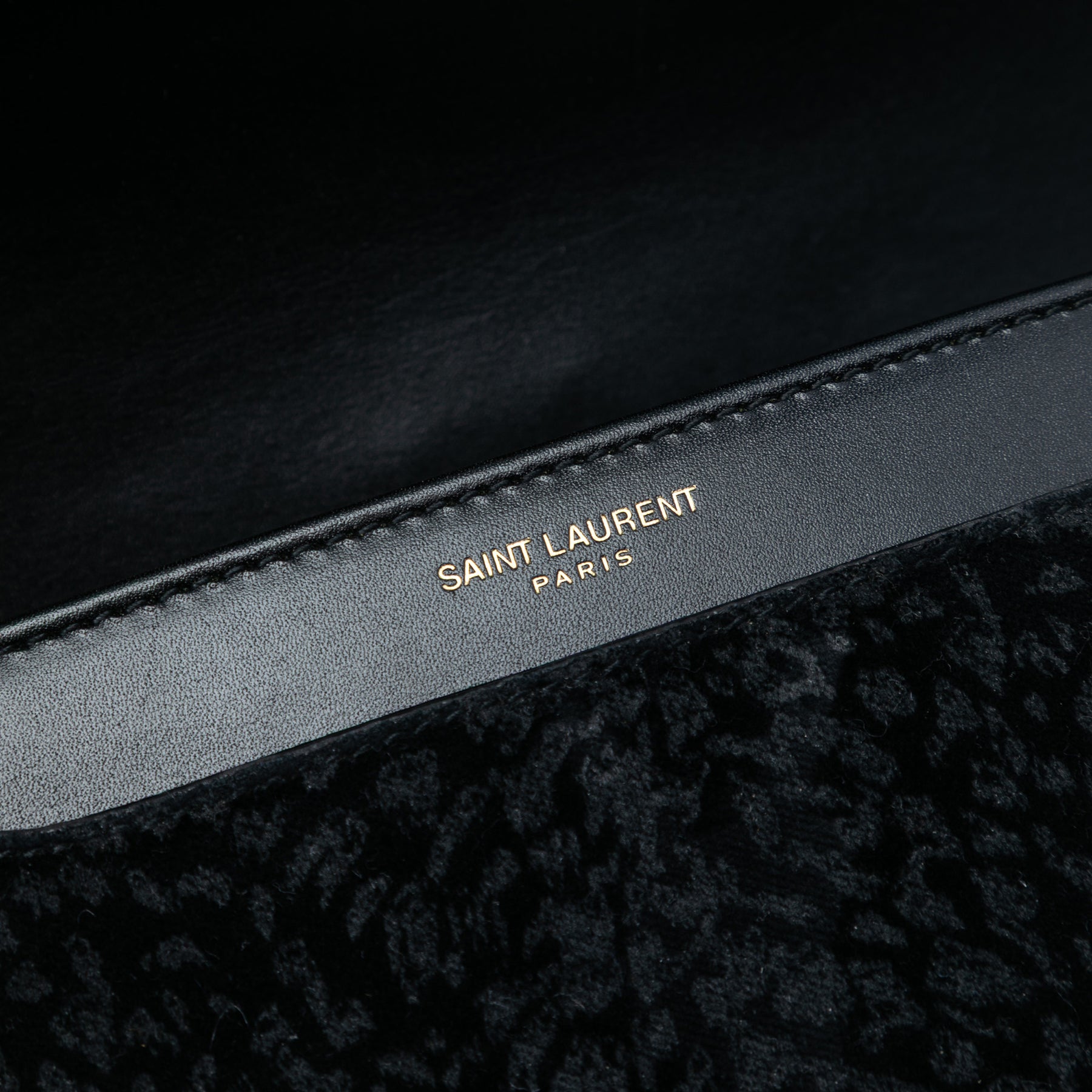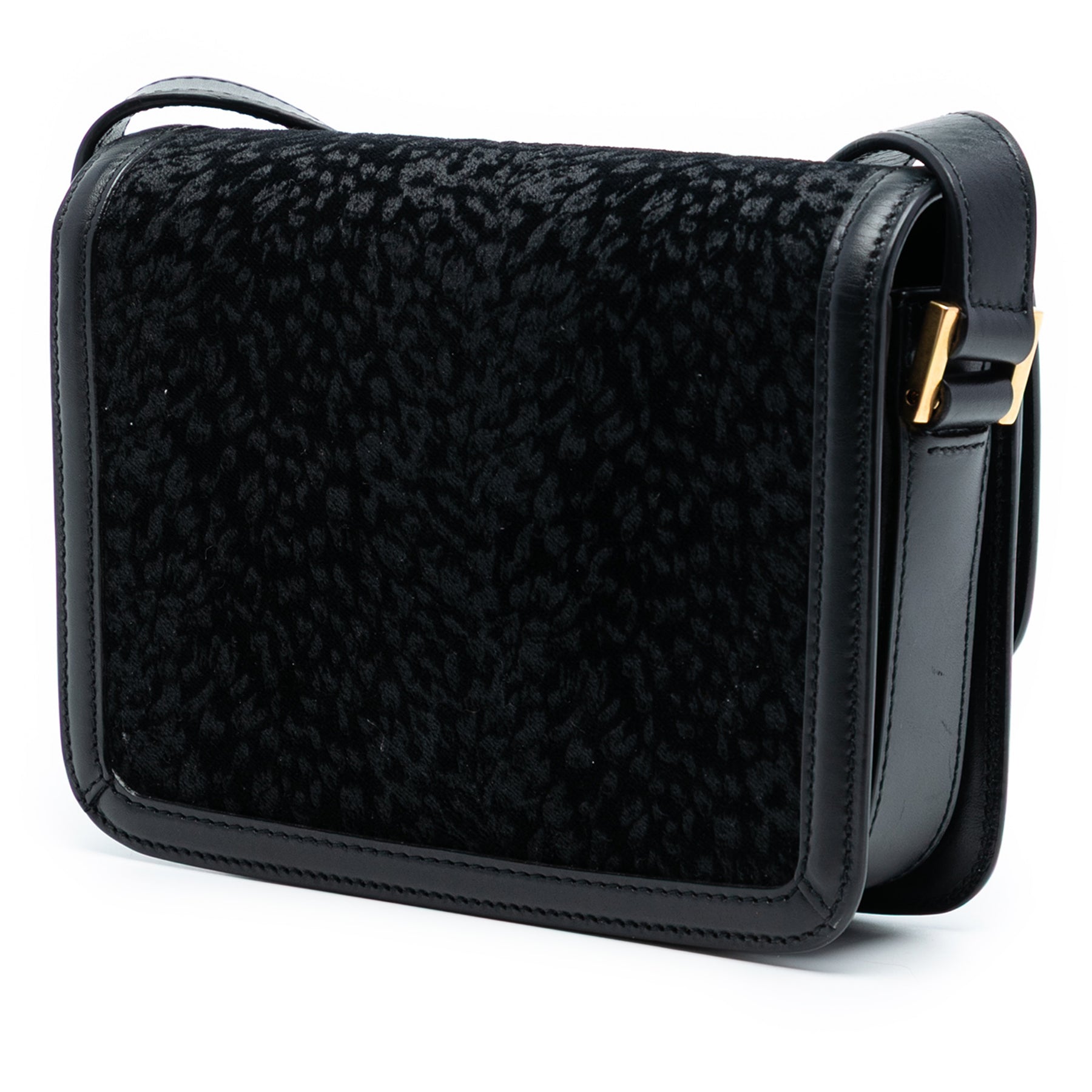 Le sac Solferino est en velours avec des finitions en cuir, une bandoulière plate réglable en cuir, un rabat à fermoir et une poche intérieure plaquée. Il est en excellent état.