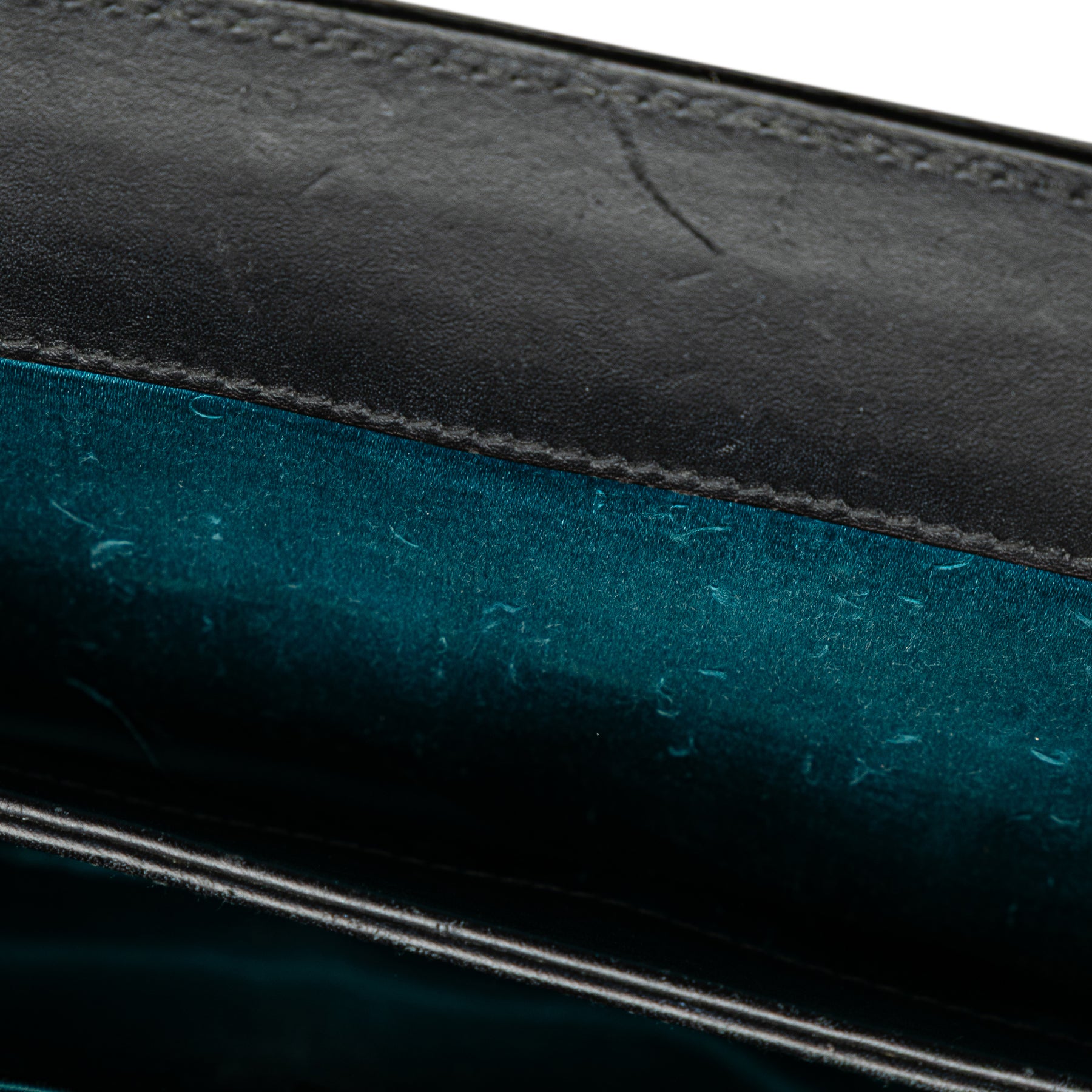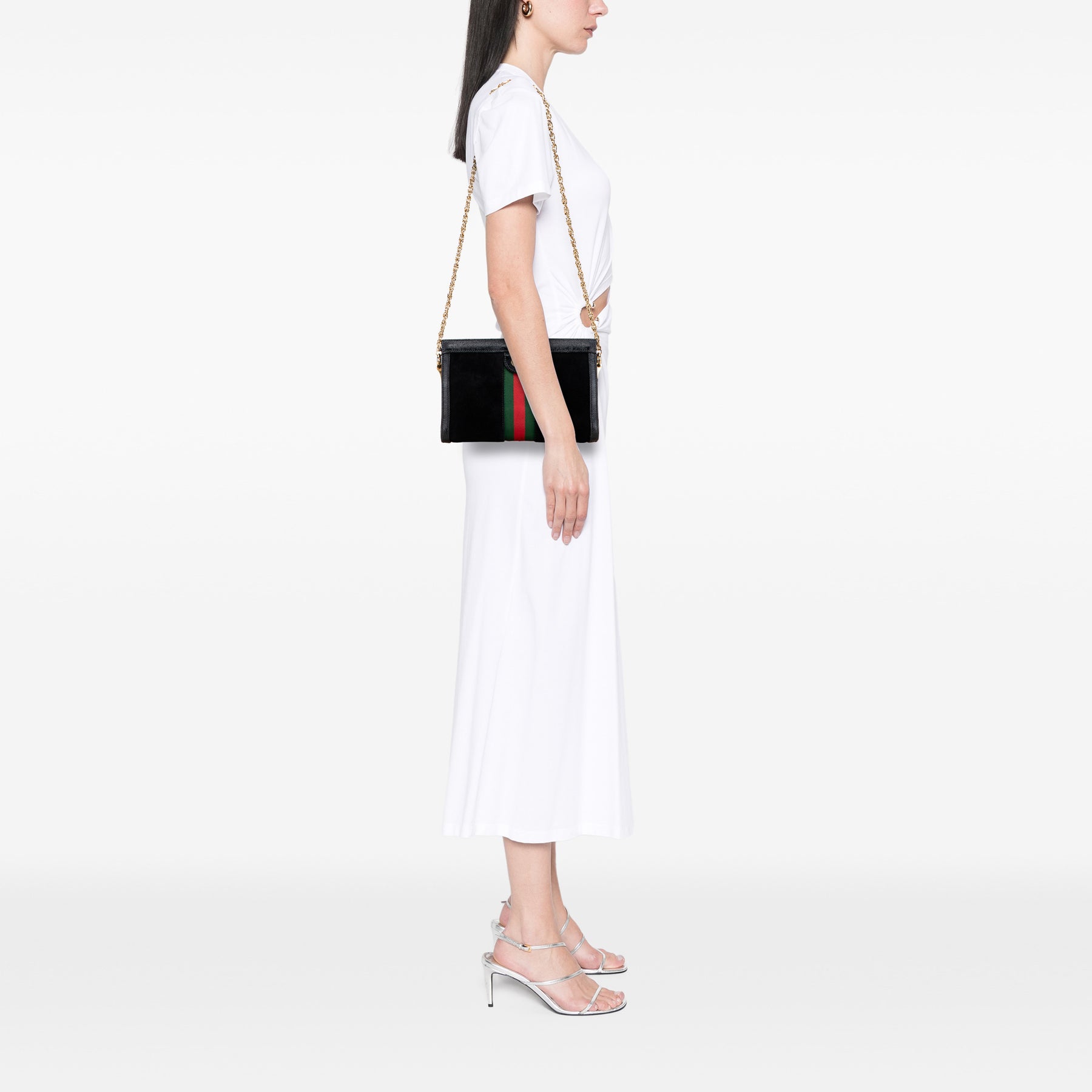 Le sac bandoulière Ophidia est doté d'un corps en daim avec des finitions en cuir, d'une bandoulière en chaîne, d'une fermeture à pression magnétique et d'une poche intérieure. Il est en bon état.