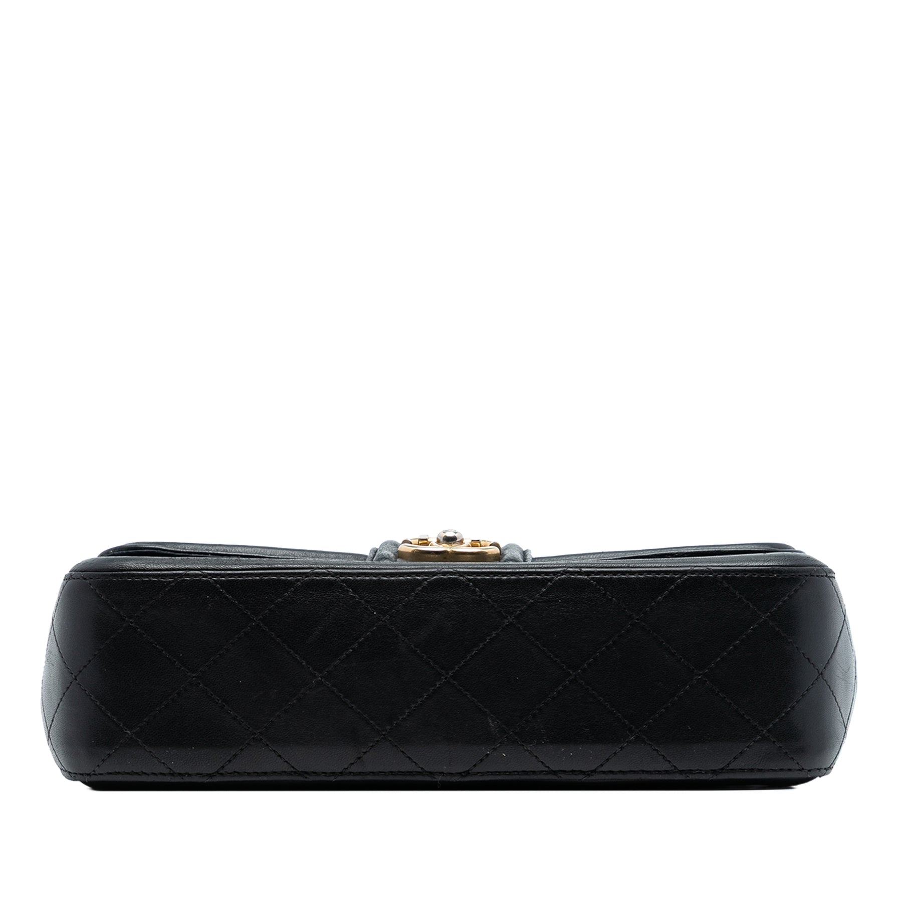 Ce sac bandoulière est confectionné en cuir d'agneau matelassé et possède une bandoulière en chaîne tressée avec une protection d'épaule en cuir, un rabat avant avec fermoir CC et une poche intérieure zippée. Il est en bon état.