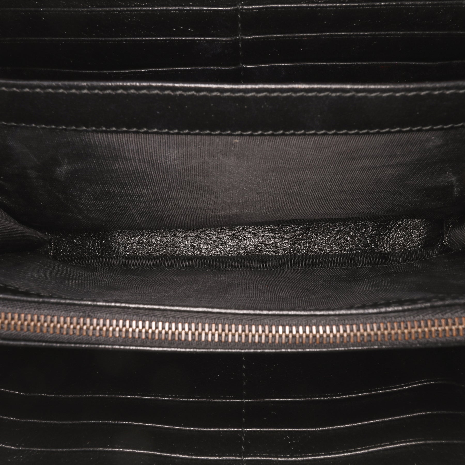 Ce portefeuille à chaîne est confectionné en cuir matelassé et possède une bandoulière chaîne dorée, un rabat avant à fermeture magnétique, ainsi que des compartiments intérieurs zippés et plaqués. Il est en bon état.