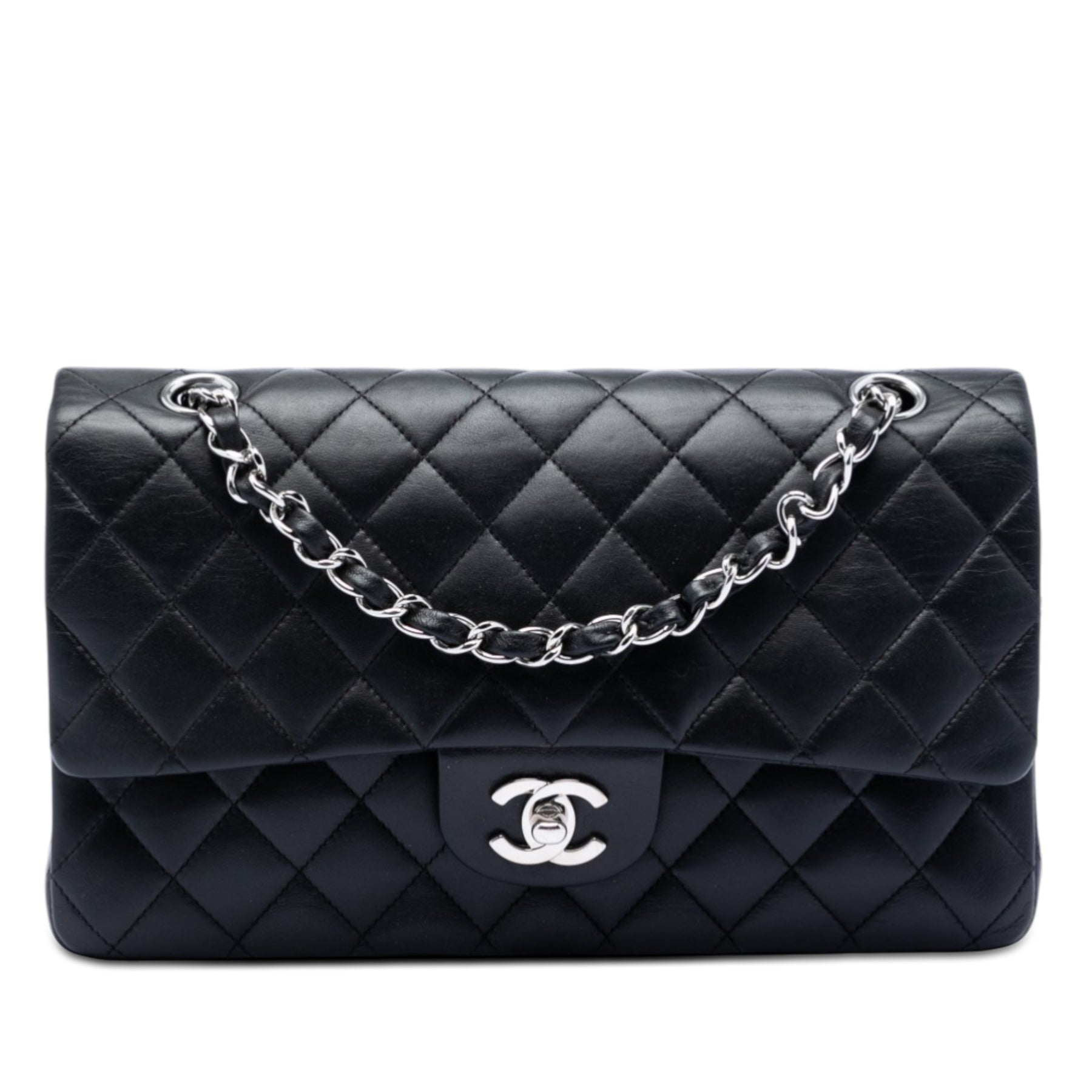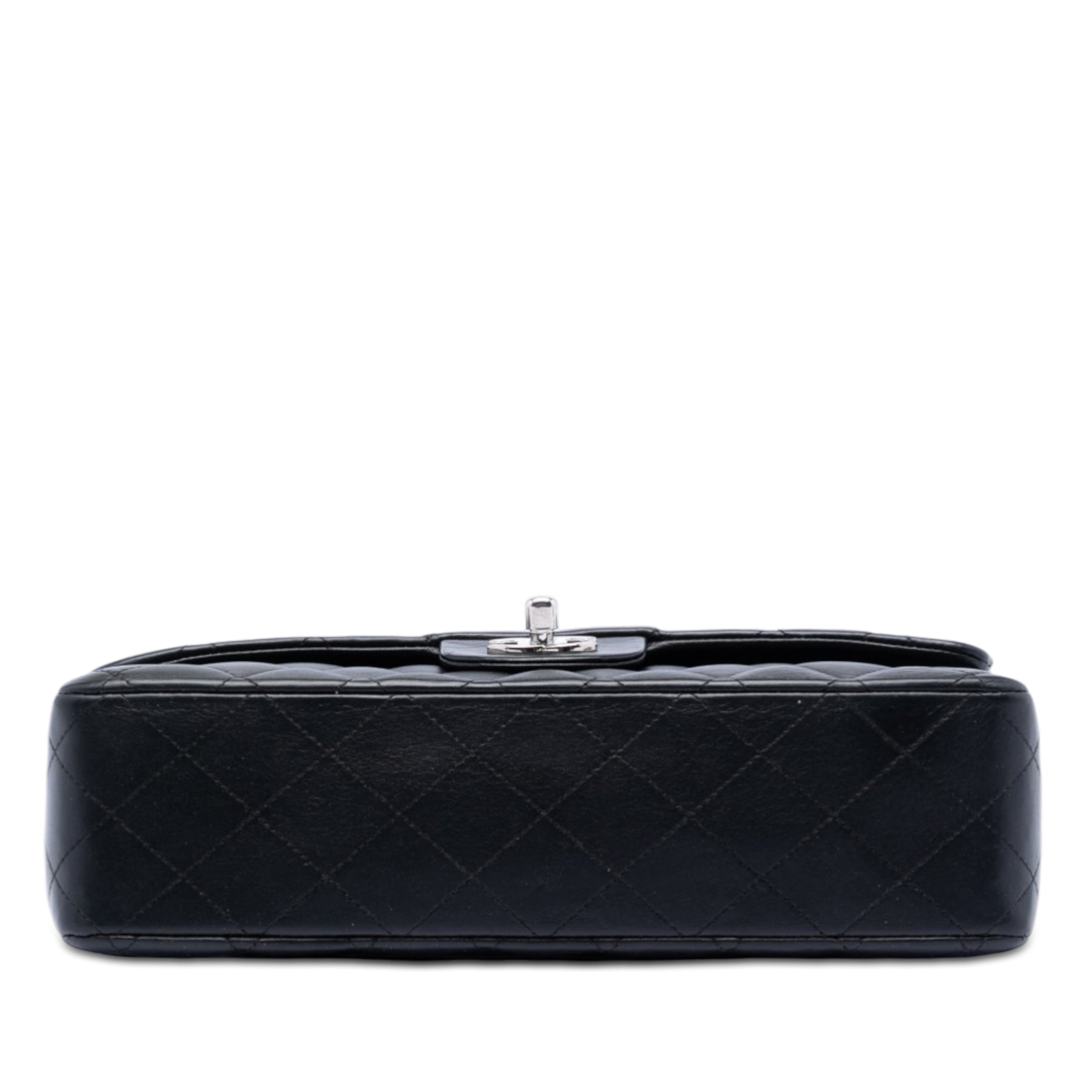 Ce sac bandoulière est confectionné en cuir d'agneau matelassé et présente une poche plaquée extérieure au dos, des bandoulières en chaîne tressée de cuir, un double rabat avant orné du double C entrelacé et d'une fermeture à tourniquet, ainsi que des poches intérieures zippées et plaquées. Il est en excellent état.