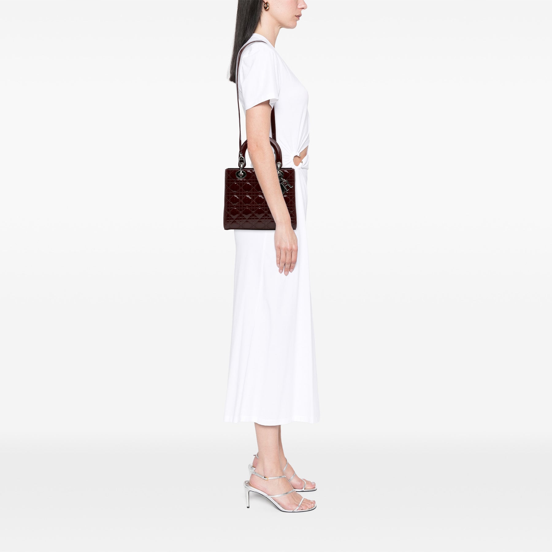 Le Lady Dior est doté d'un corps en cuir verni matelassé, de poignées supérieures plates en cuir, d'une bandoulière plate amovible en cuir, d'une fermeture zippée sur le dessus et d'une poche intérieure zippée. Il est en bon état.