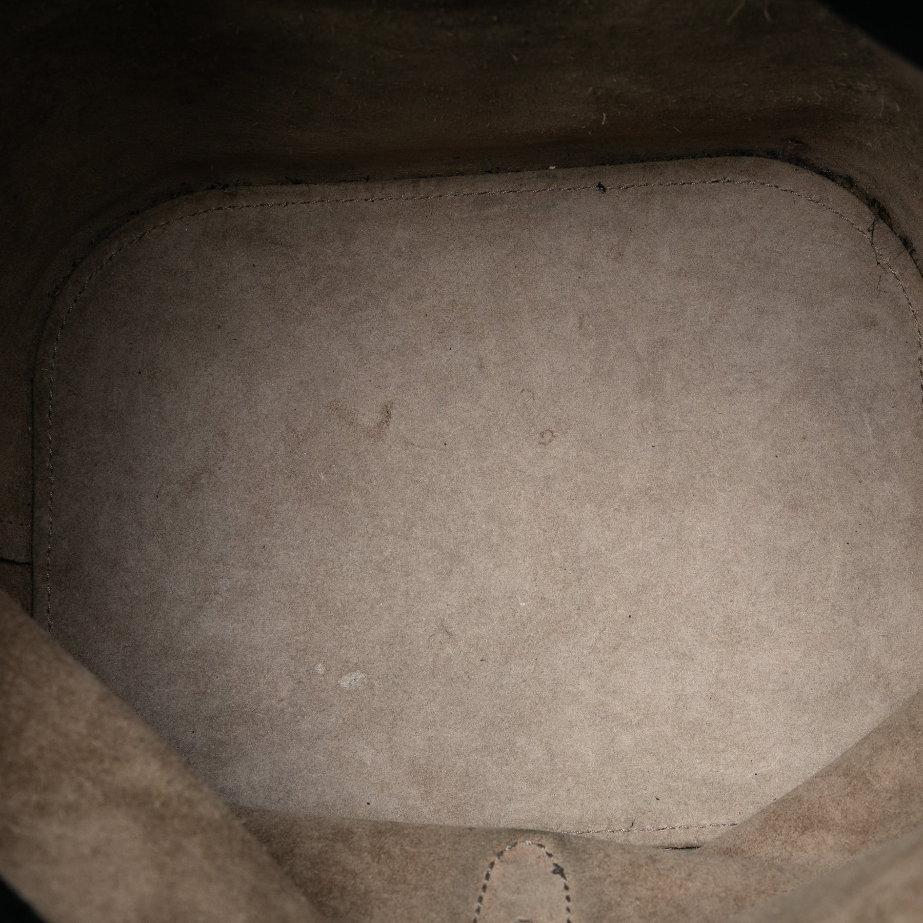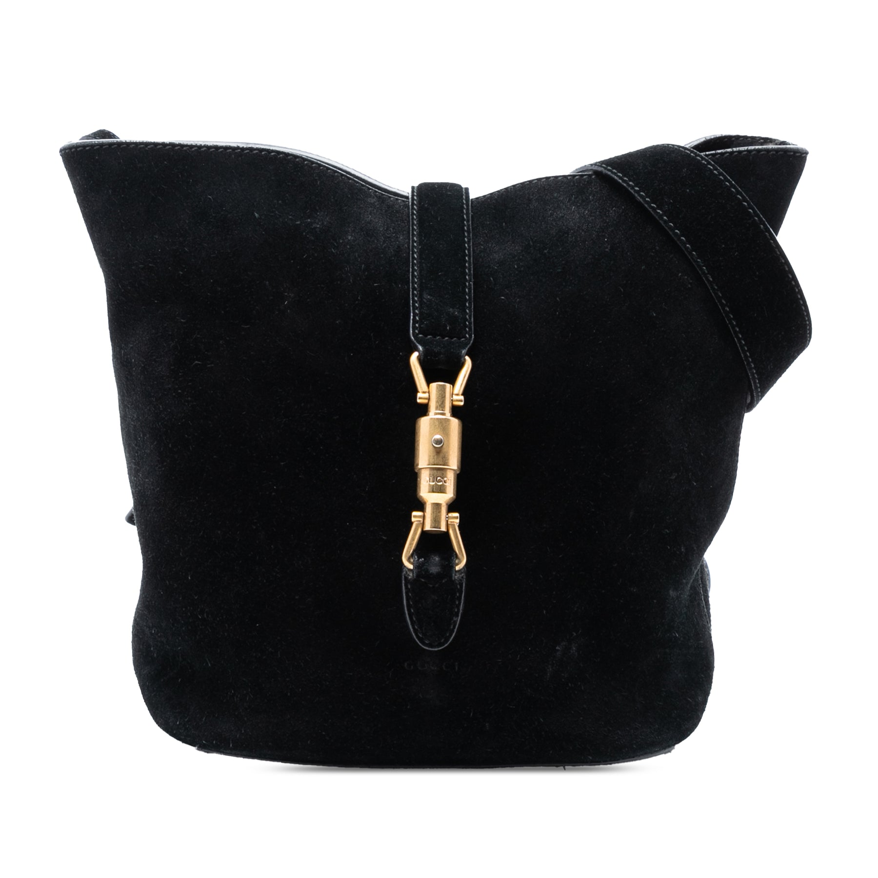 Le sac seau Jackie est en daim, possède une bandoulière plate réglable en cuir, une fermeture à piston sur le devant et une pochette intérieure zippée. Il est en bon état.