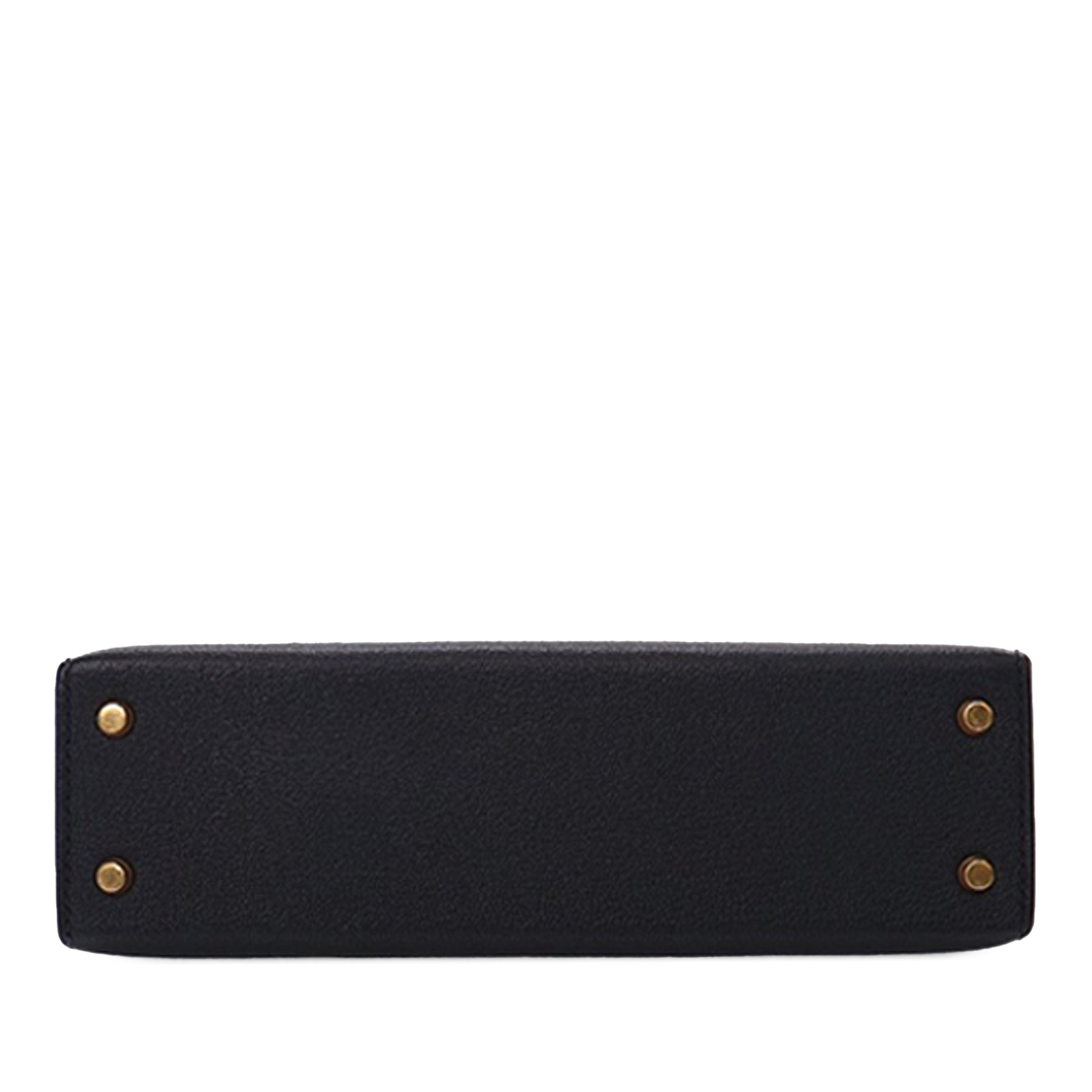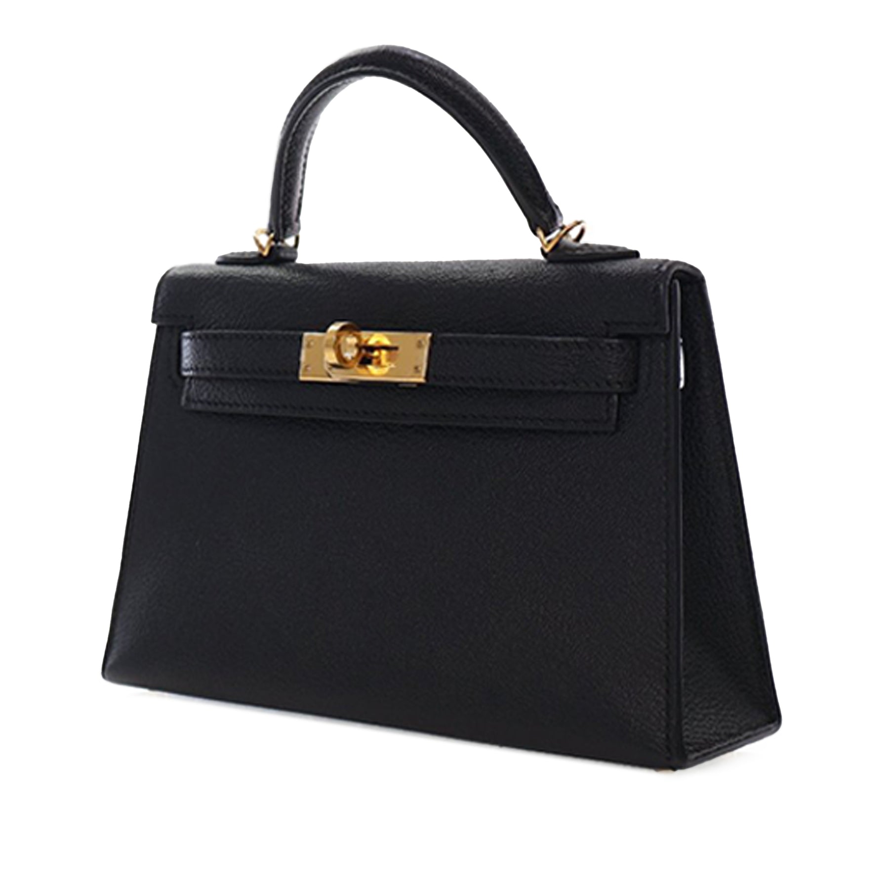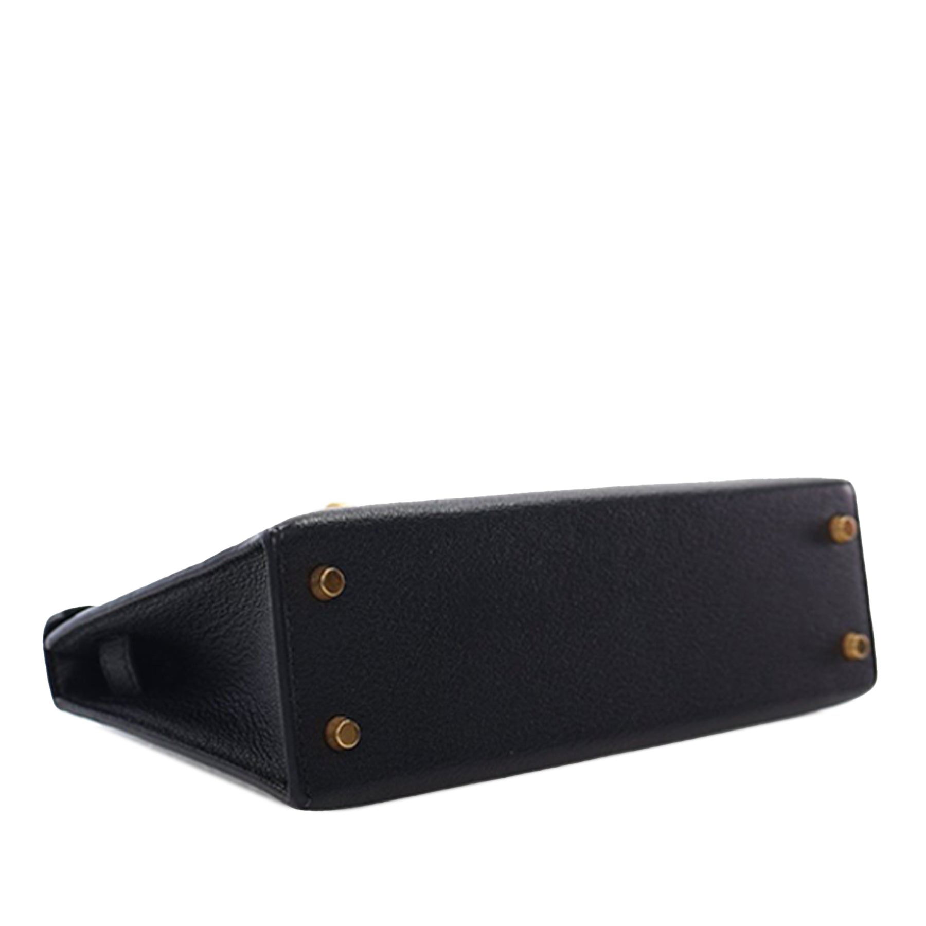 Ce mini sac Kelly II est doté d'un corps en cuir de chèvre noir, d'une poignée supérieure roulée, d'une bandoulière plate amovible en cuir, d'un rabat supérieur avec fermoir à tourniquet et d'une poche intérieure plaquée. Il est en excellent état.