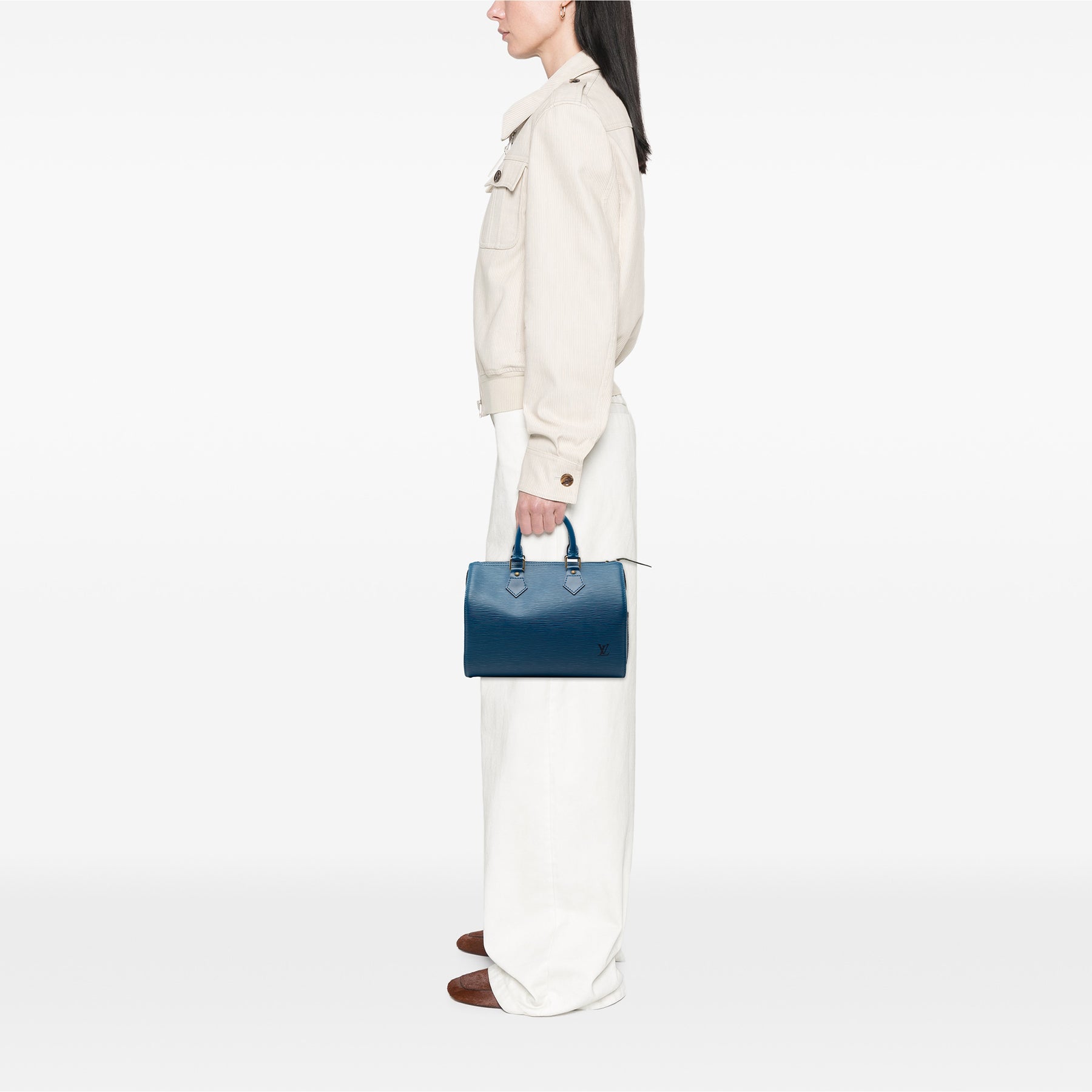 Le Speedy 25 est doté d'un corps en cuir Epi, de poignées roulées, d'une fermeture zippée sur le dessus, d'une poche latérale extérieure et d'une poche intérieure. Il est en bon état.