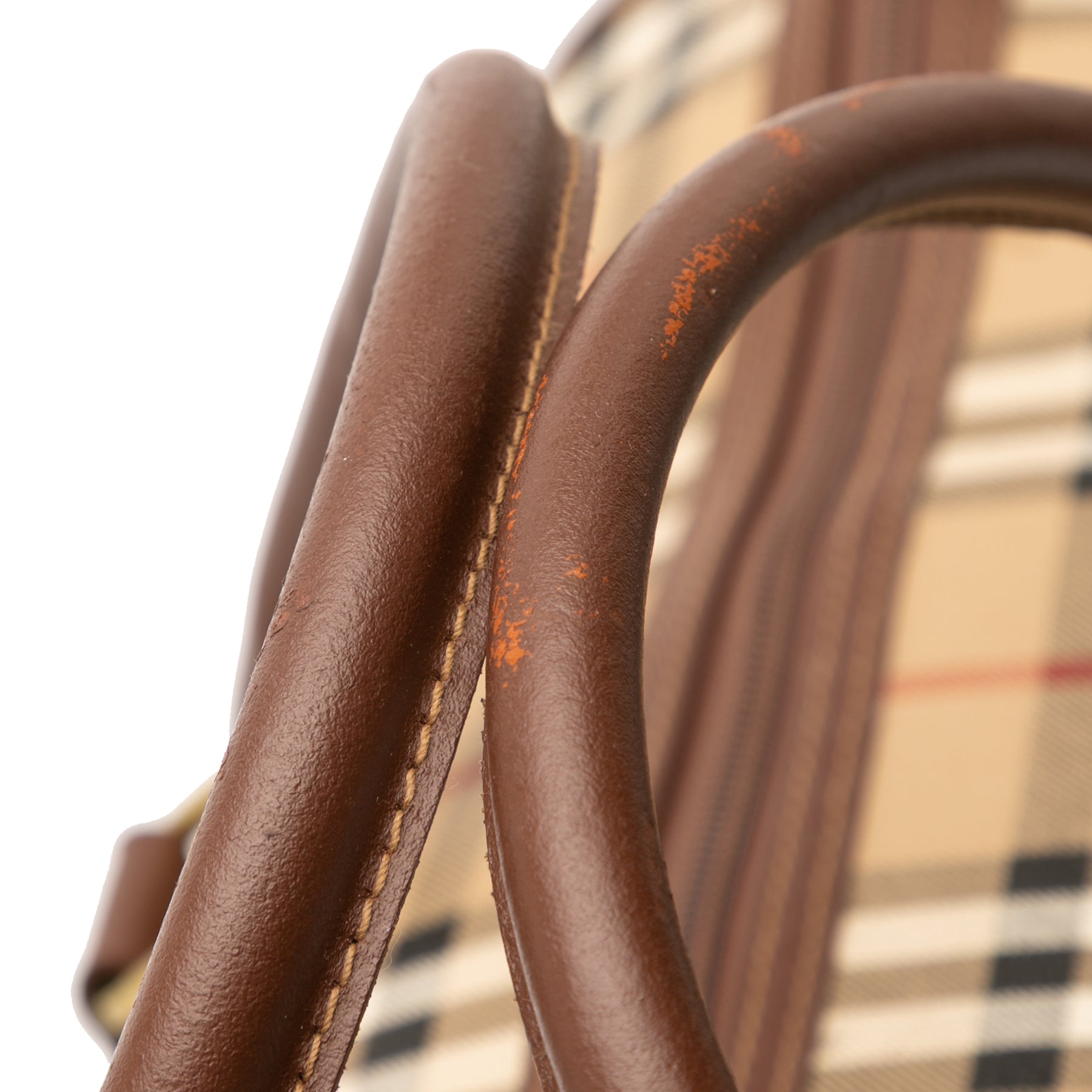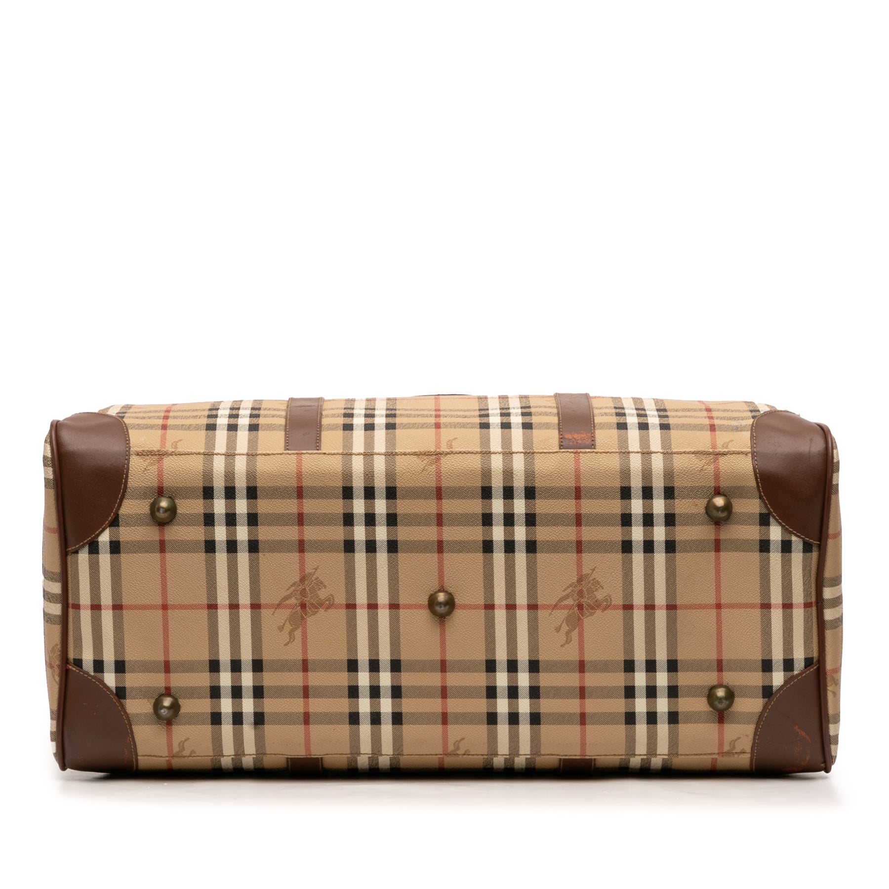 Ce sac de voyage est confectionné en toile enduite à carreaux Haymarkert avec des finitions en cuir, des poignées roulées en cuir, une fermeture zippée sur le dessus et une poche intérieure zippée. Il est en bon état.