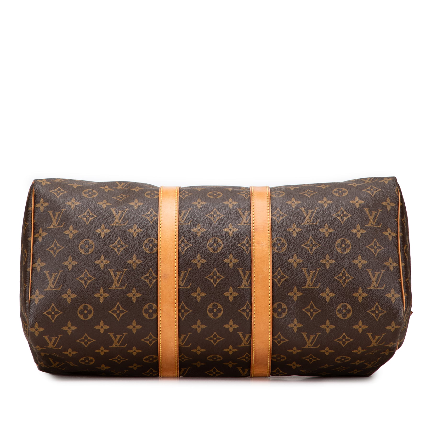 Le sac Keepall 45 est confectionné en toile monogrammée avec des finitions en cuir vachetta, des poignées roulées en cuir vachetta et une fermeture zippée sur le dessus. Il est en bon état.