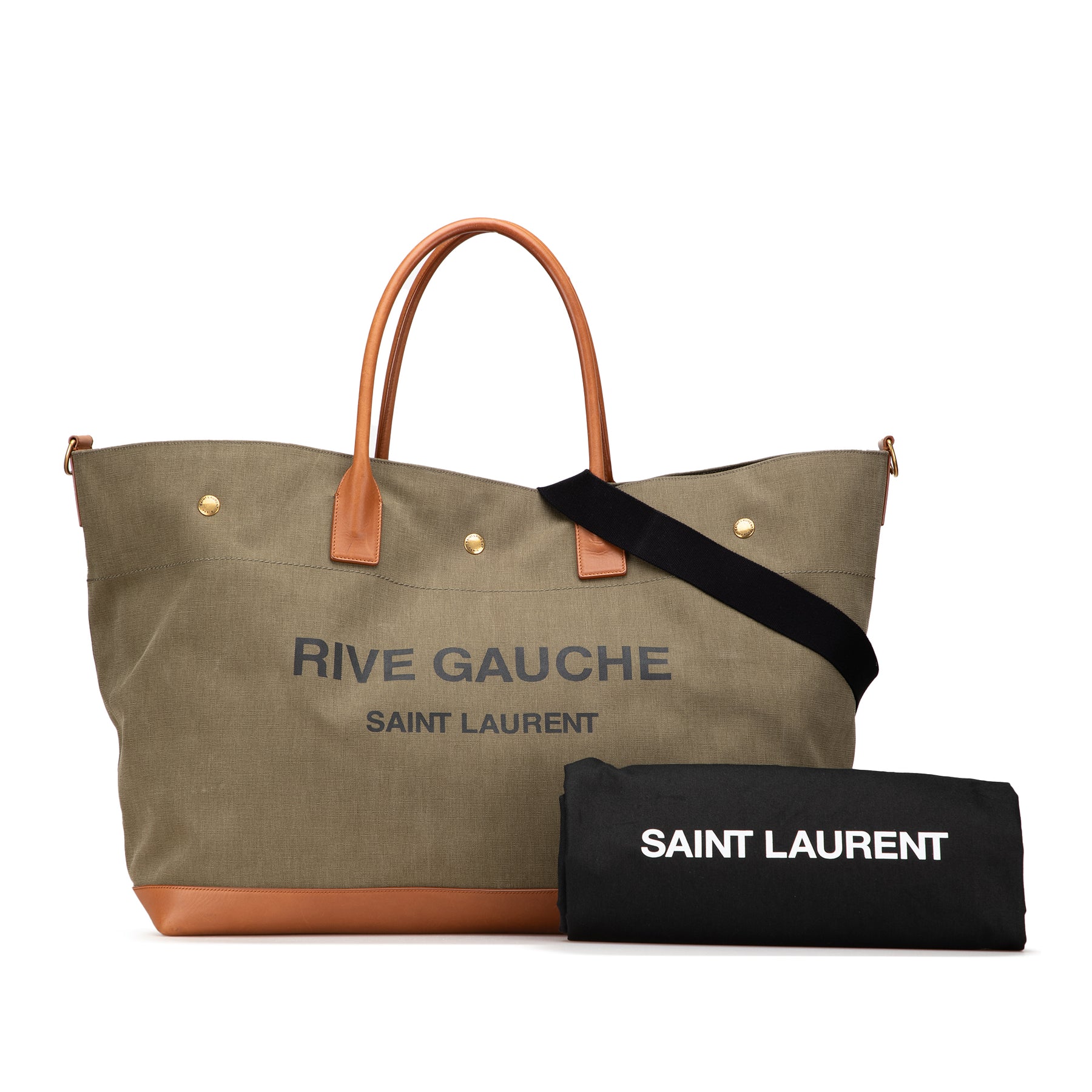 Ce sac de voyage est doté d'un corps en toile avec des finitions en cuir, de poignées en cuir roulées, d'une bandoulière amovible, de fermetures à pression sur le dessus et d'une poche intérieure zippée. Il est en bon état.