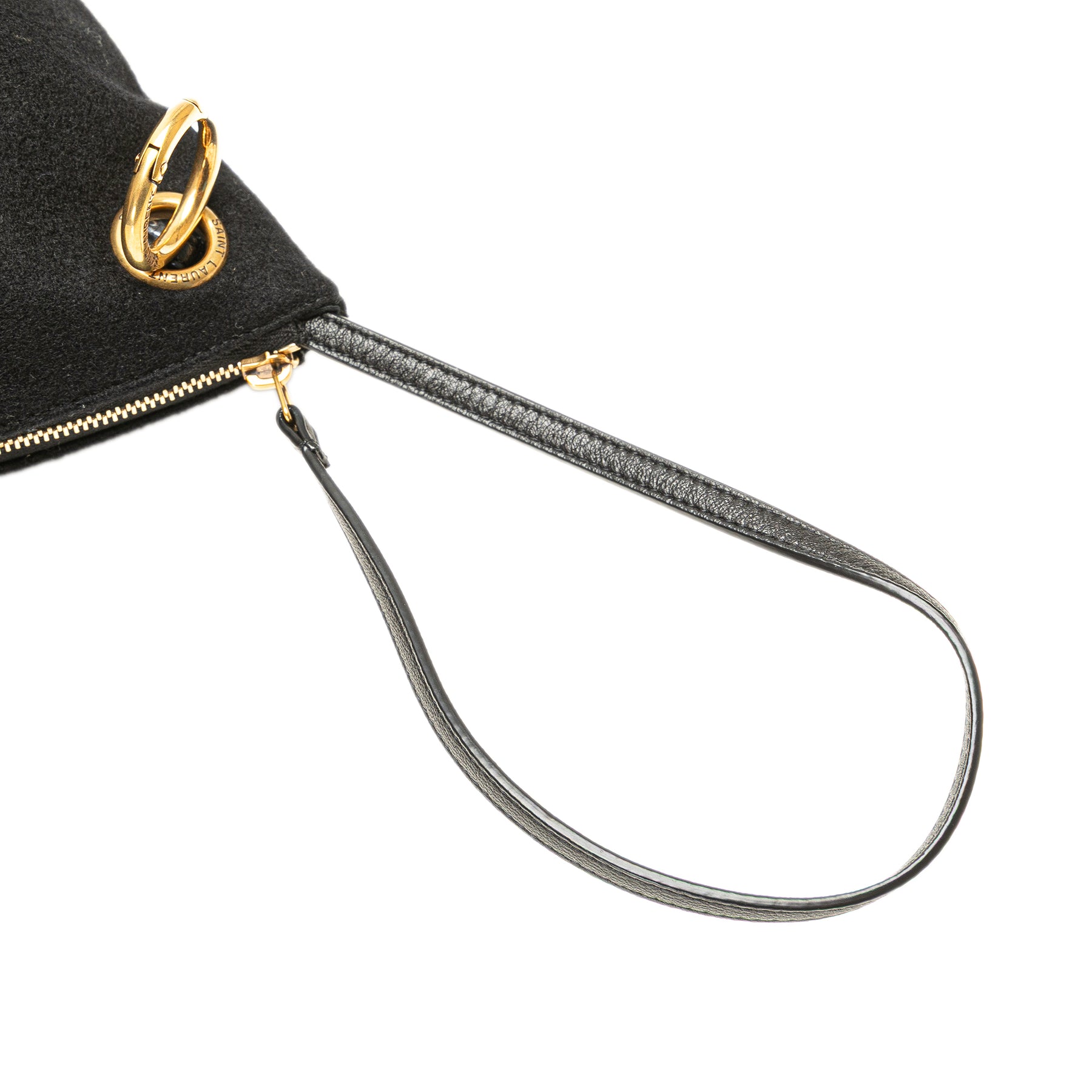 Cette pochette est dotée d'un corps en laine, d'une dragonne plate en cuir, d'une fermeture zippée sur le dessus et d'une poche intérieure. Elle est en excellent état.