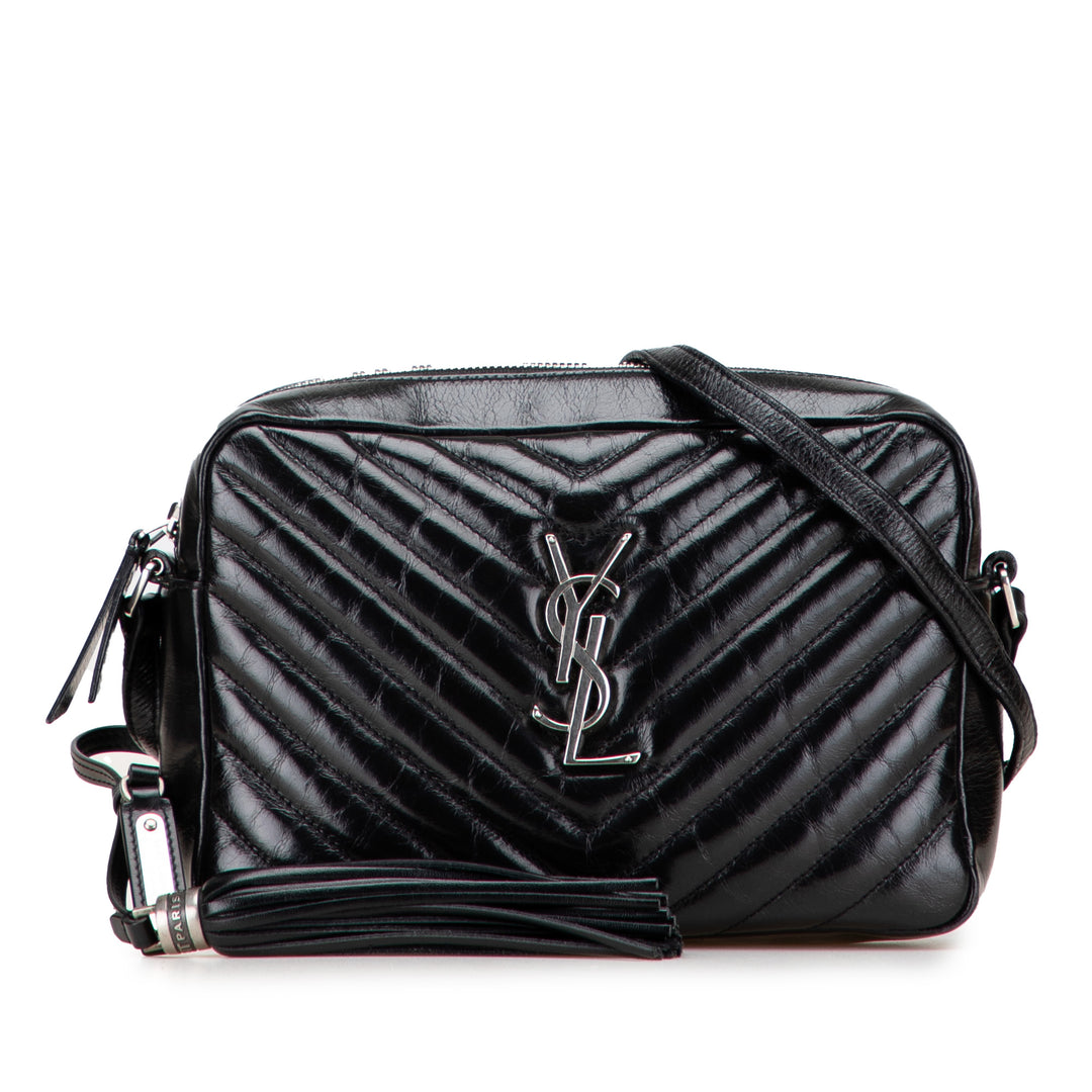 Saint Laurent Cracked Shiny Cuir de veau Matelasse Tassel Monogram Lou Sac caméra Noir