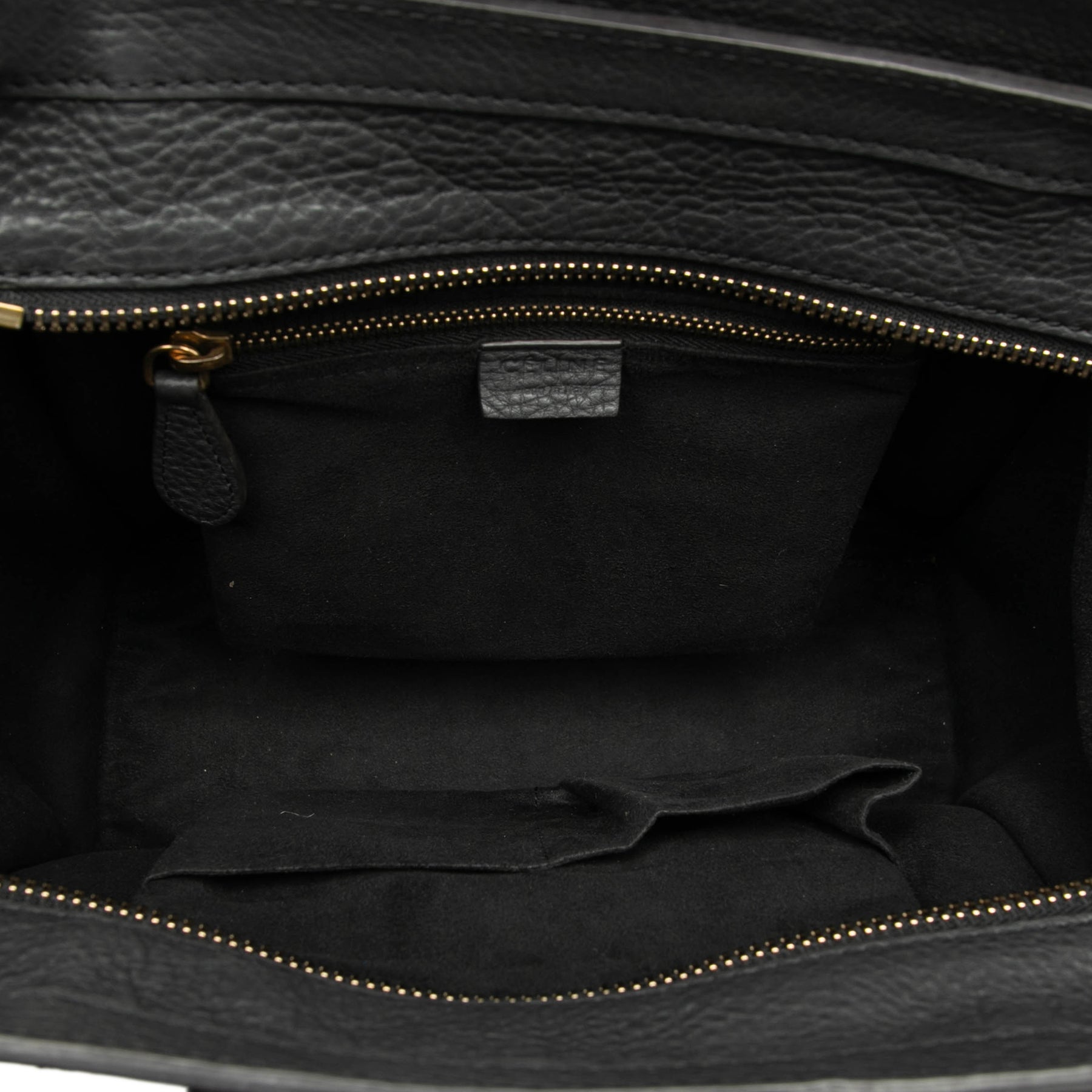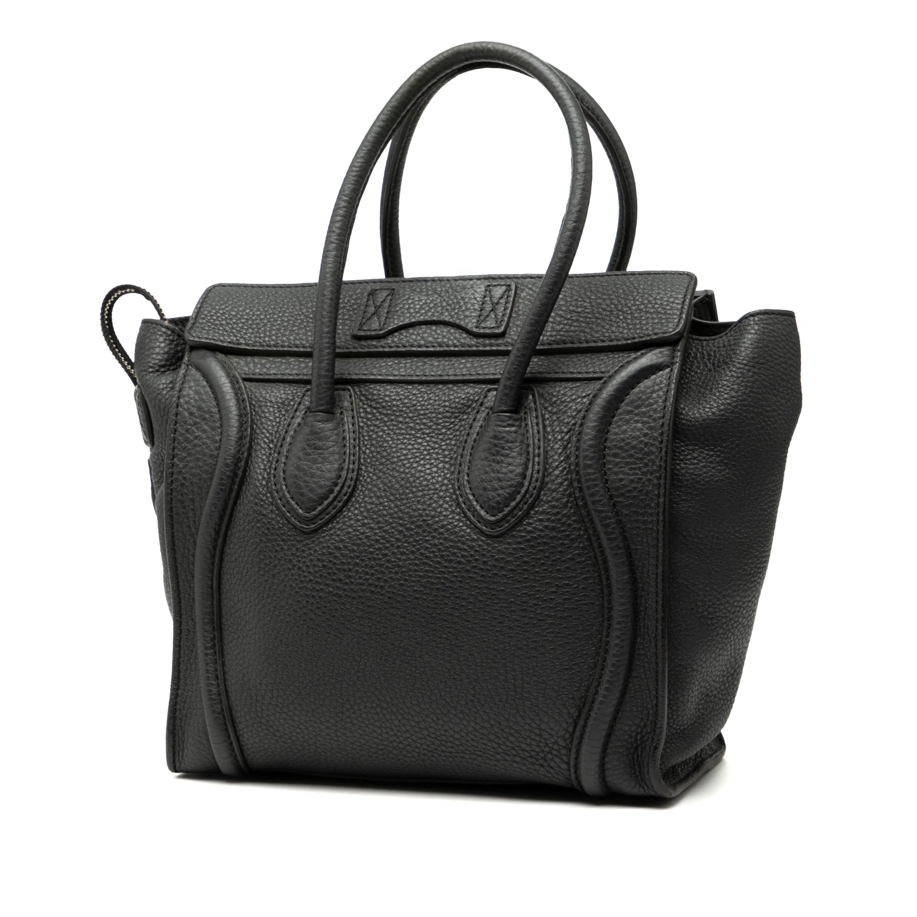 Le sac Micro Luggage Tote est confectionné en cuir de veau grainé, possède des anses en cuir roulé, une fermeture zippée sur le dessus, une poche extérieure zippée à l'avant et des poches intérieures zippées et plaquées. Il est en bon état.