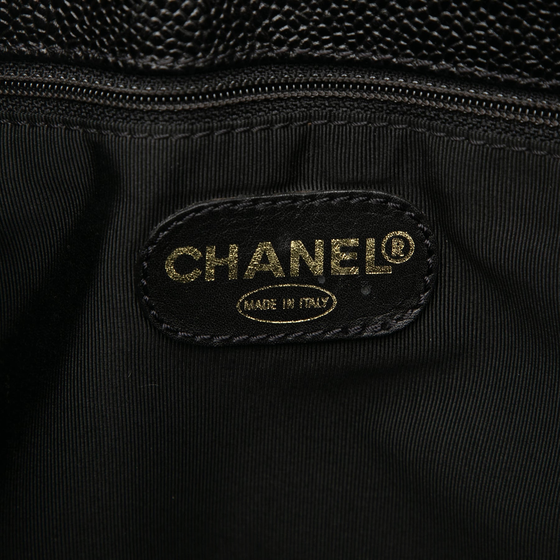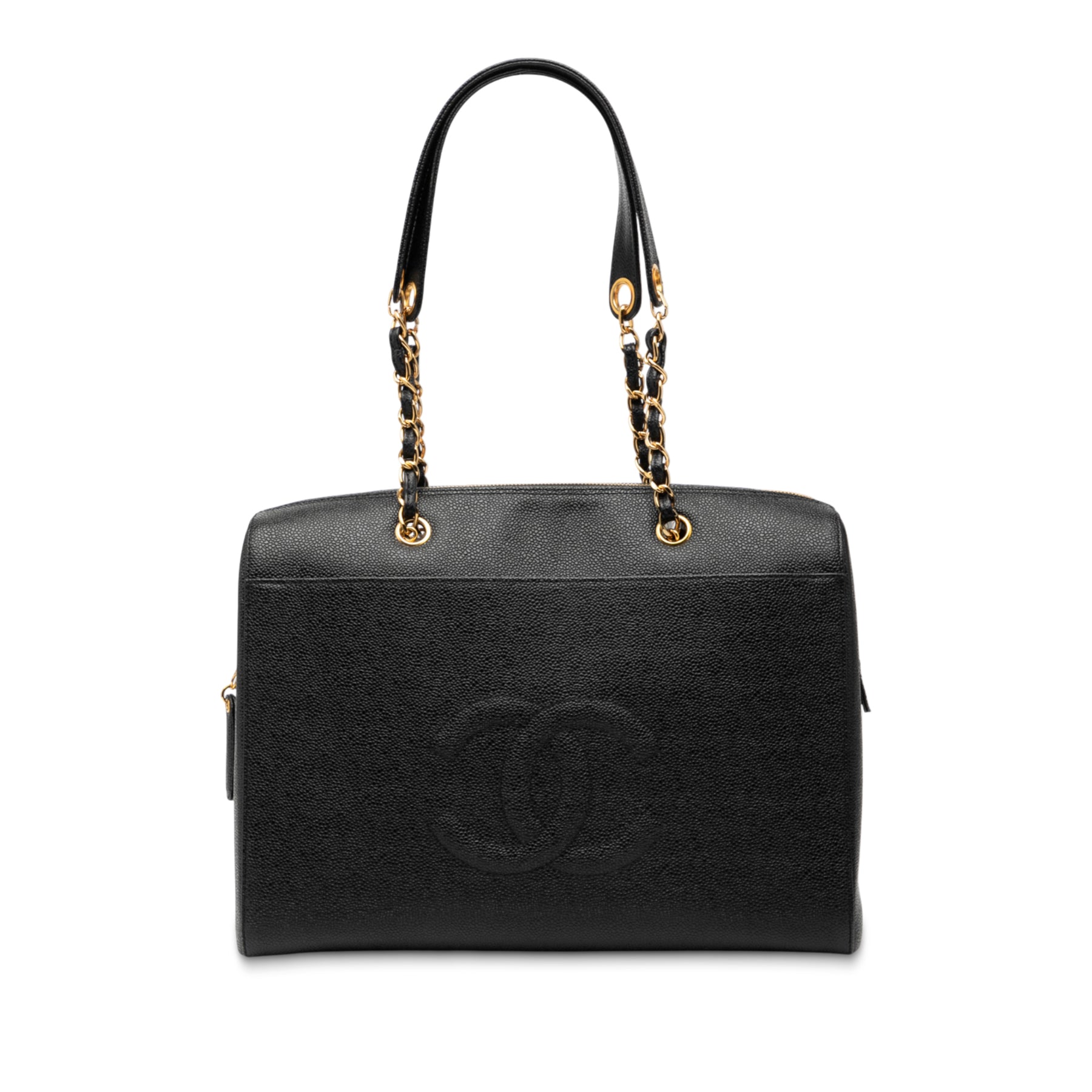Ce sac cabas est en cuir caviar, avec des anses en chaîne tressée et cuir renforcées, une fermeture zippée sur le dessus, des poches extérieures zippées et plaquées, ainsi que des poches intérieures zippées. Il est en bon état.