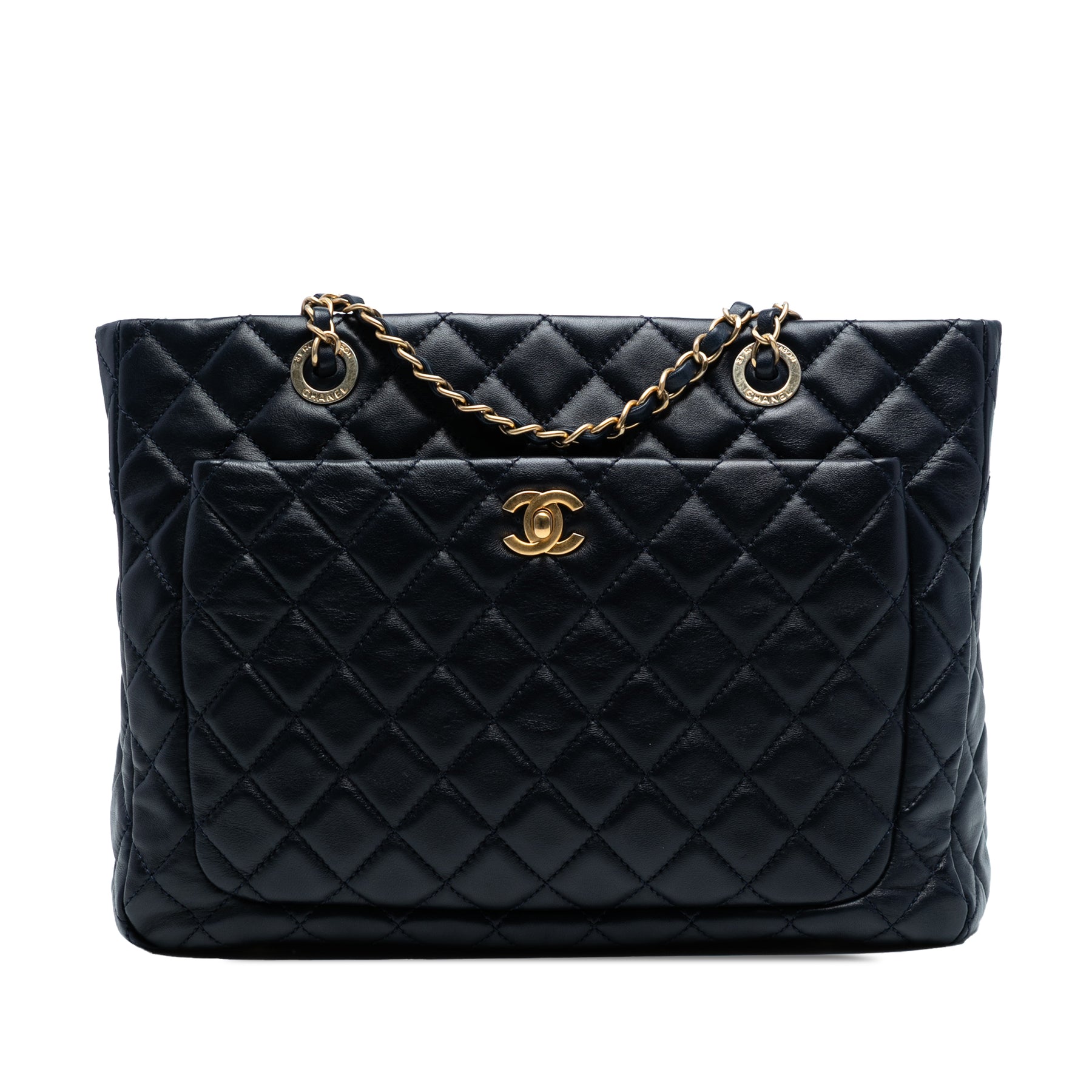 Ce sac cabas est en cuir matelassé, avec des anses en chaîne tressée, une ouverture sur le dessus, un compartiment extérieur avant avec fermeture à fermoir CC et des poches intérieures zippées. Il est en excellent état.