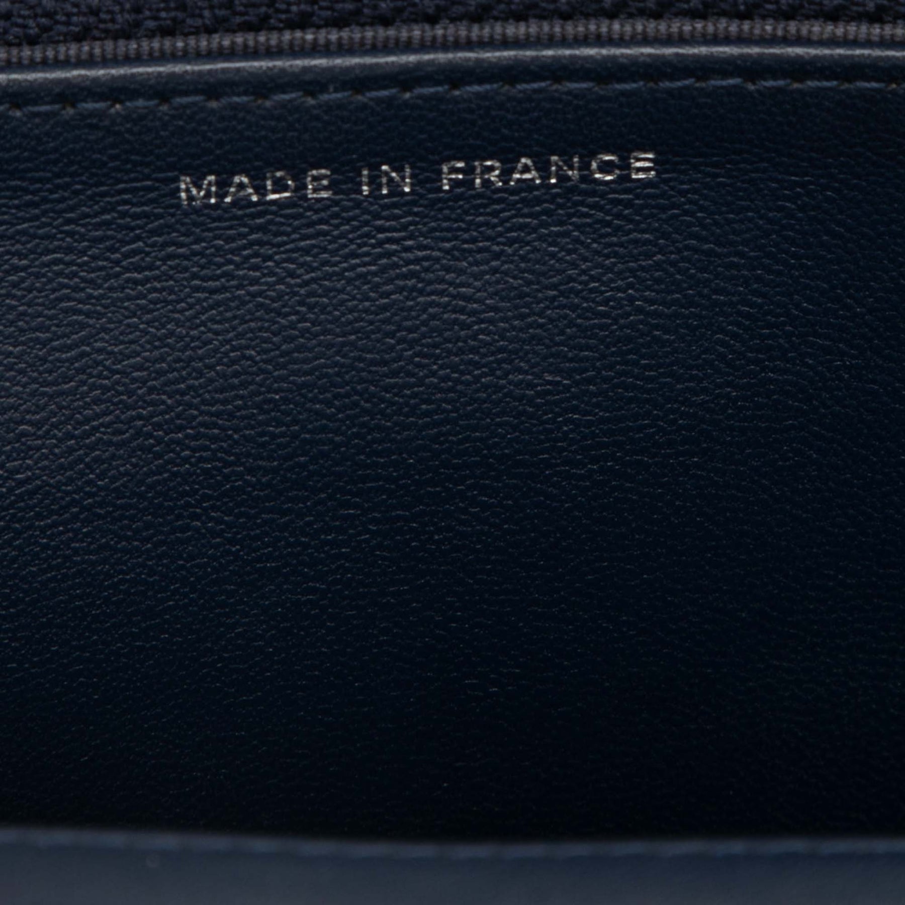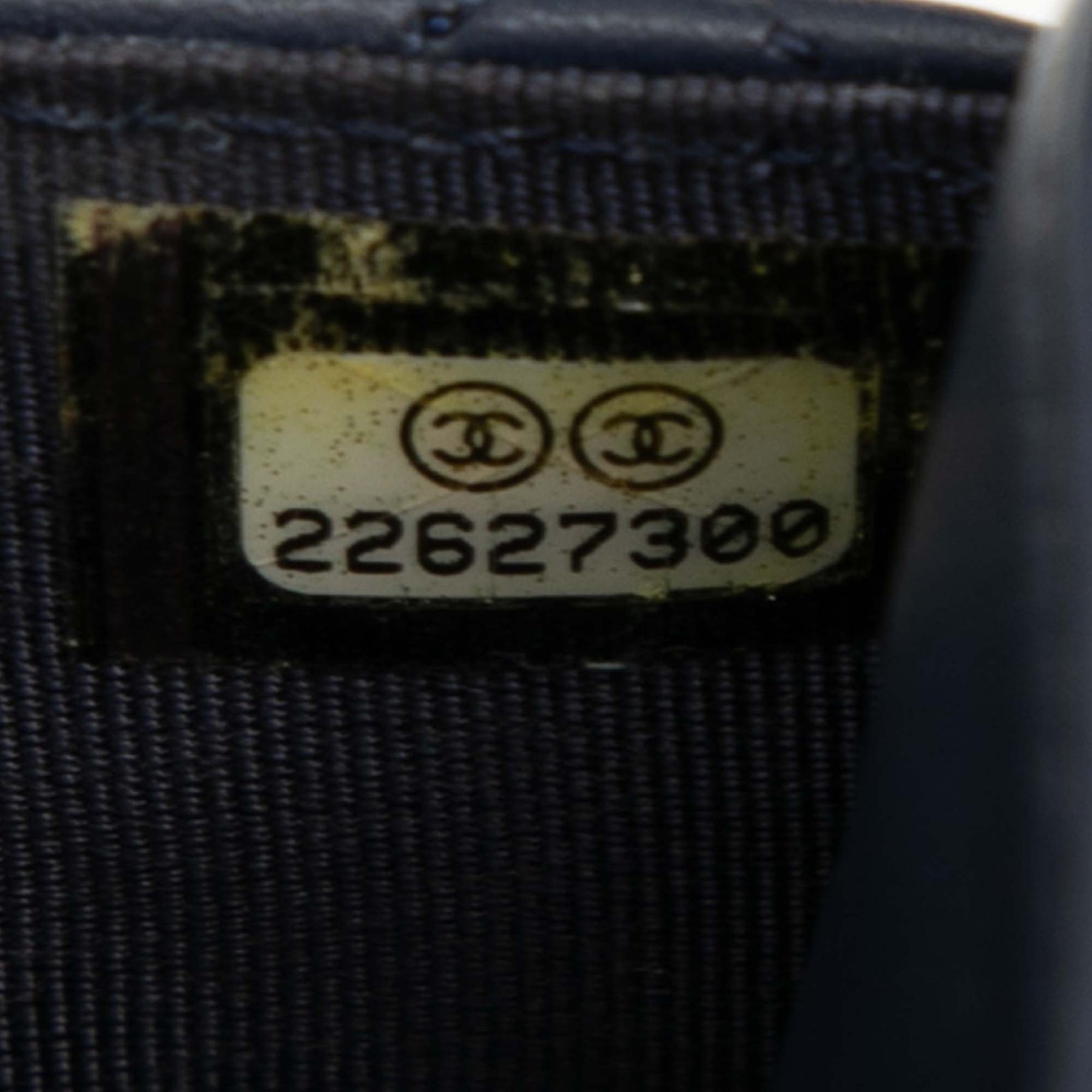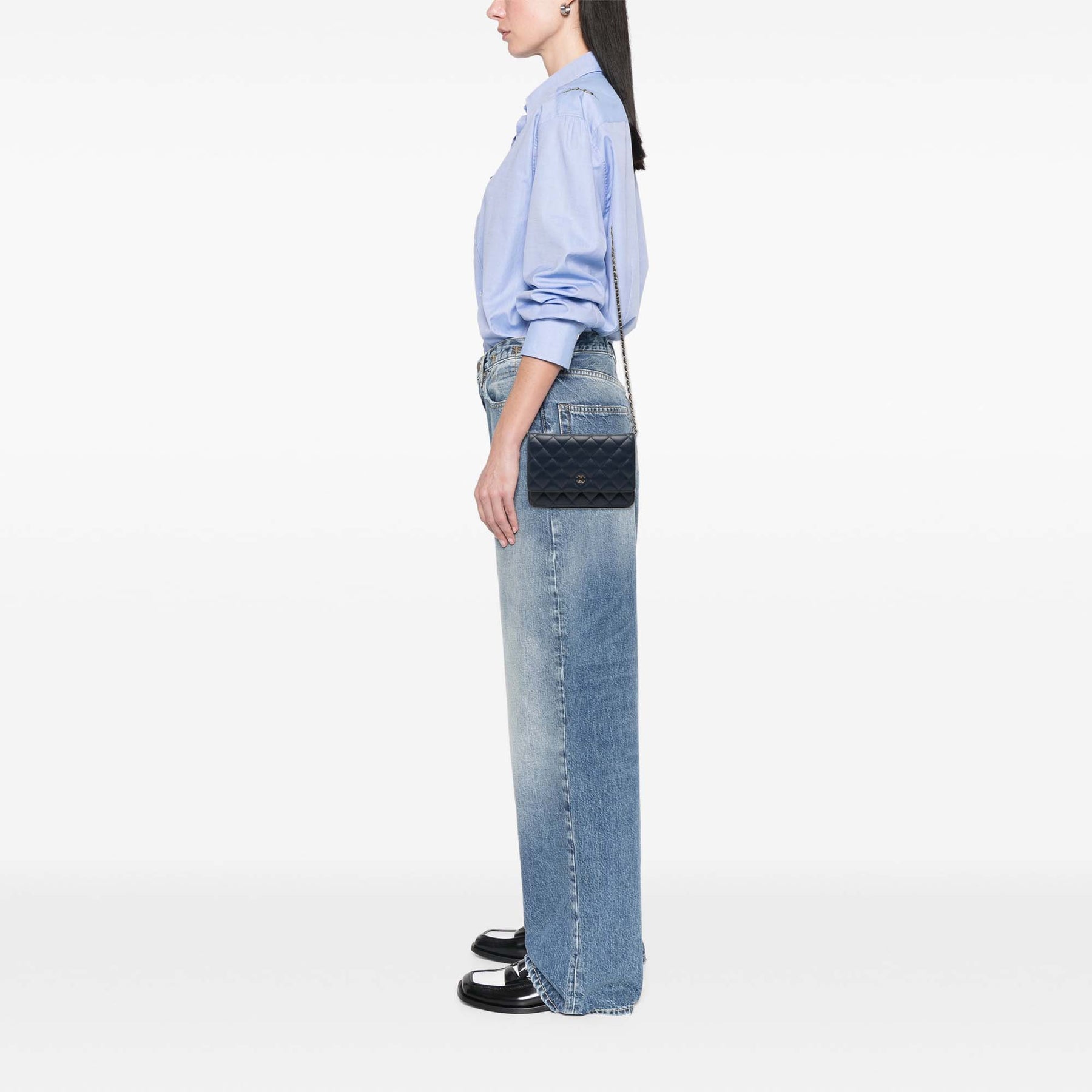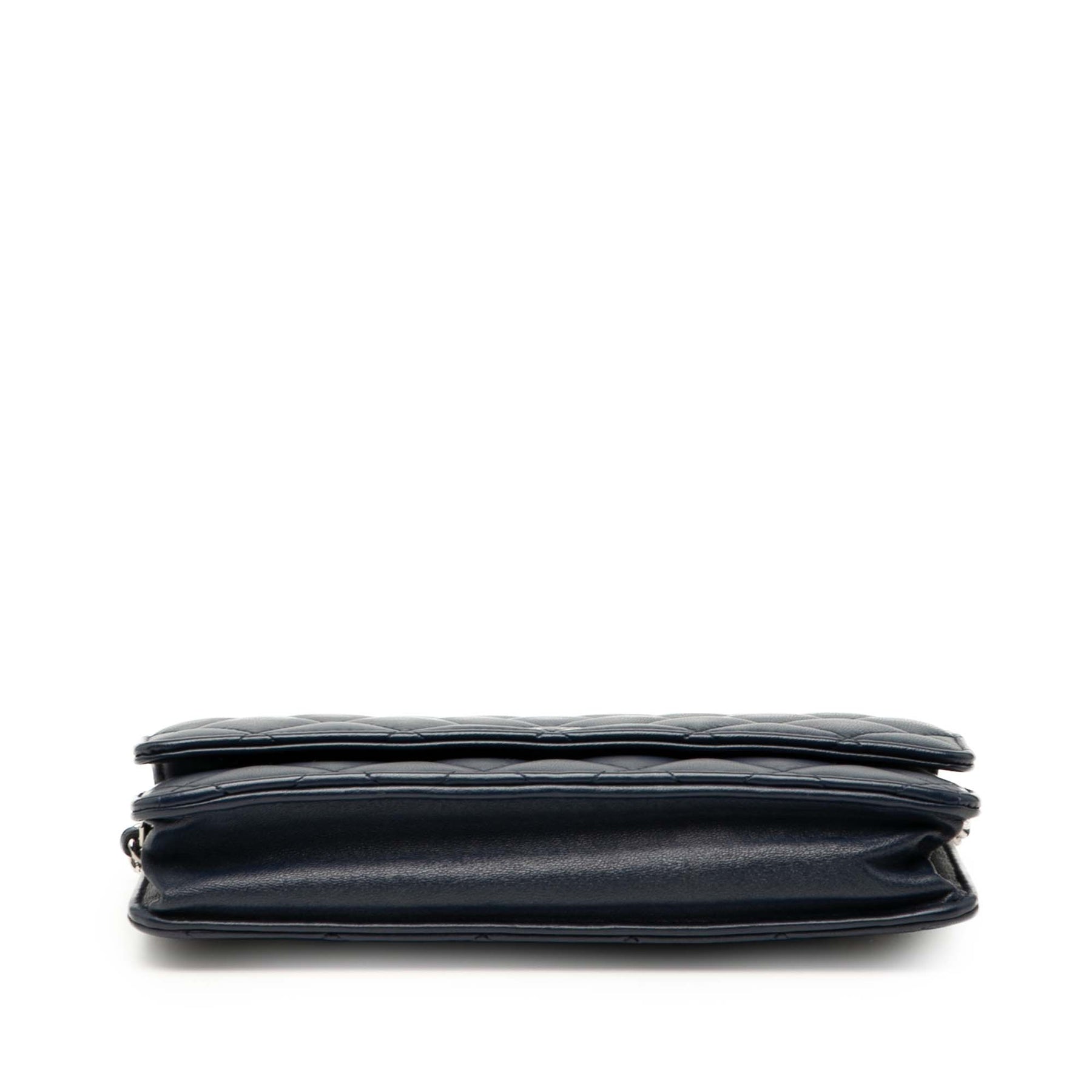 Ce portefeuille à bandoulière chaîne est confectionné en cuir d'agneau matelassé et possède une bandoulière chaîne en cuir tressé, un rabat avant à fermeture magnétique, une poche plaquée extérieure au dos, un compartiment intérieur zippé, ainsi que des poches intérieures zippées et plaquées. Il est en bon état.