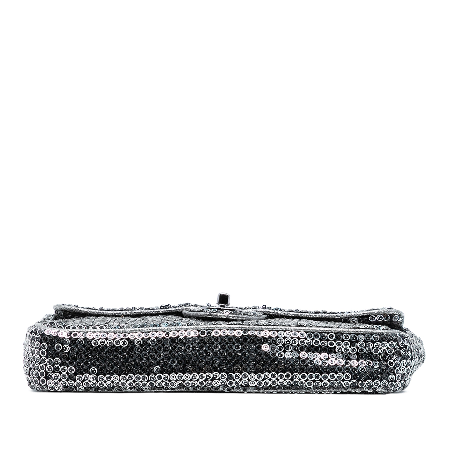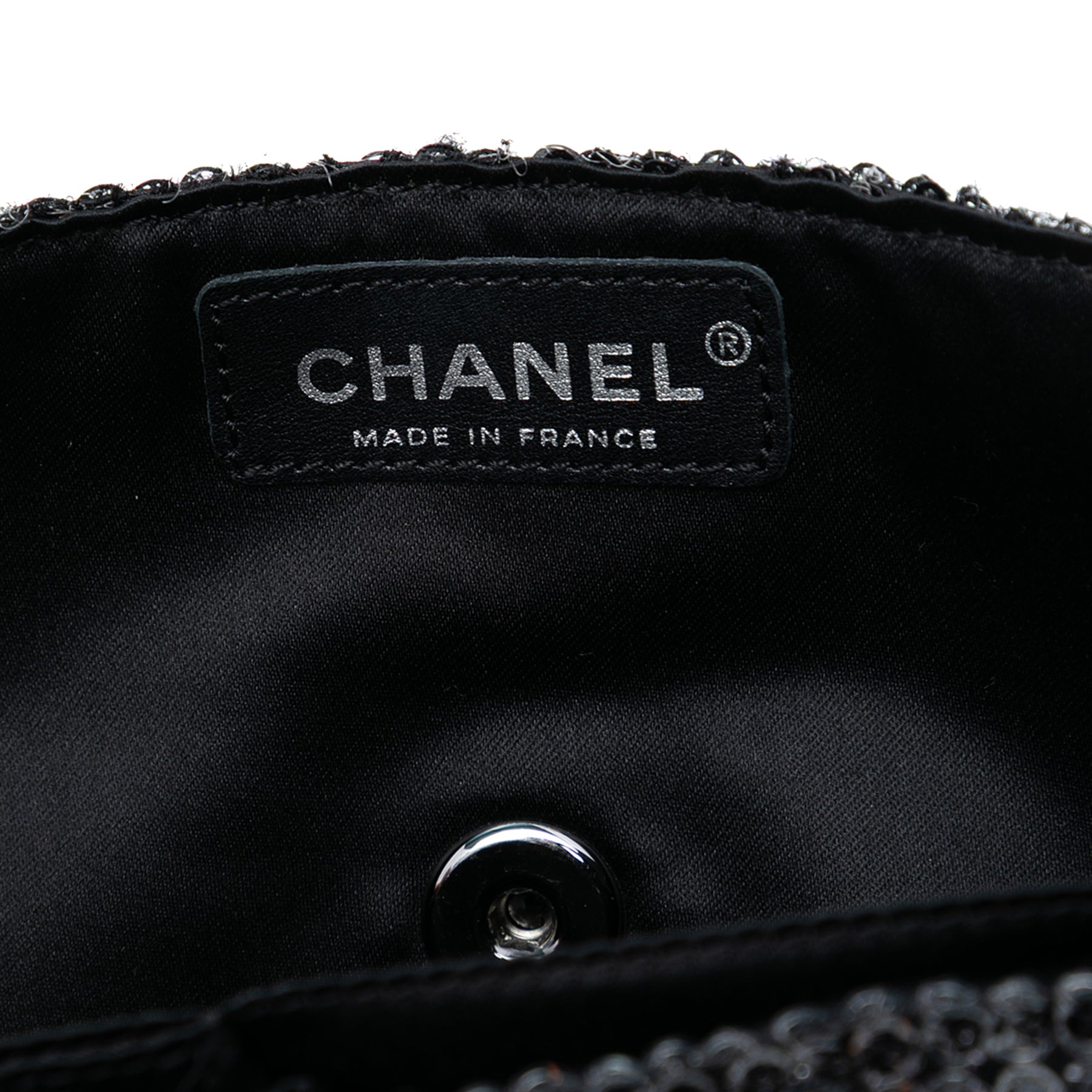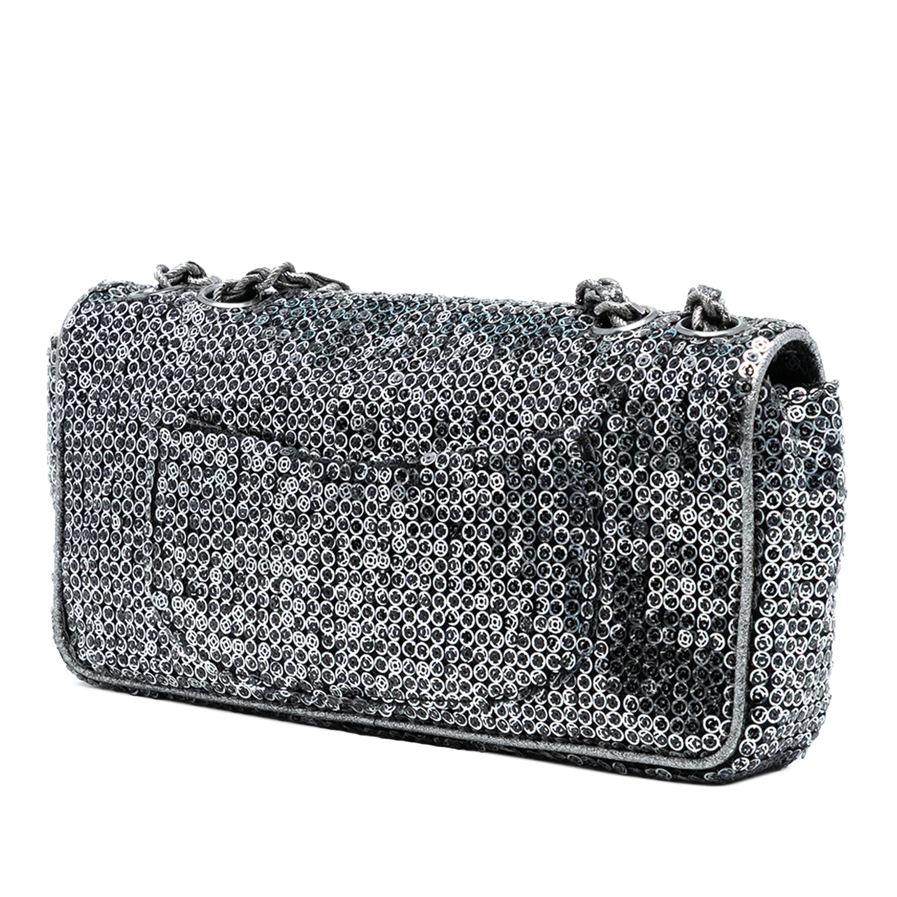 Ce sac bandoulière est orné de sequins, possède une bandoulière en chaîne argentée tressée, un rabat avant avec fermoir CC, une poche plaquée extérieure au dos et des poches plaquées intérieures. Il est en excellent état.
