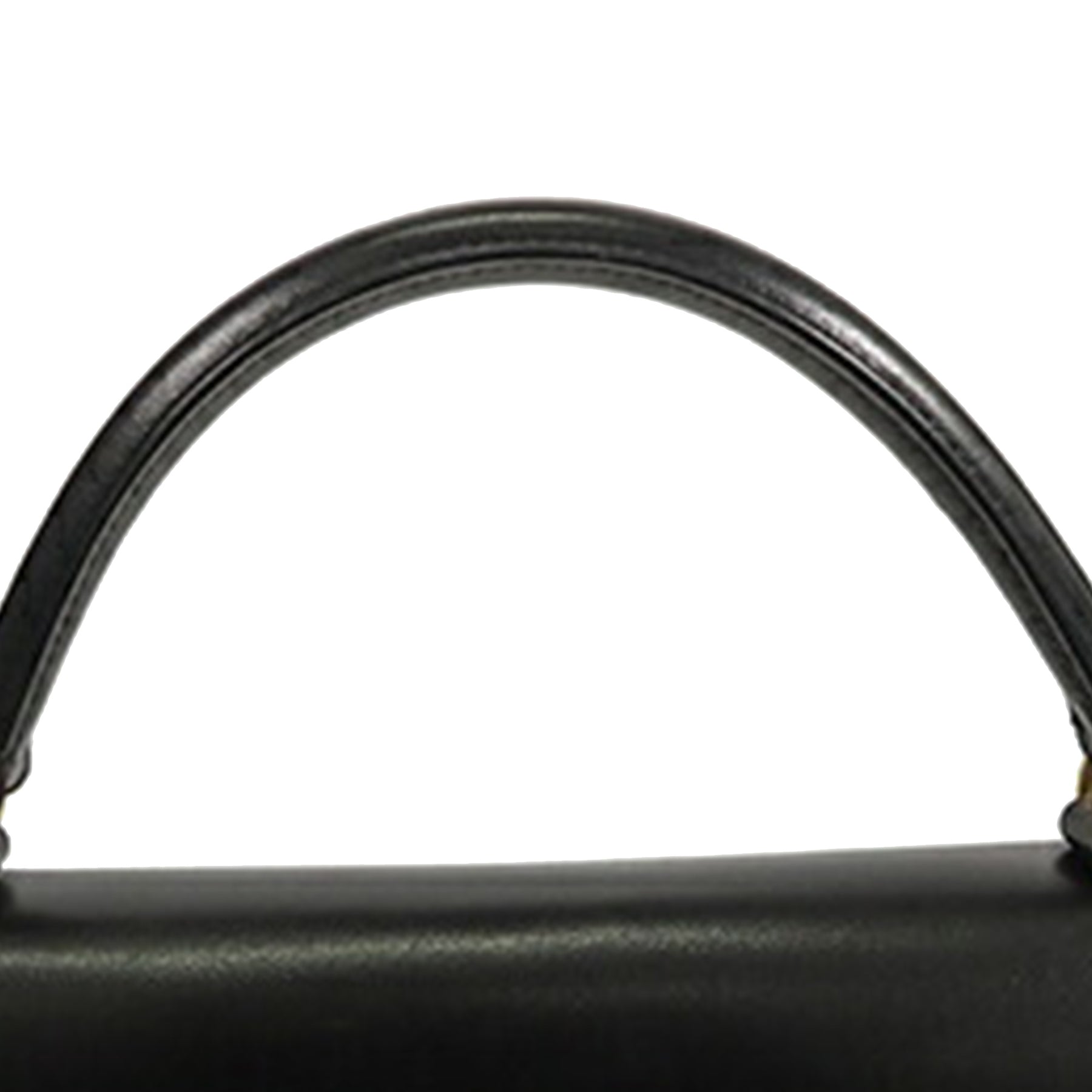 Le sac Kelly 32 Box est en cuir et possède une poignée plate, un rabat avant avec fermeture à tourniquet, ainsi que des poches intérieures zippées et plaquées. Il est en bon état.