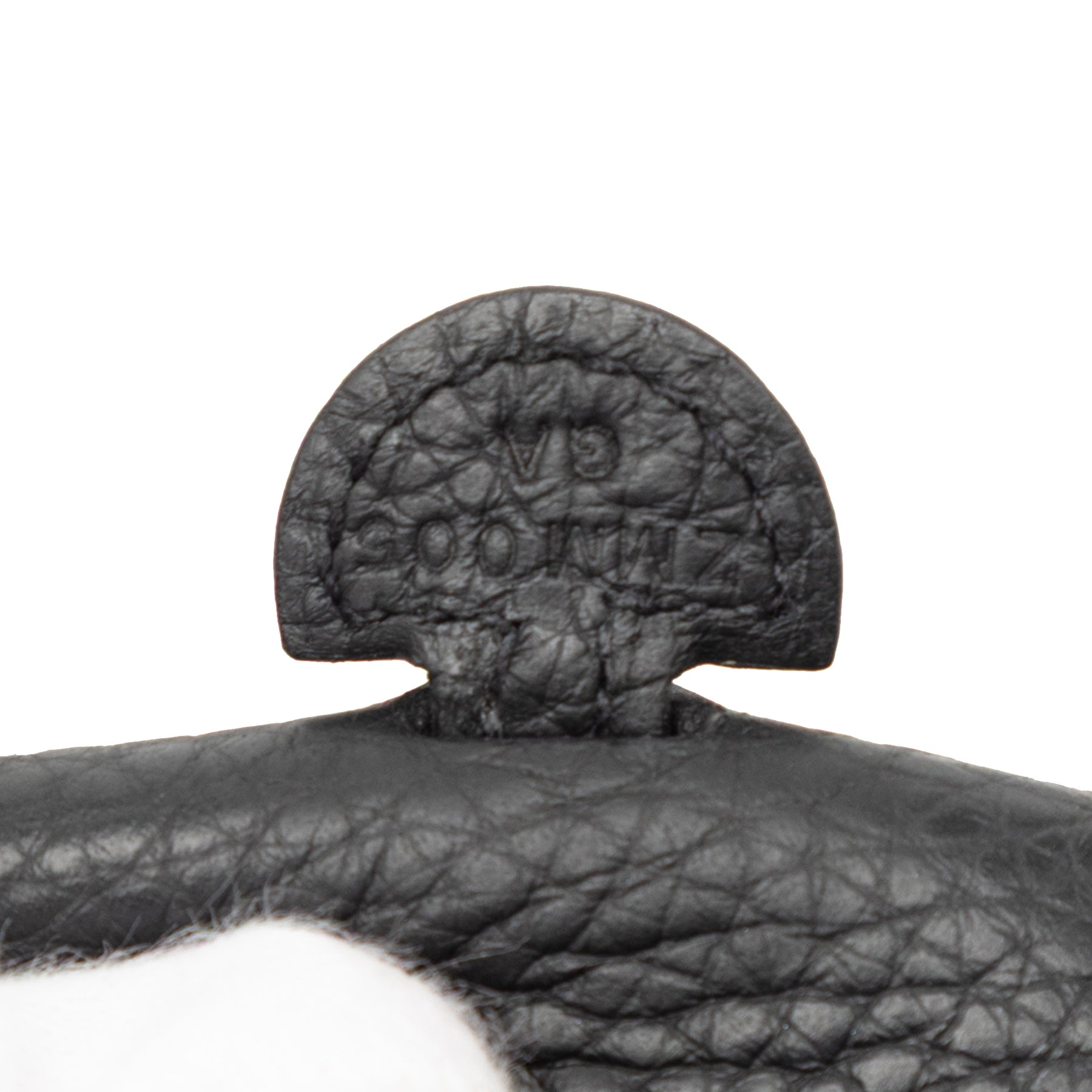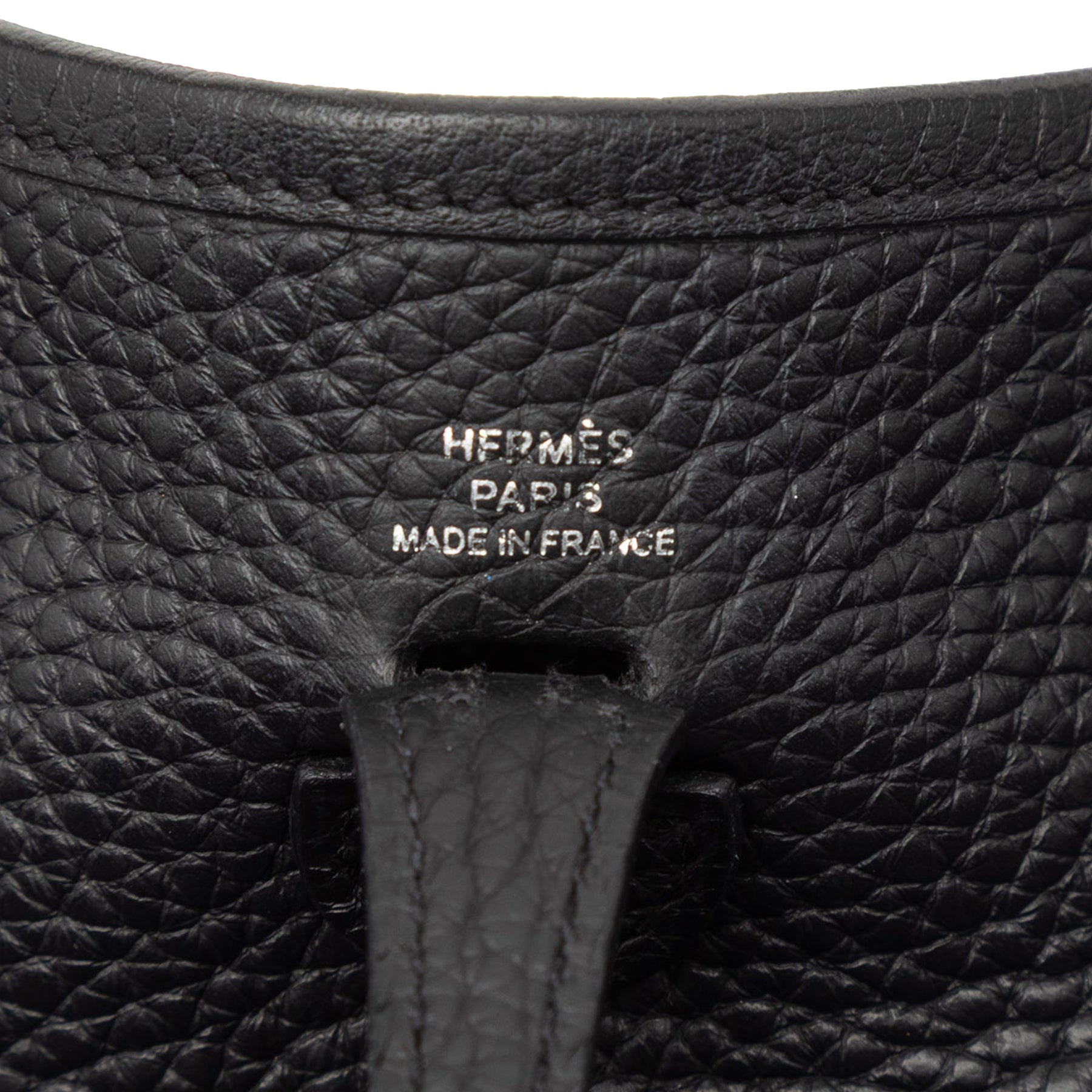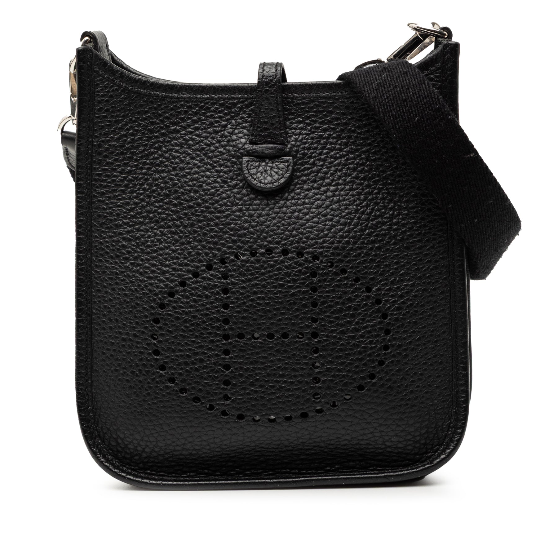 Le sac Evelyne TPM est doté d'un boîtier en cuir Clémence noir, d'une bandoulière plate amovible en toile et d'une fermeture à sangle sur le dessus. Il est en excellent état.