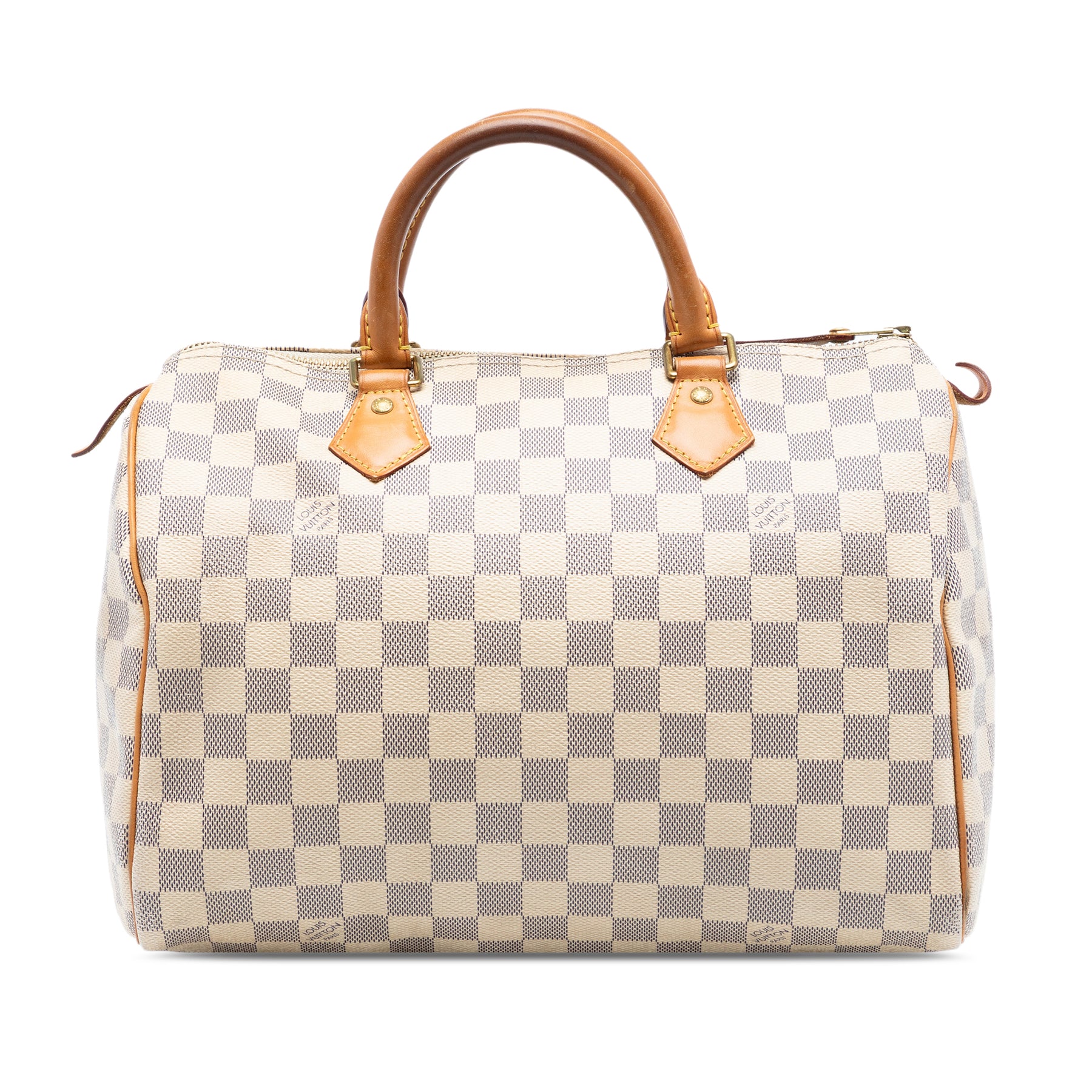Le Speedy 30 est confectionné en toile Damier Azur avec des finitions en cuir vachetta, des anses roulées en cuir vachetta, une fermeture zippée sur le dessus et une poche intérieure. Il est en bon état.