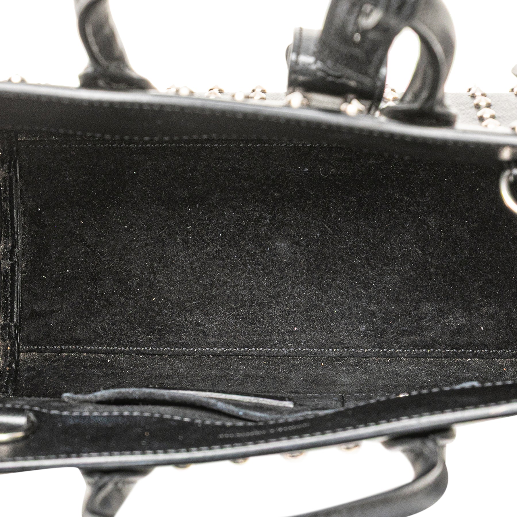 Le cartable Nano Sac De Jour est doté d'un corps en cuir clouté, de poignées en cuir roulées, d'une bandoulière plate amovible en cuir, d'un dessus ouvert et d'une poche intérieure. Il est en bon état.