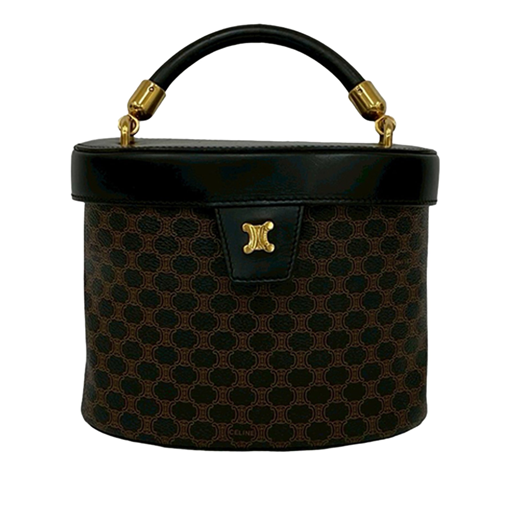Ce sac vanity est confectionné en toile enduite avec des finitions en cuir, une poignée supérieure roulée en cuir, un rabat à fermeture magnétique et une poche intérieure plaquée. Il est en bon état.