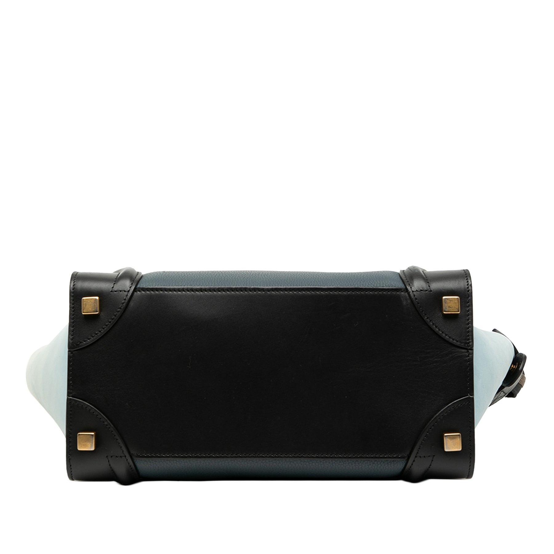 Le sac Micro Luggage Tote est confectionné en cuir avec des empiècements latéraux en nubuck, des poignées roulées en cuir, une bandoulière plate amovible en cuir, une fermeture zippée sur le dessus, une poche extérieure zippée à l'avant et des poches intérieures plaquées. Il est en bon état.