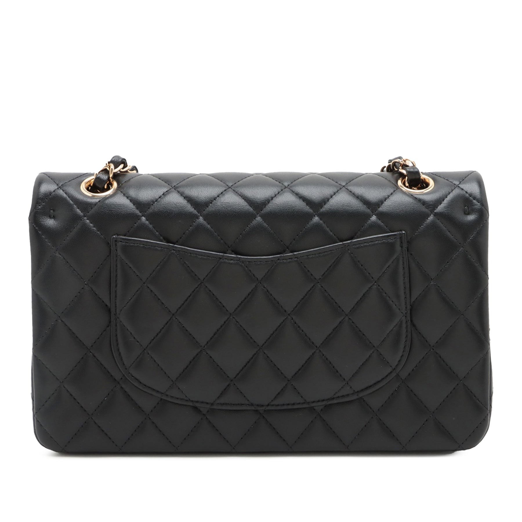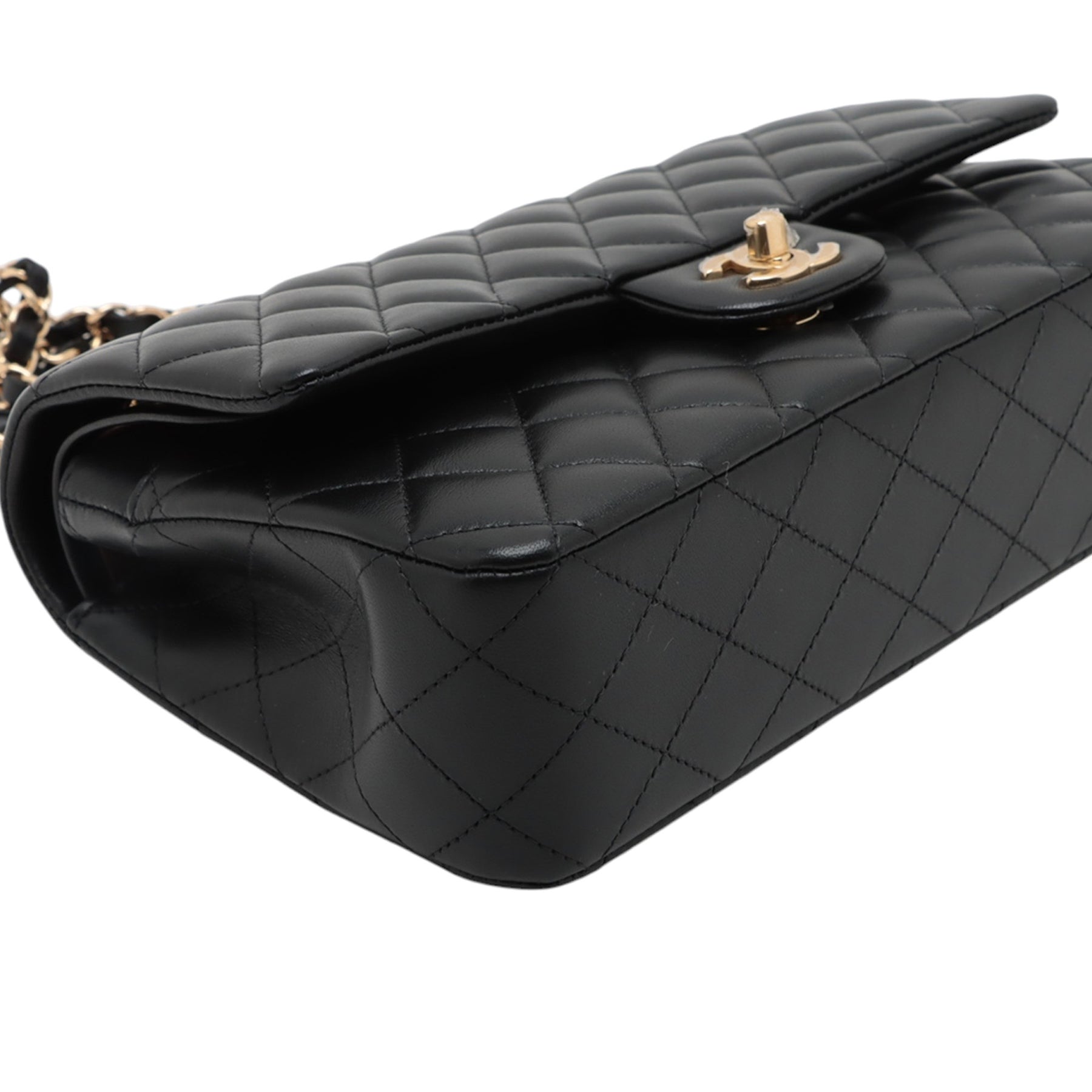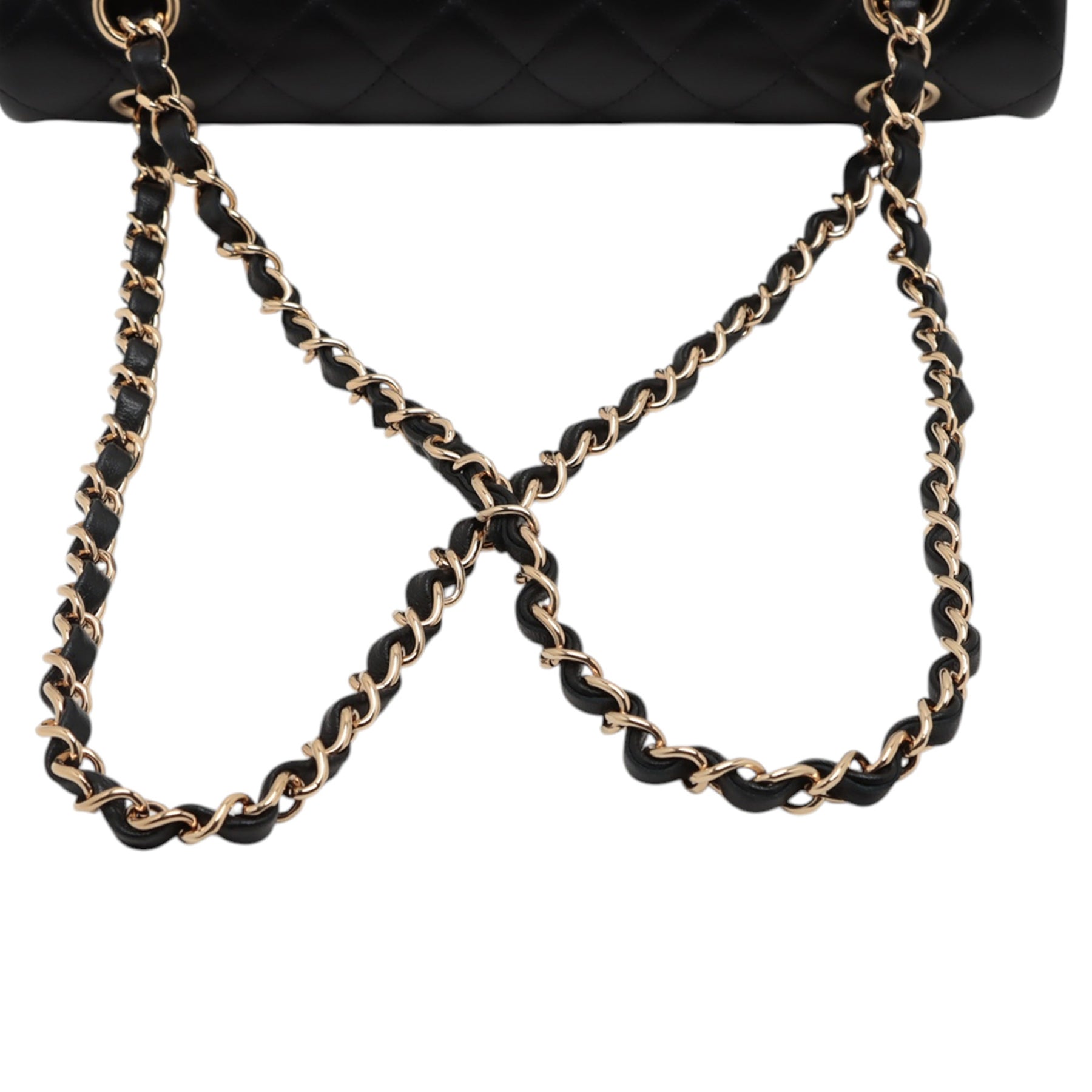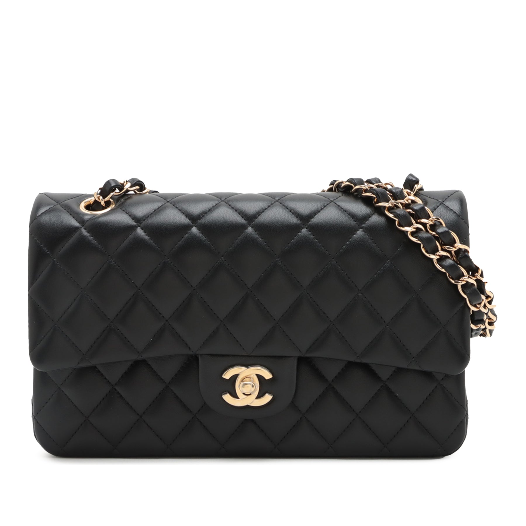 Ce sac bandoulière est confectionné en cuir d'agneau matelassé et présente des bandoulières en chaîne tressée de cuir, un double rabat avant orné du double C entrelacé et d'une fermeture à tourniquet, une poche plaquée extérieure au dos et des poches plaquées intérieures. Il est en excellent état.