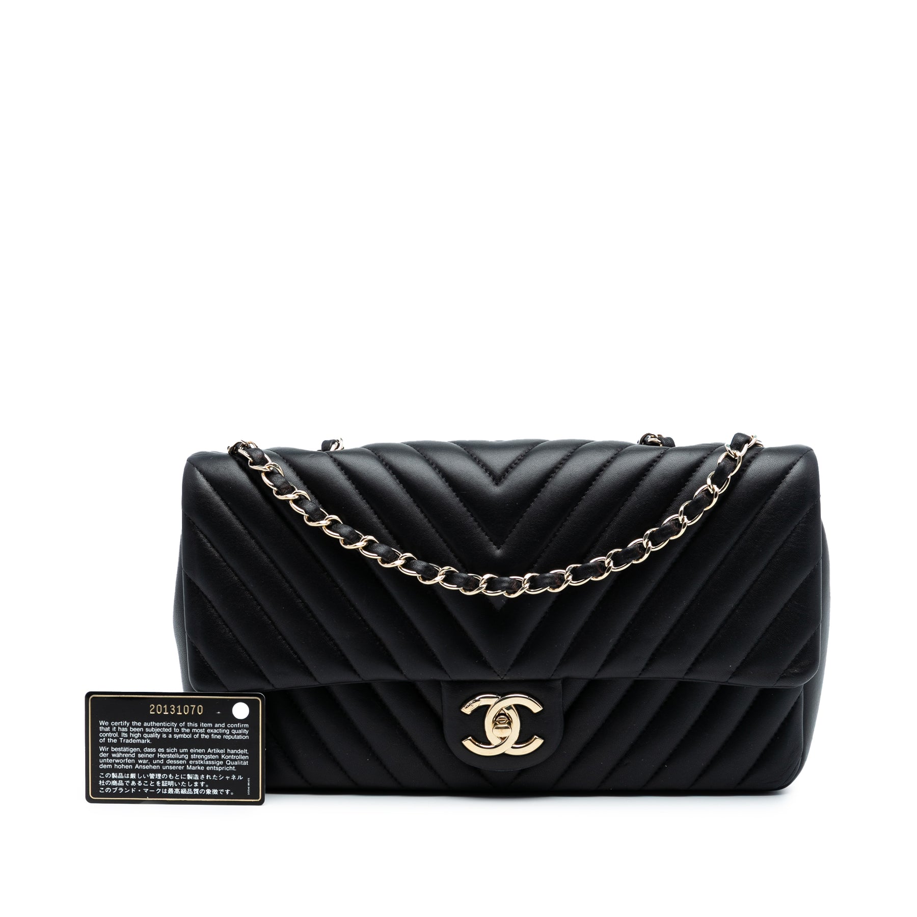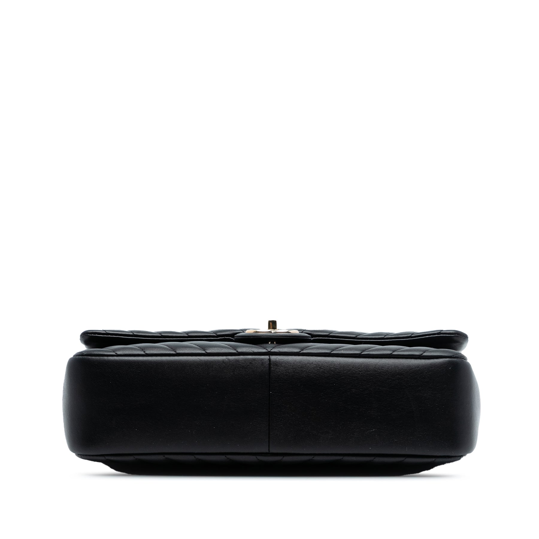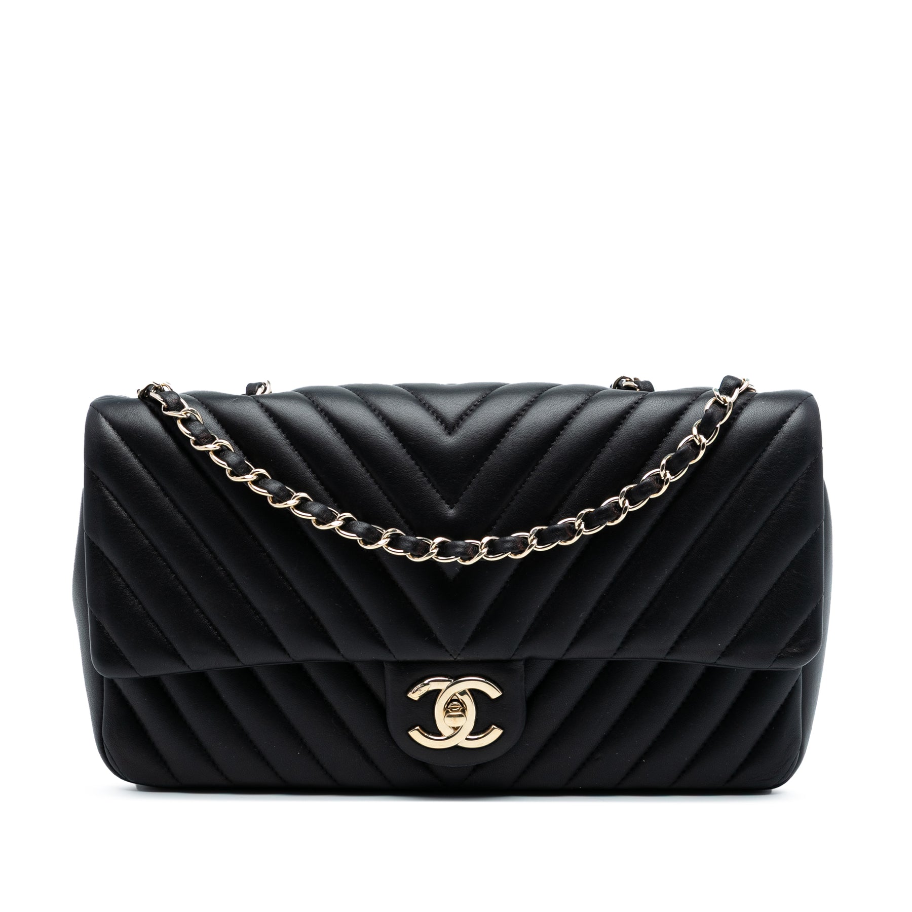 Ce sac bandoulière est confectionné en cuir d'agneau matelassé, possède une bandoulière en chaîne tressée de cuir, un rabat avant avec fermoir CC et des poches intérieures zippées et plaquées. Il est en excellent état.