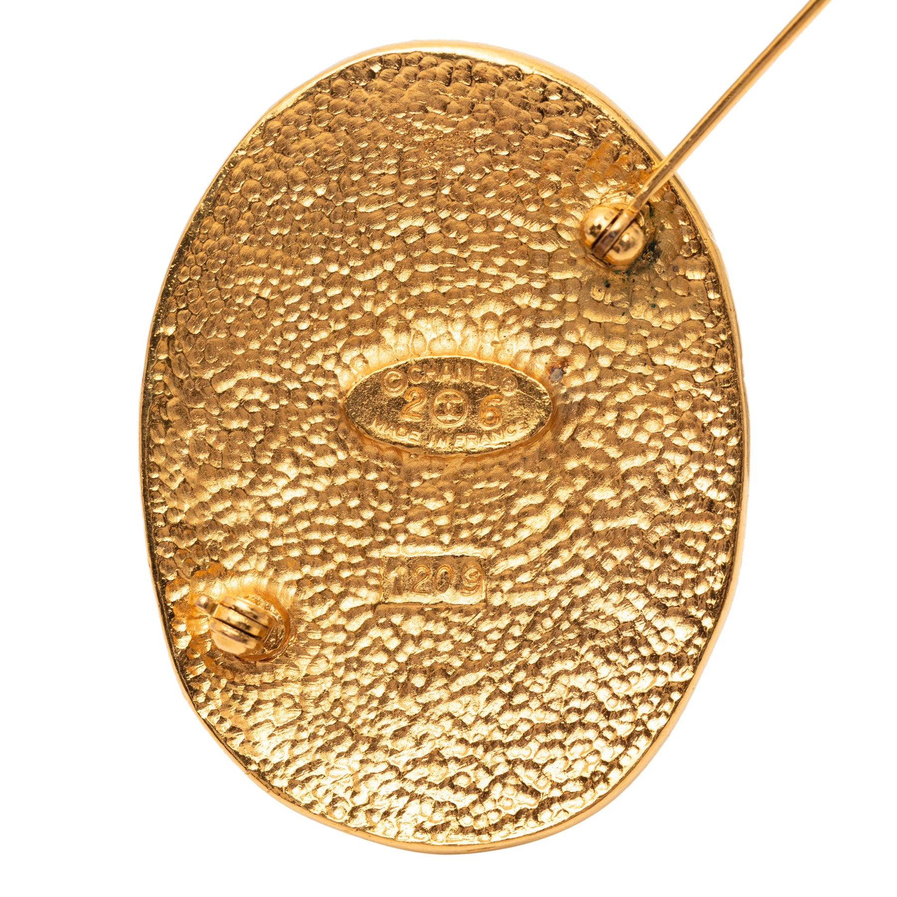 Cette broche est en métal doré et se ferme par une épingle au dos. Elle est en bon état.