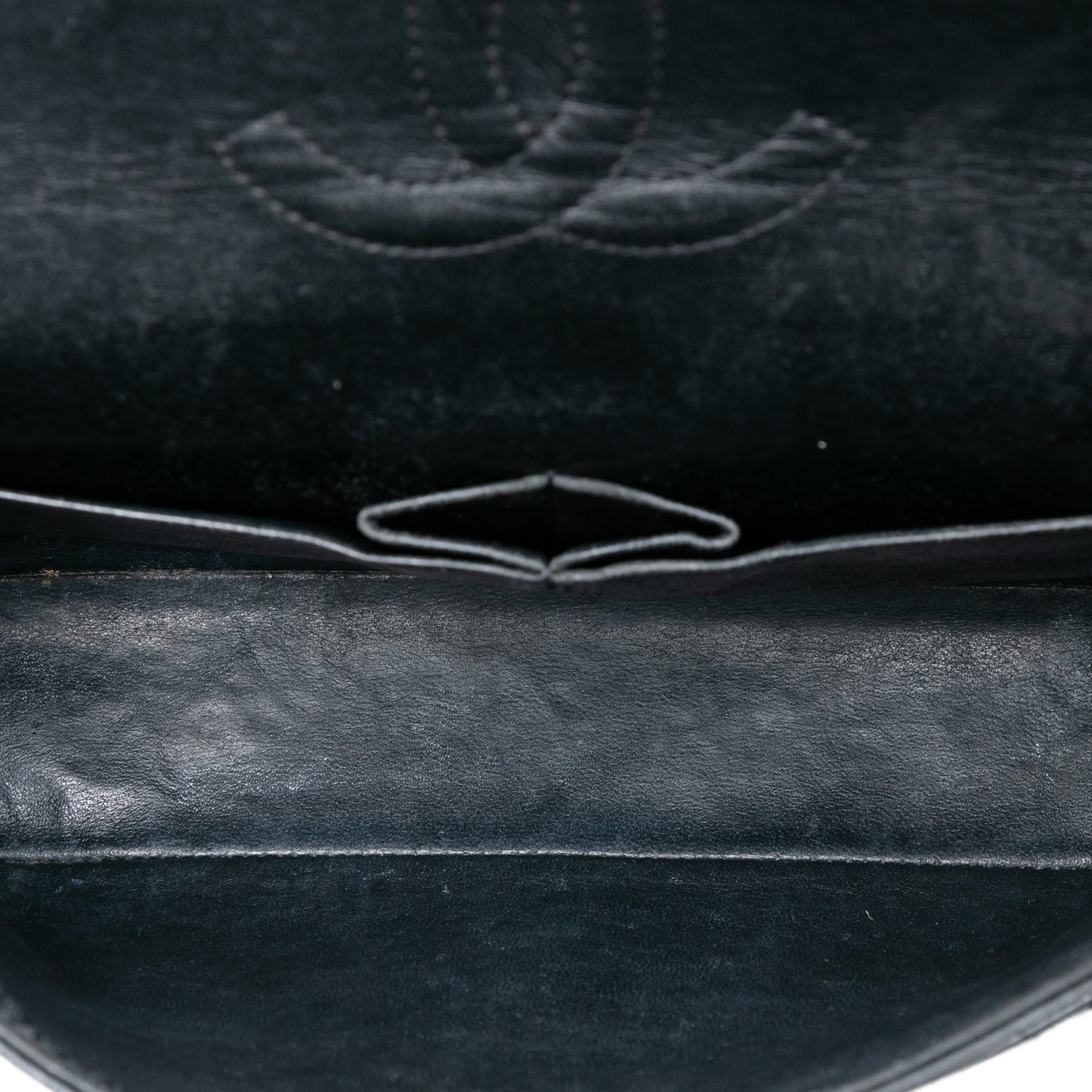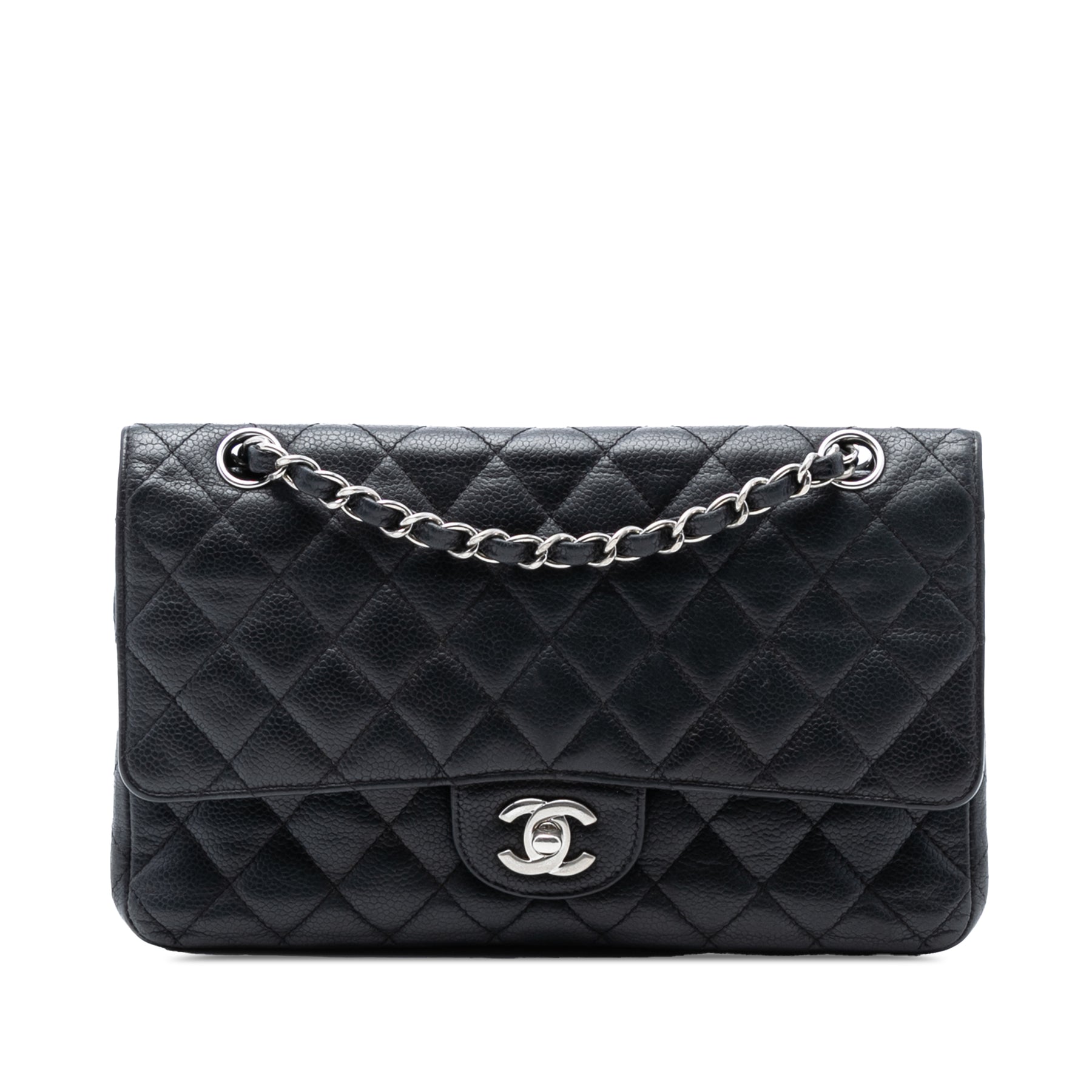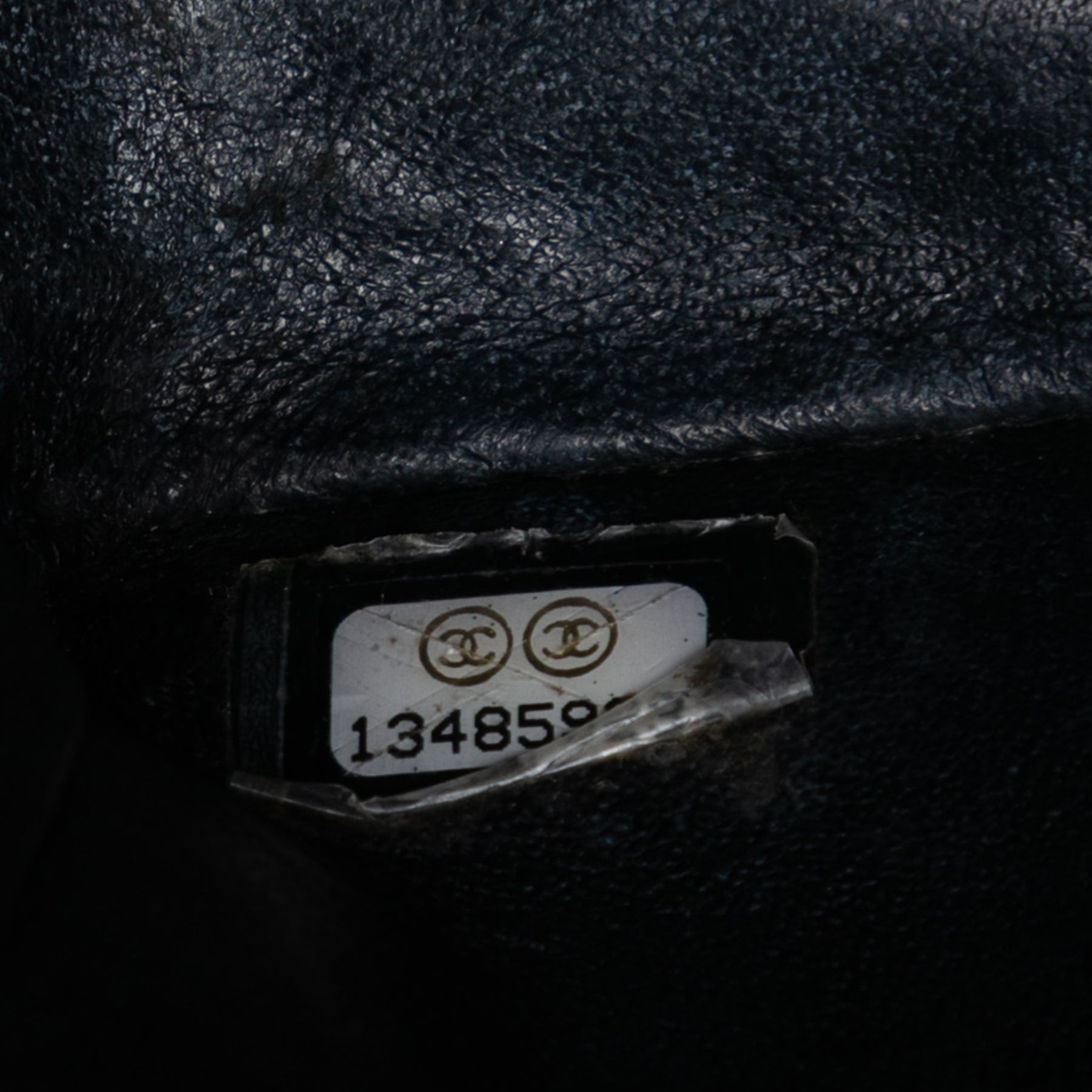 Ce sac bandoulière est confectionné en cuir caviar matelassé et possède des bandoulières en chaîne tressée de cuir, un double rabat avant orné du double C entrelacé et d'une fermeture à tourniquet, une poche plaquée extérieure au dos, ainsi que des poches intérieures zippées et plaquées. Il est en bon état.
