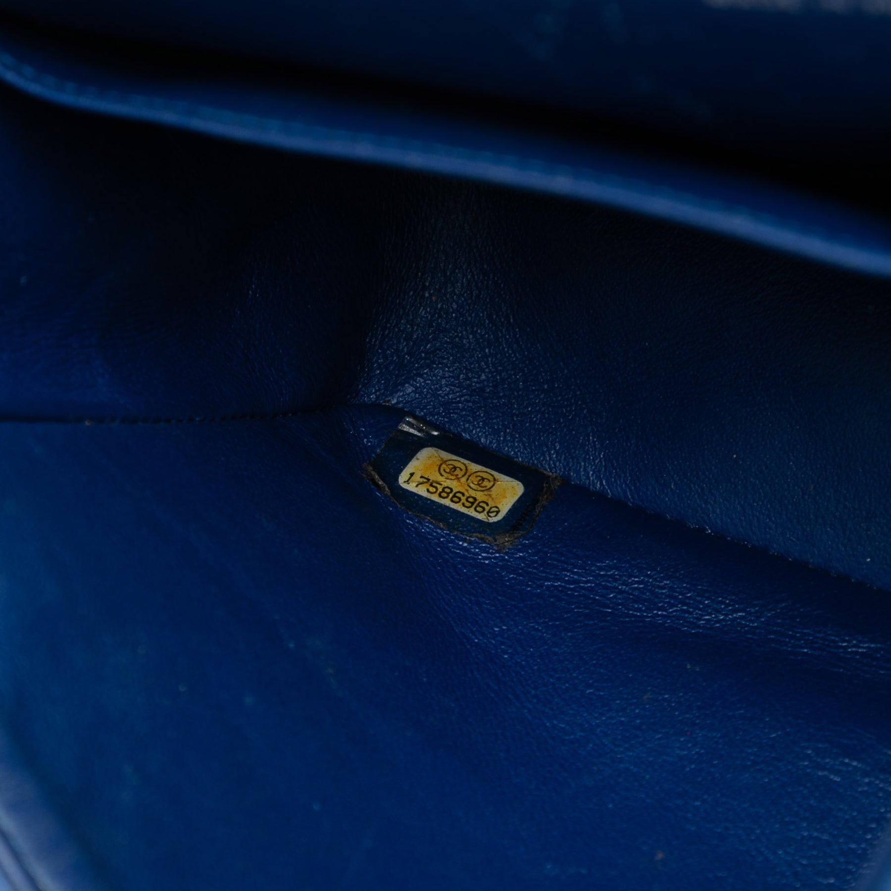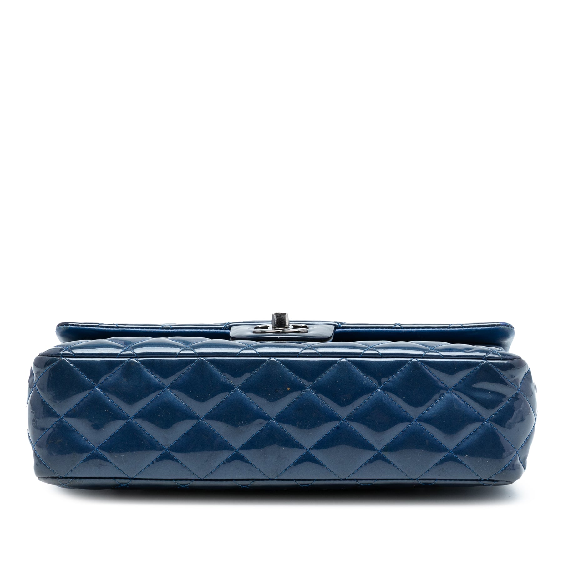 Ce sac bandoulière est en cuir verni et possède une poche plaquée extérieure au dos, une bandoulière chaîne dorée, un double rabat avant avec fermoir CC et des poches plaquées intérieures. Il est en bon état.