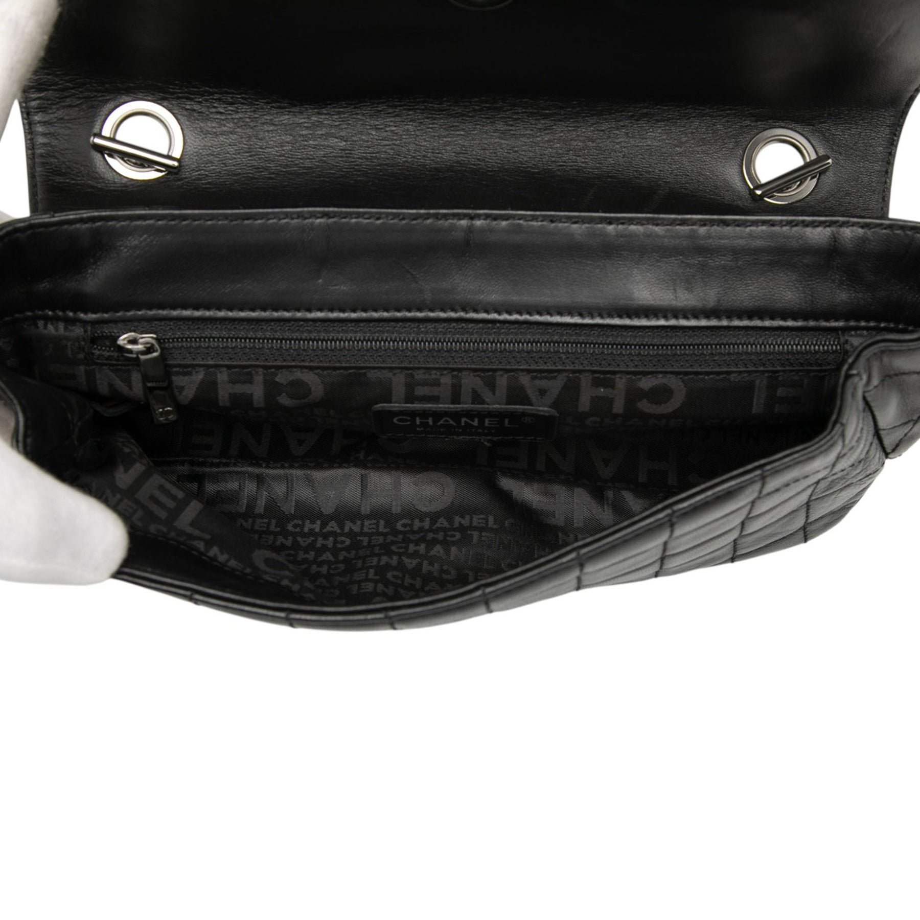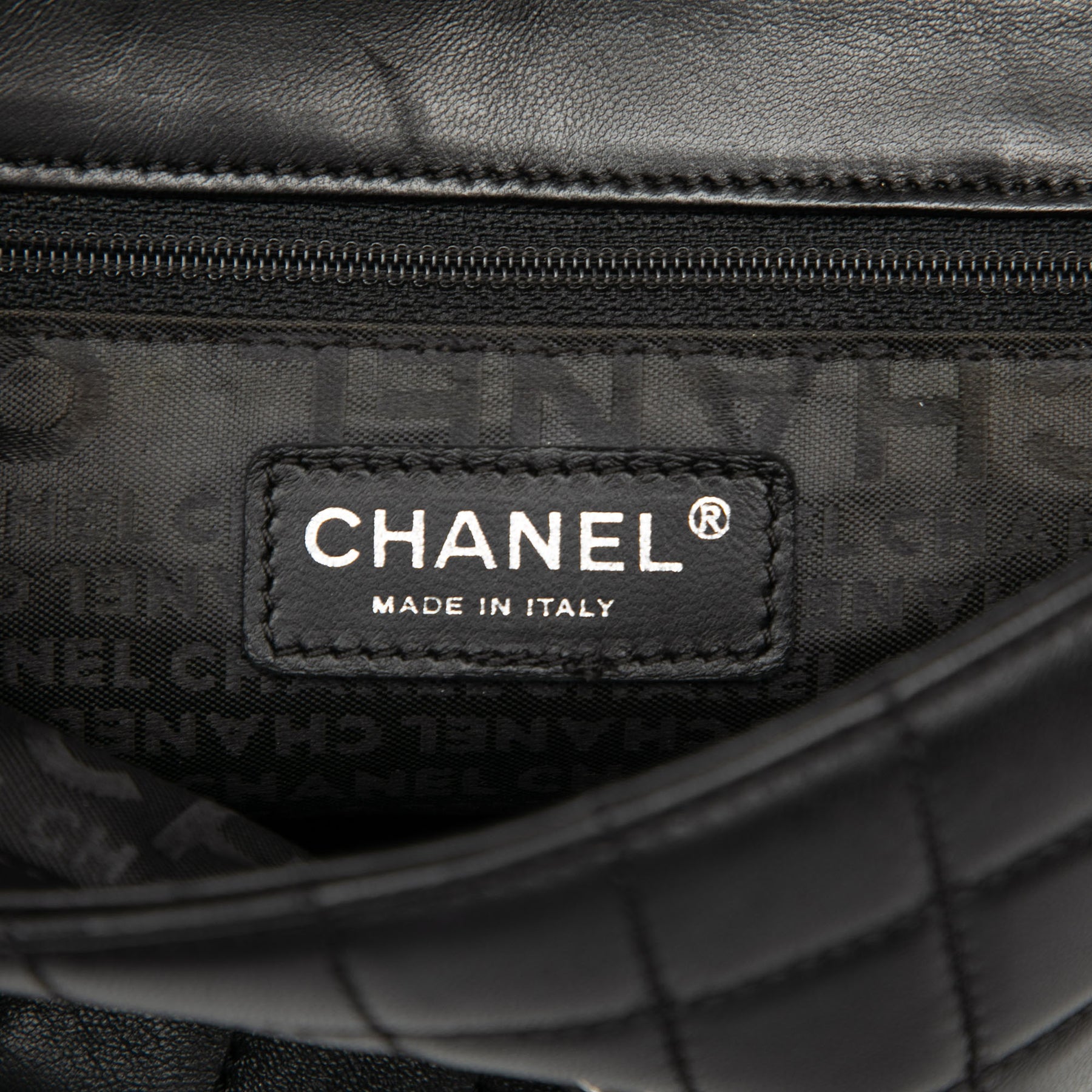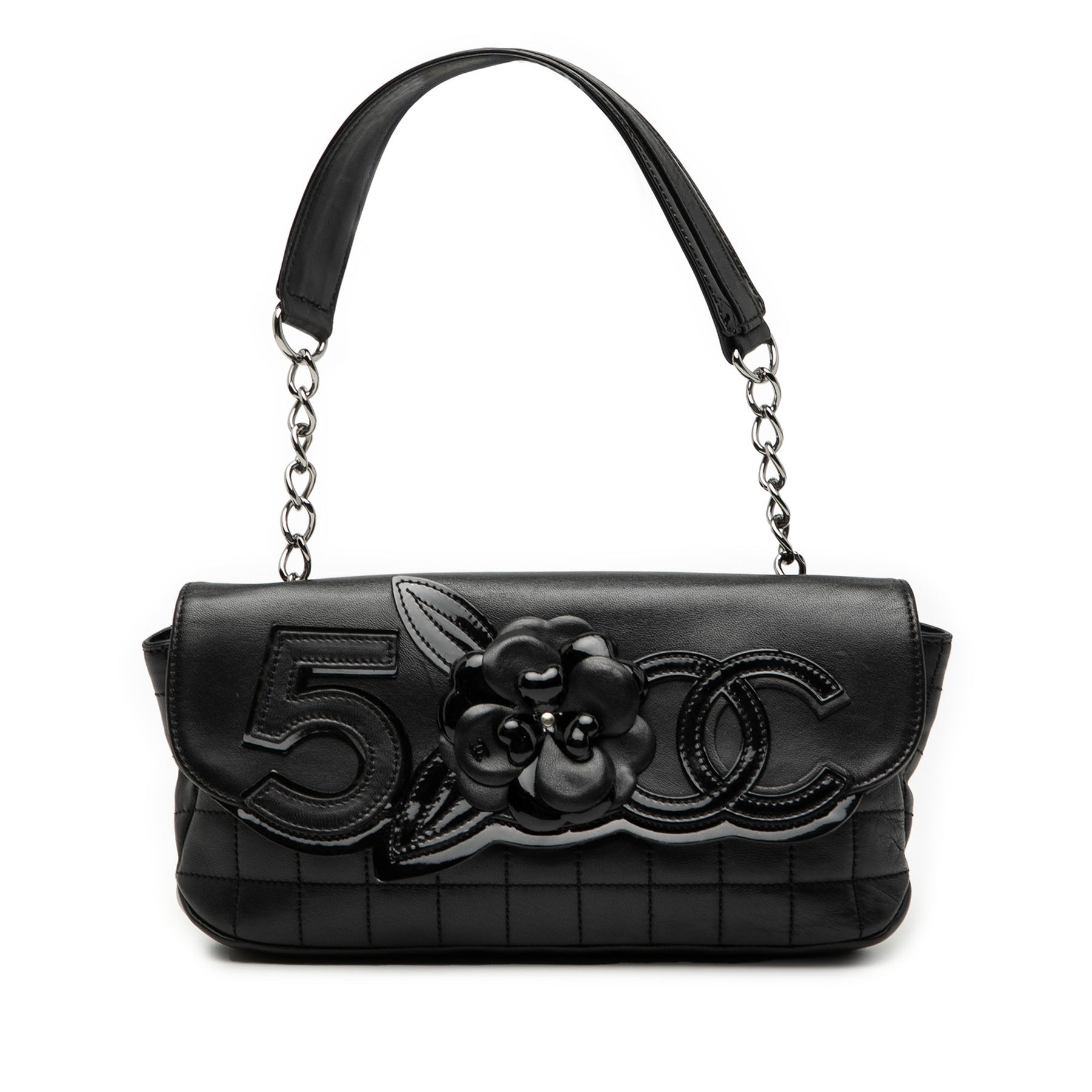 Ce sac bandoulière est confectionné en cuir d'agneau matelassé et possède une bandoulière en chaîne et cuir, un rabat orné d'un camélia et une fermeture magnétique, ainsi qu'une poche intérieure zippée. Il est en excellent état.
