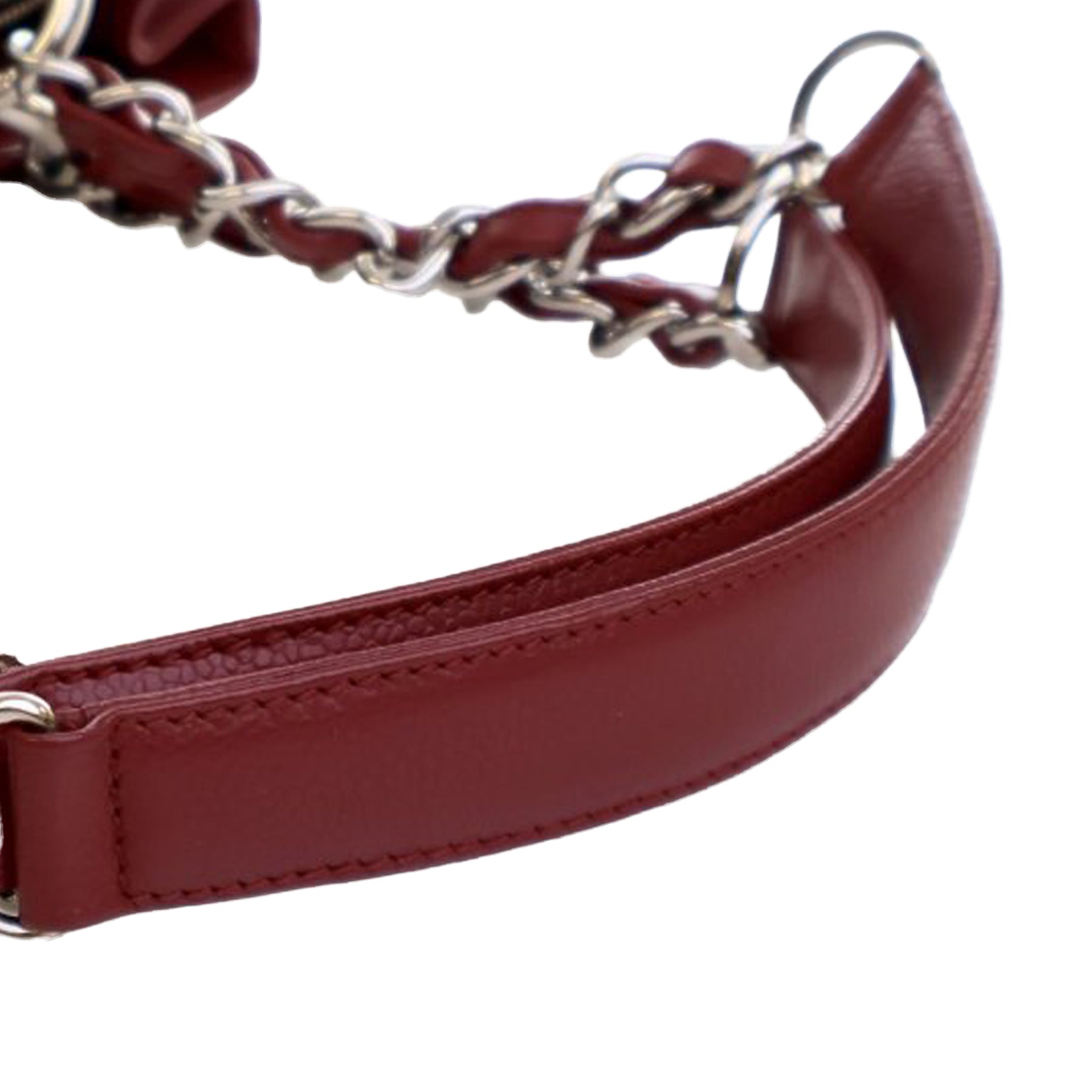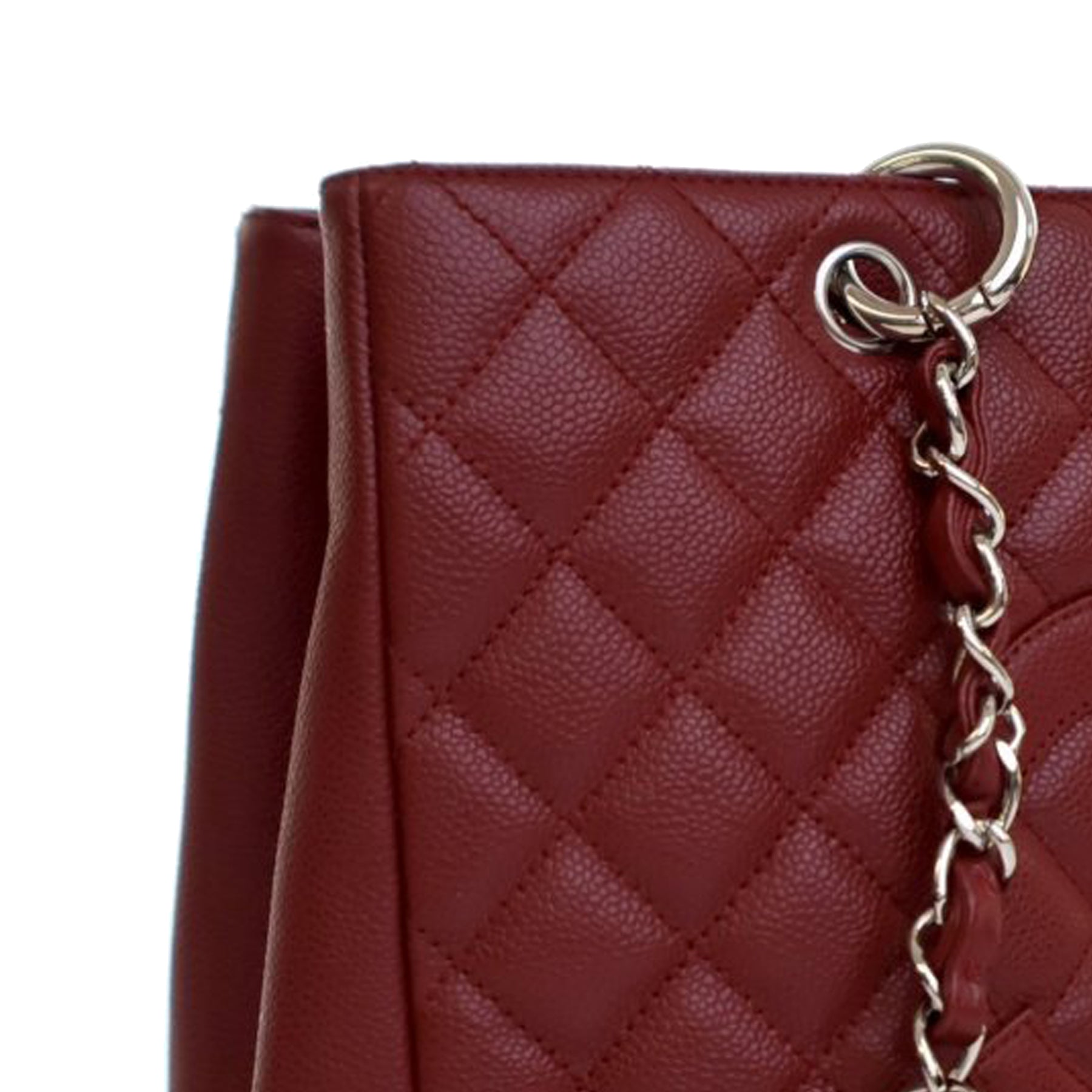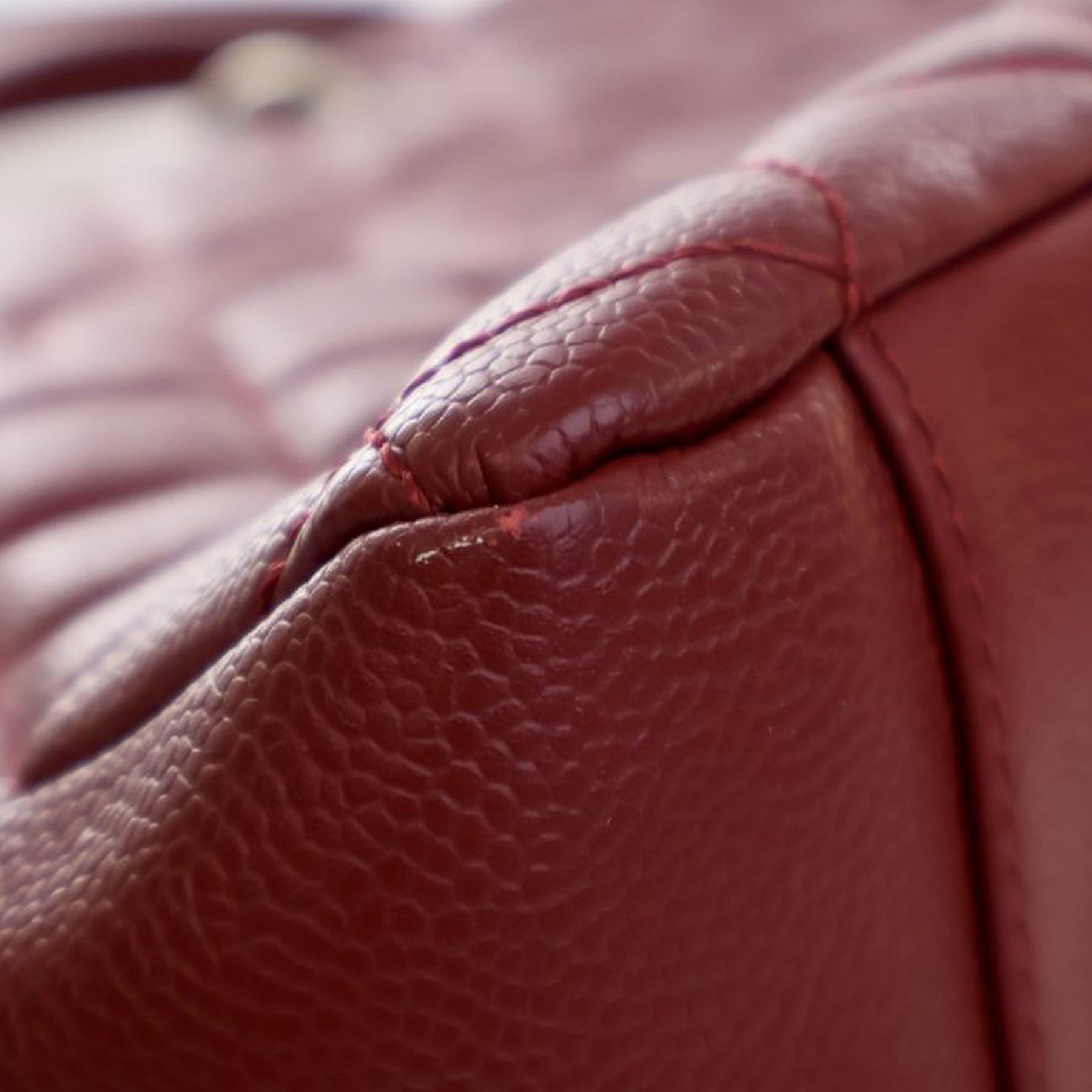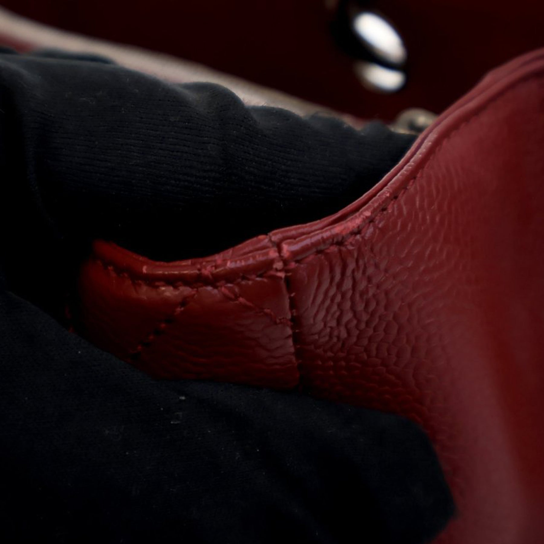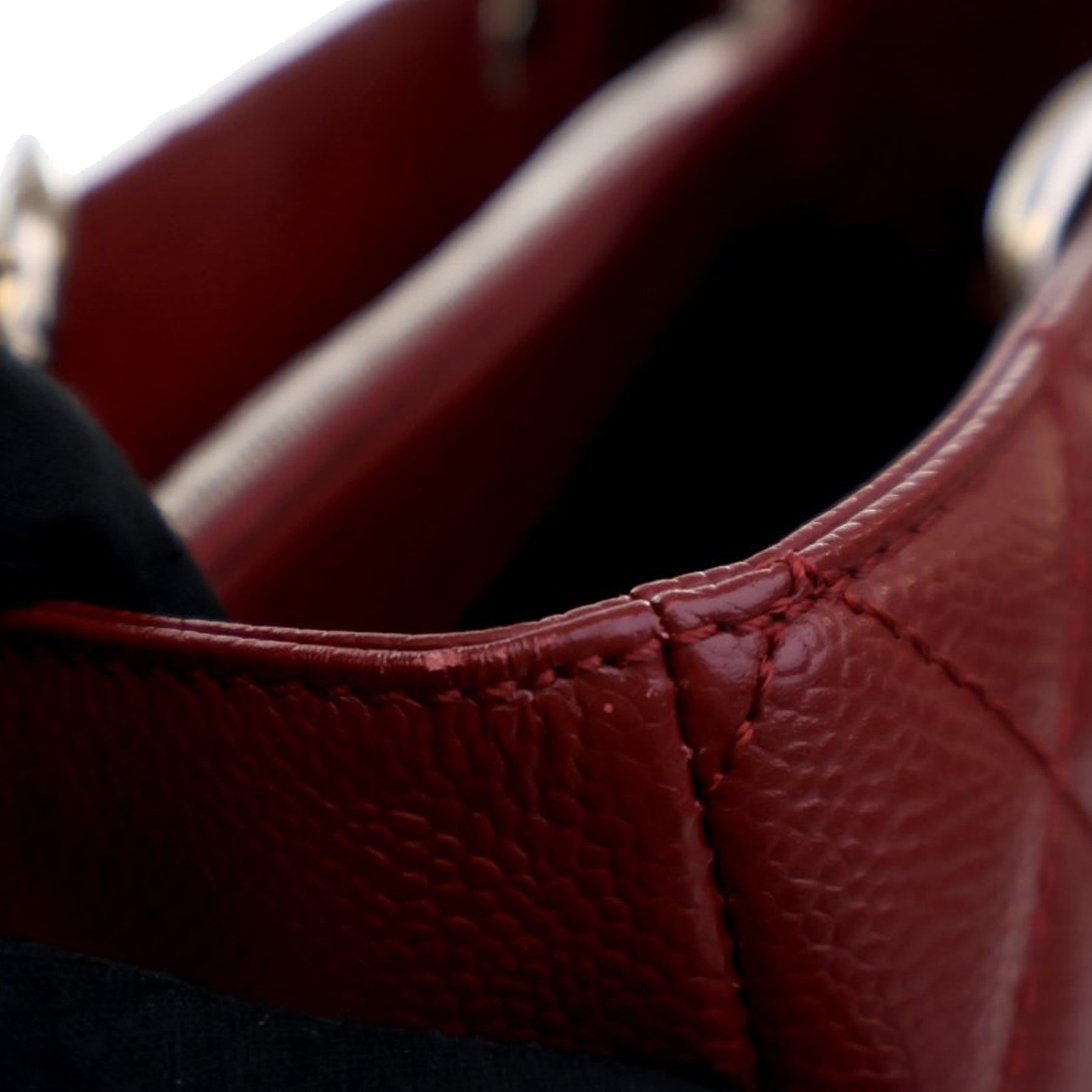 Ce sac cabas est confectionné en cuir caviar matelassé, possède des anses en chaîne tressée de cuir, une fermeture zippée sur le dessus et des poches intérieures zippées et plaquées. Il est en excellent état.