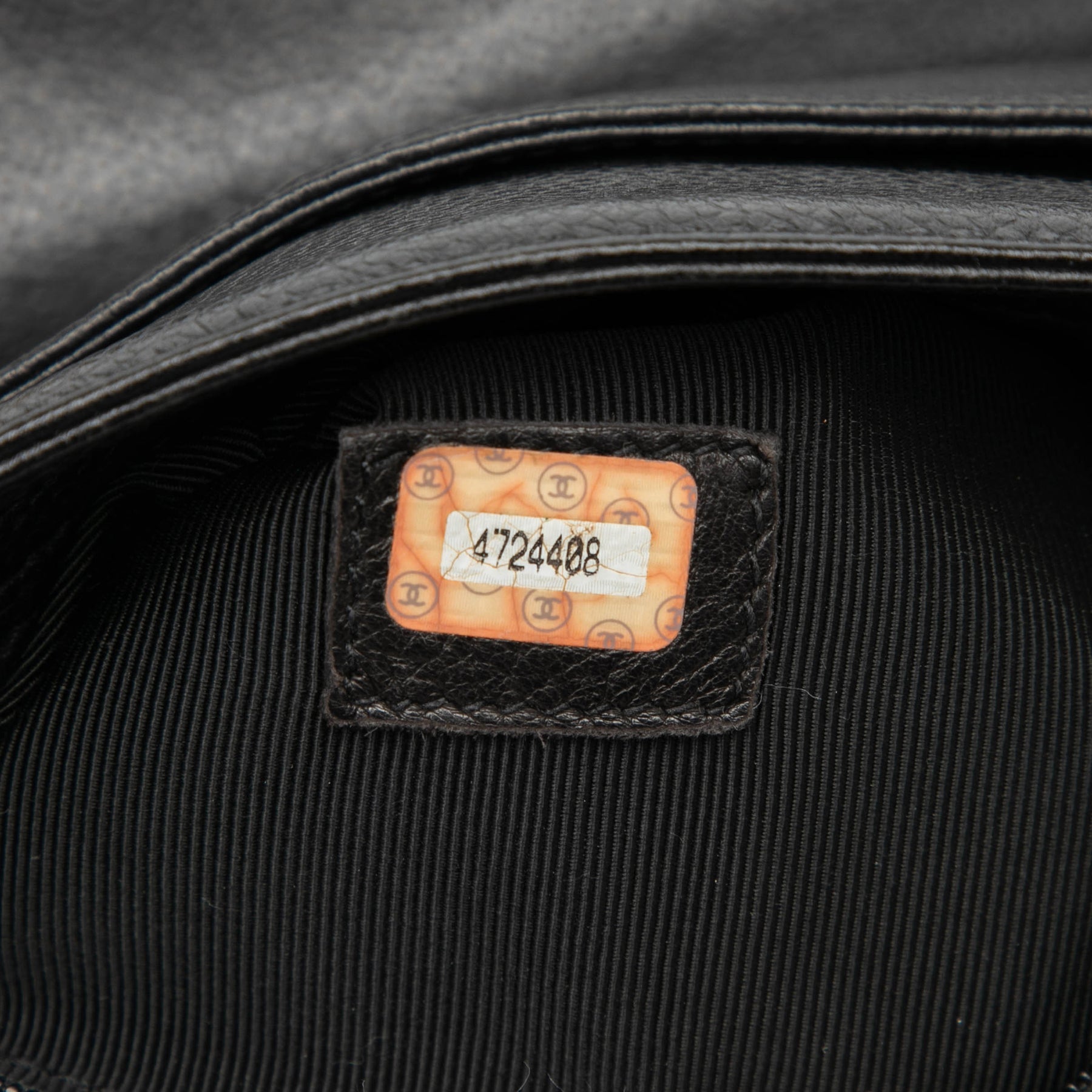 Ce sac bandoulière est en cuir caviar, avec des anses plates en cuir ornées de détails en chaîne dorée, une fermeture zippée sur le dessus, des poches extérieures plaquées et des poches intérieures zippées. Il est en bon état.
