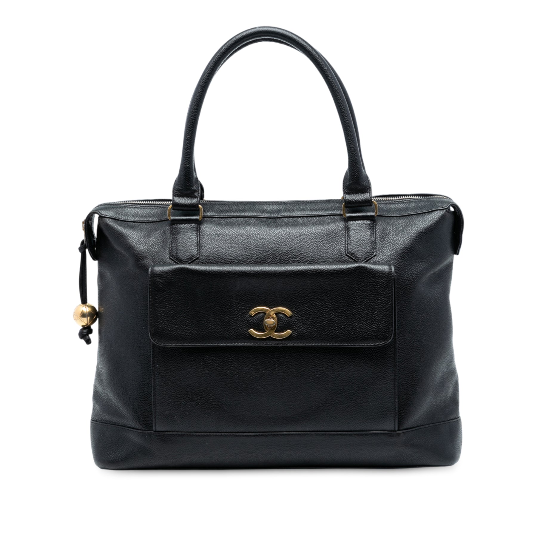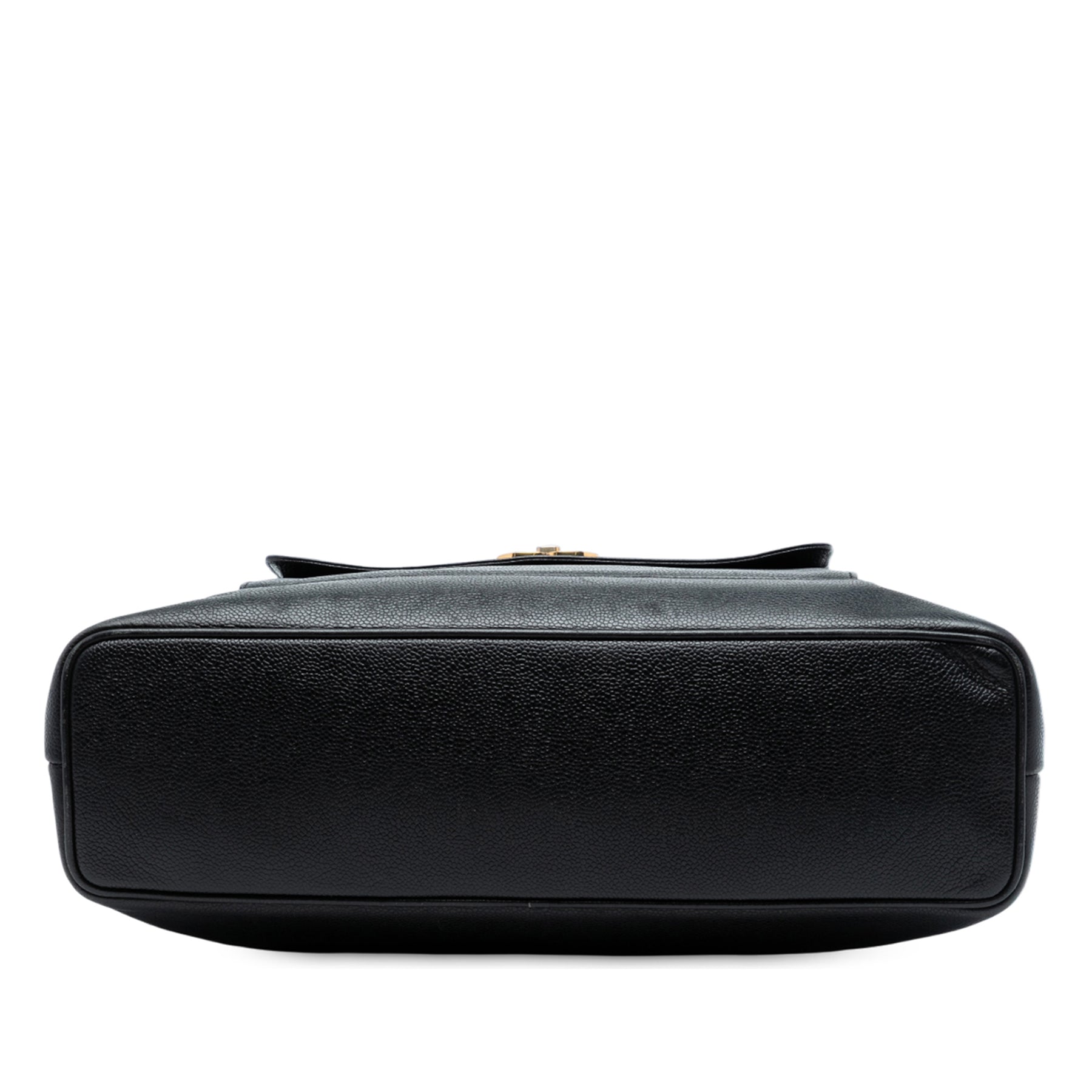 Ce sac cabas à chaîne est confectionné en cuir caviar et possède des anses roulées en cuir. Il se ferme par une fermeture zippée sur le dessus, et comprend une poche extérieure à rabat avec fermoir tourniquet et une poche intérieure zippée. Il est en bon état.