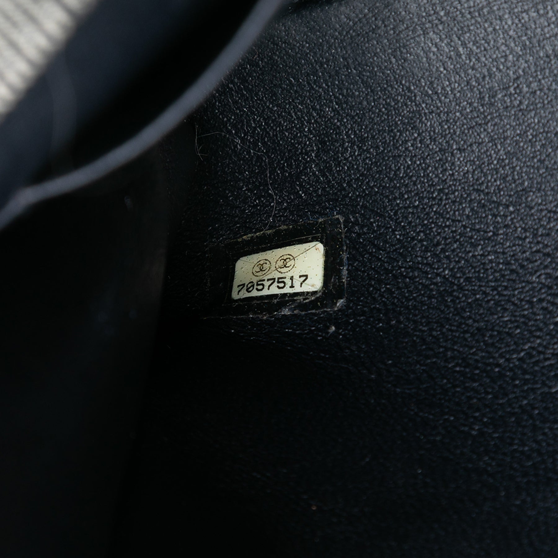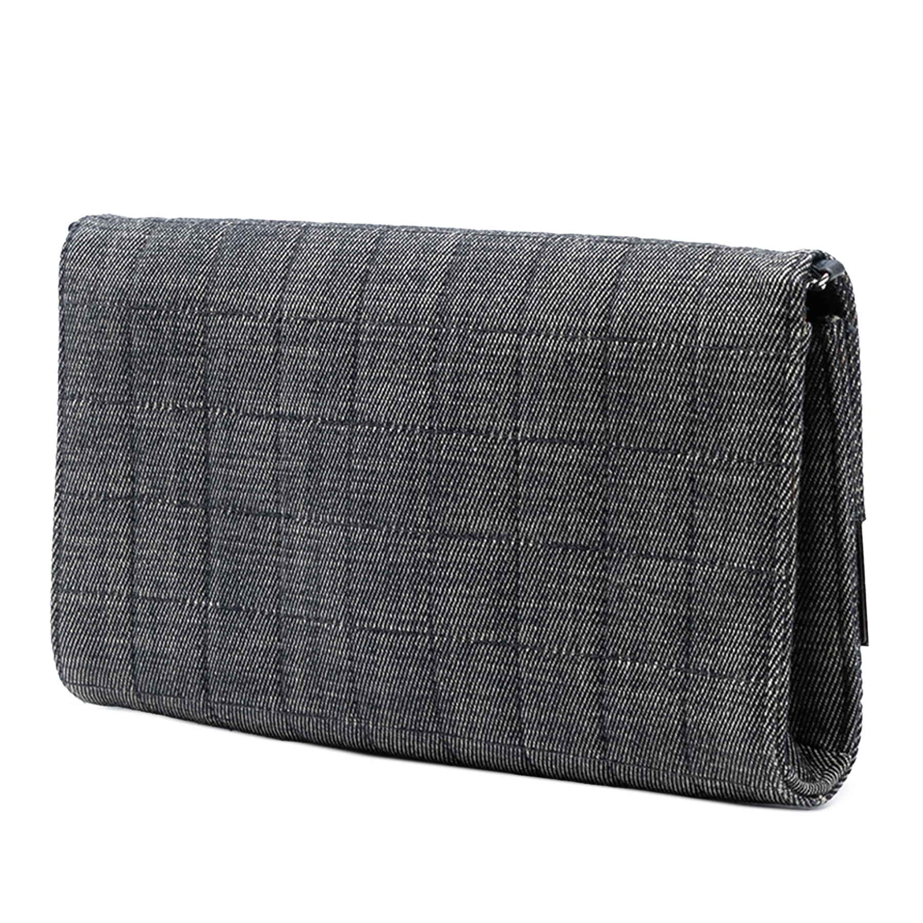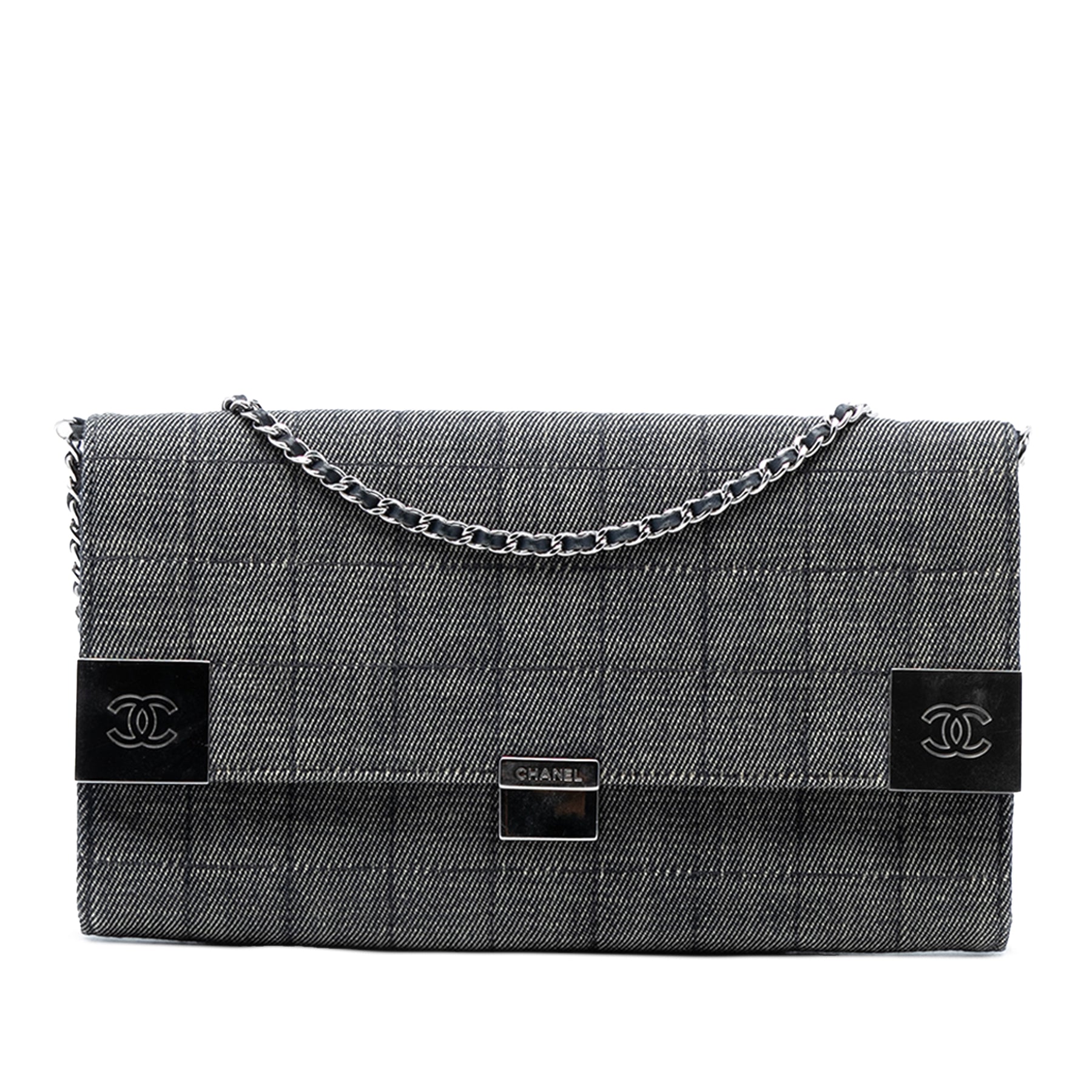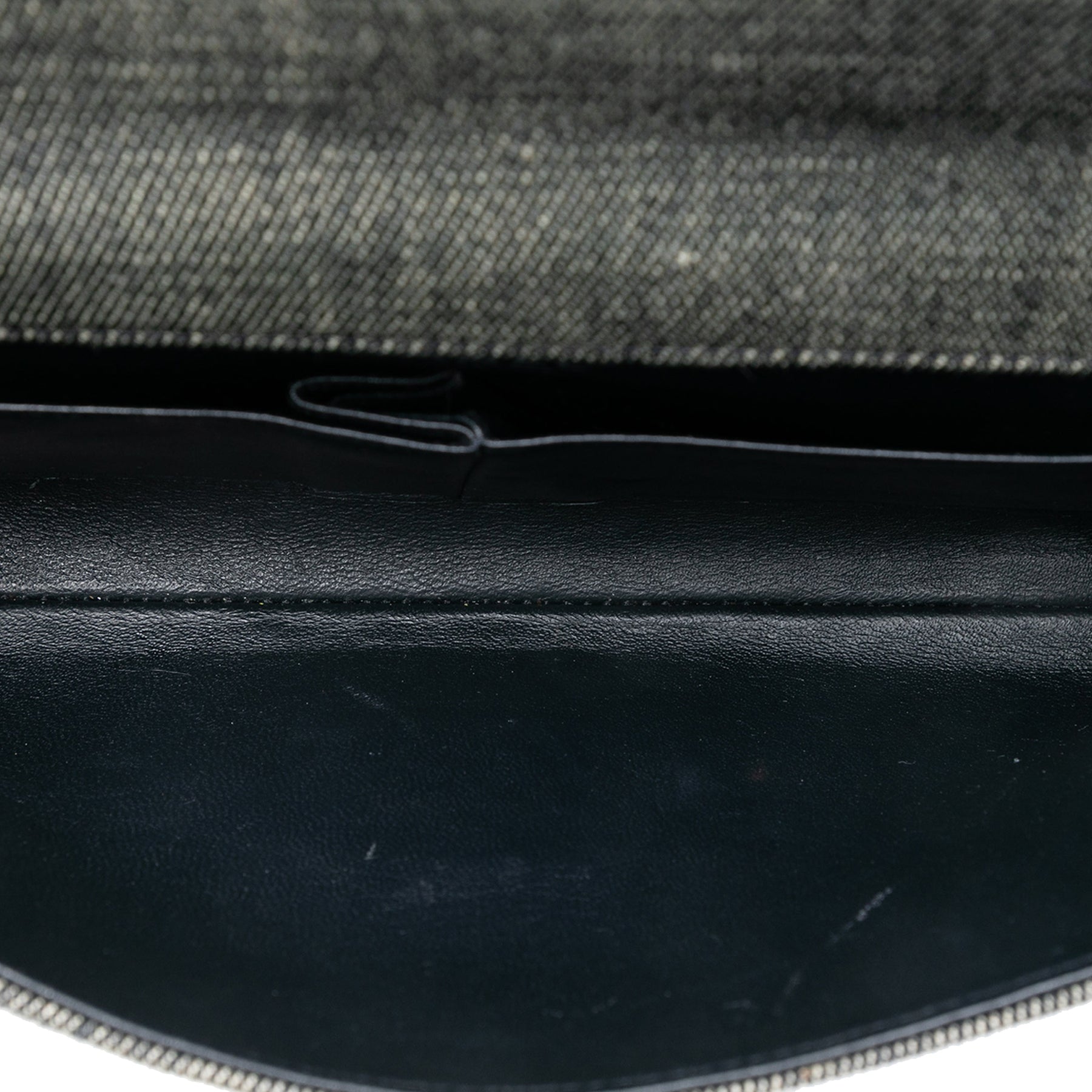 Ce sac bandoulière présente un corps carré en denim matelassé, une bandoulière en chaîne tressée de cuir, un rabat avant avec fermeture à bouton-pression aimanté et des poches intérieures plaquées. Il est en excellent état.