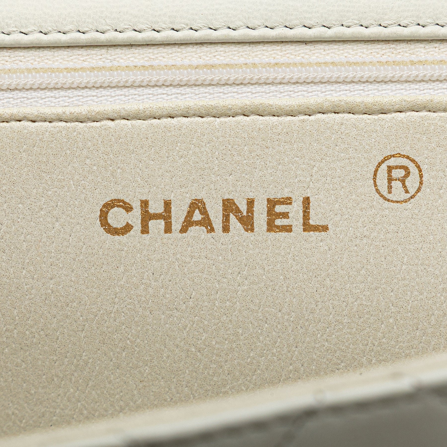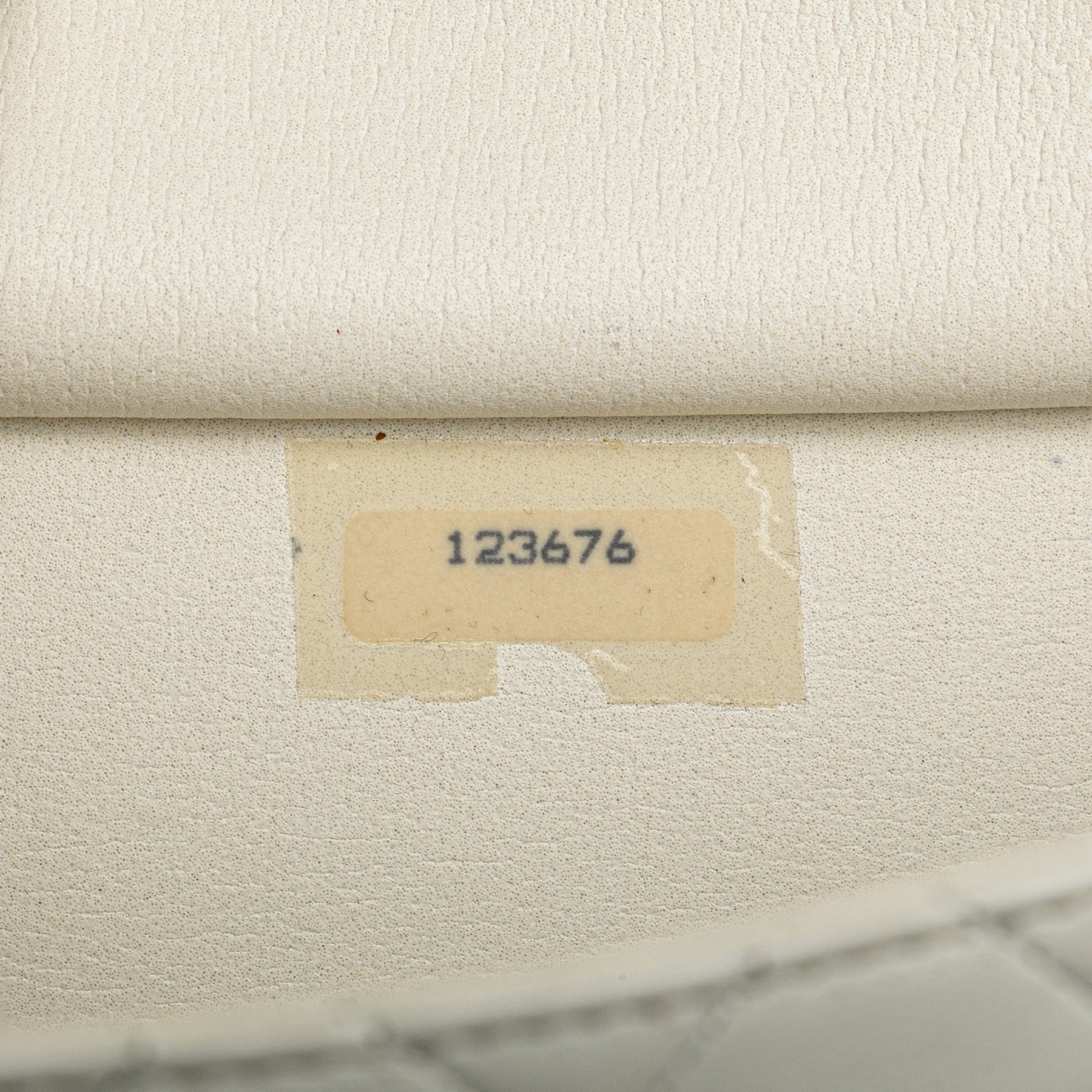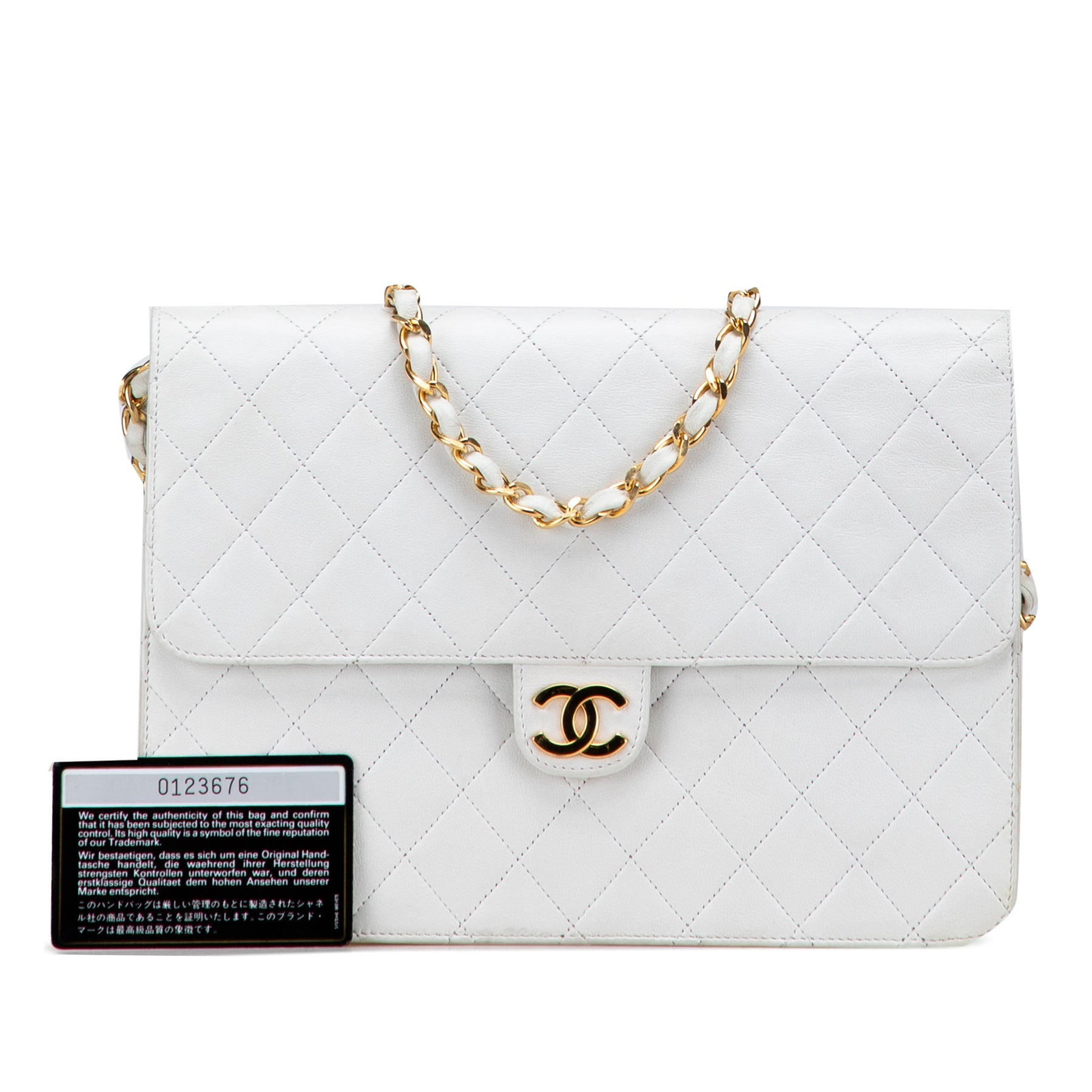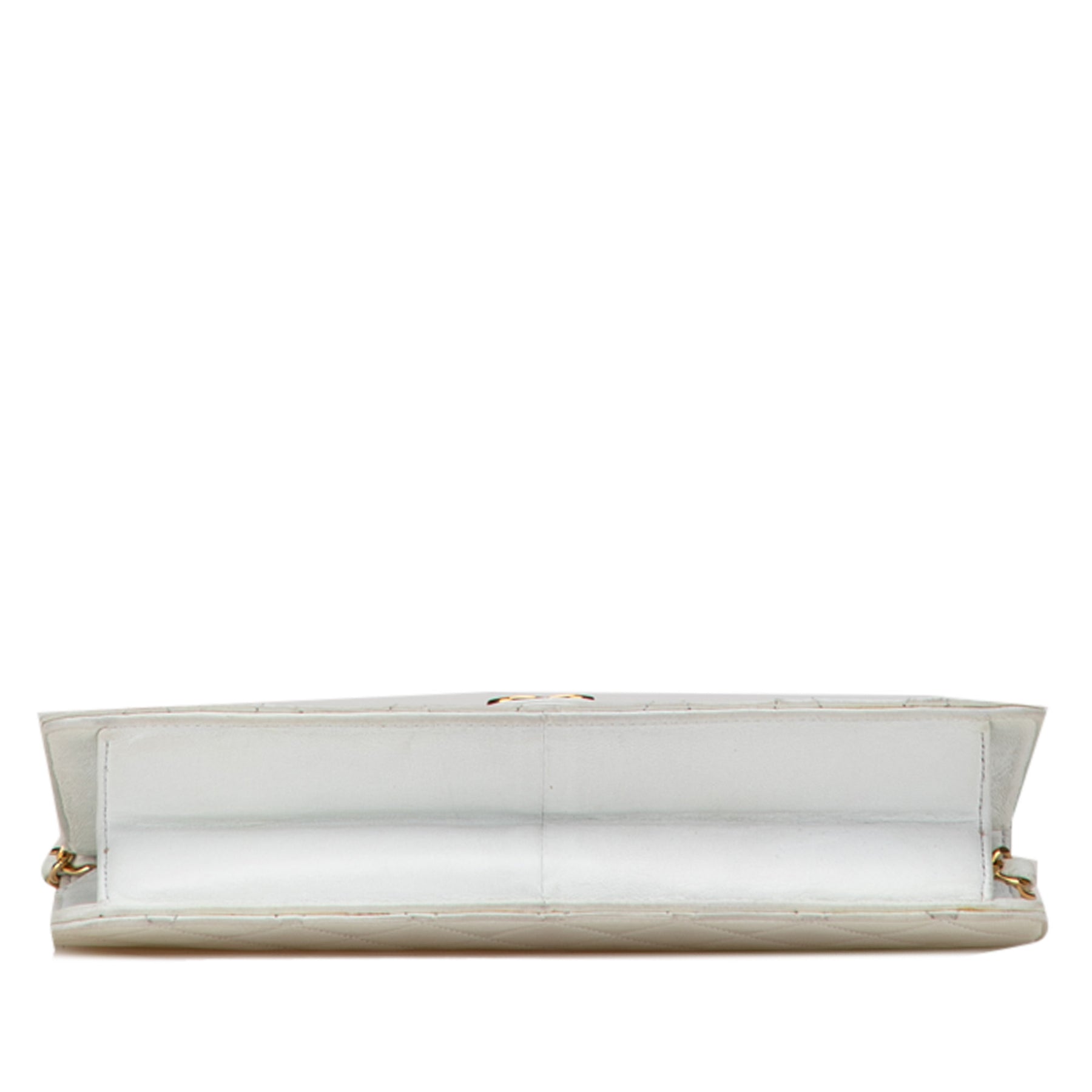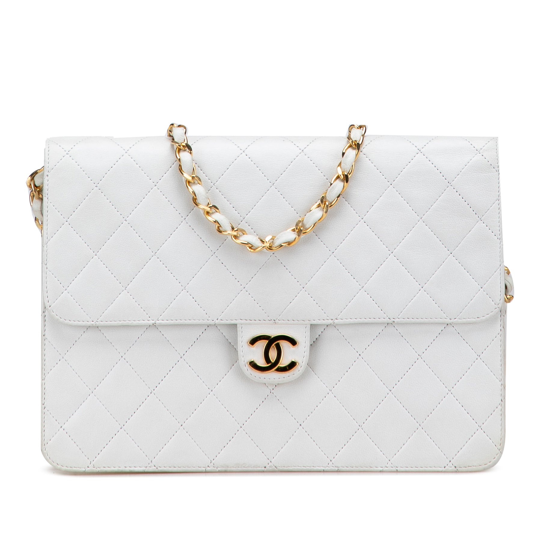 Ce sac bandoulière est confectionné en cuir d'agneau matelassé et possède une bandoulière en chaîne tressée couleur or, un rabat avant à fermeture magnétique, ainsi que des poches intérieures zippées et plaquées. Il est en bon état.