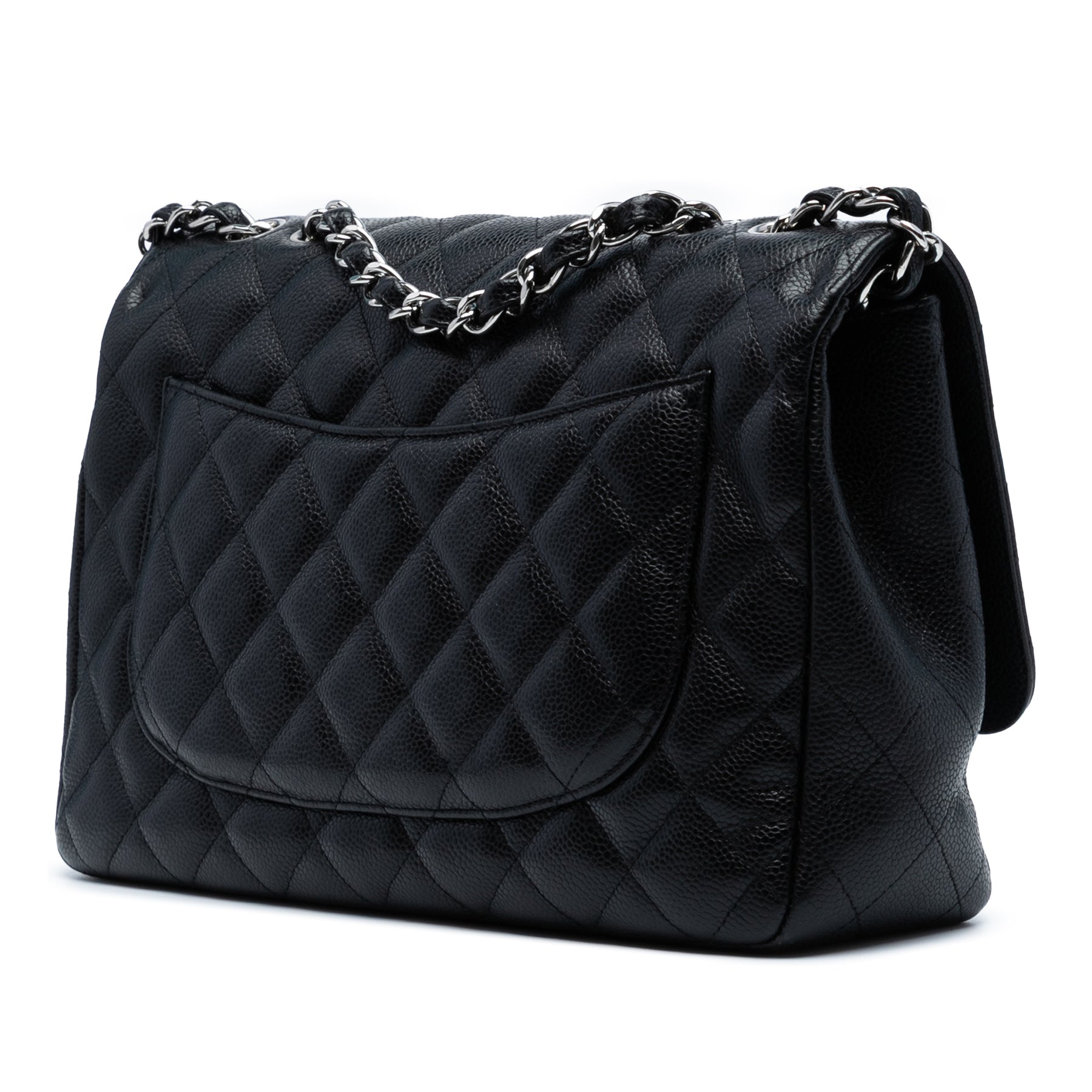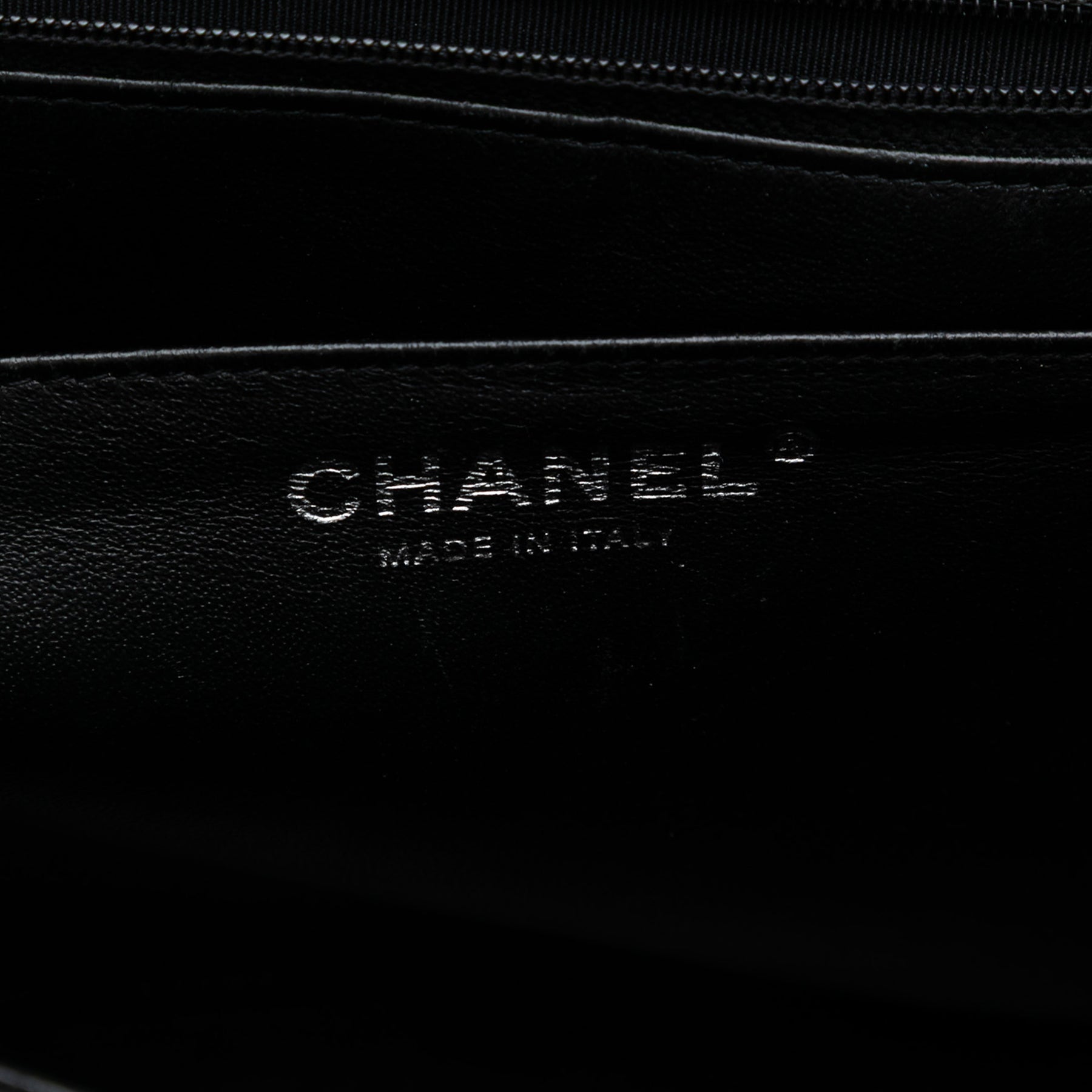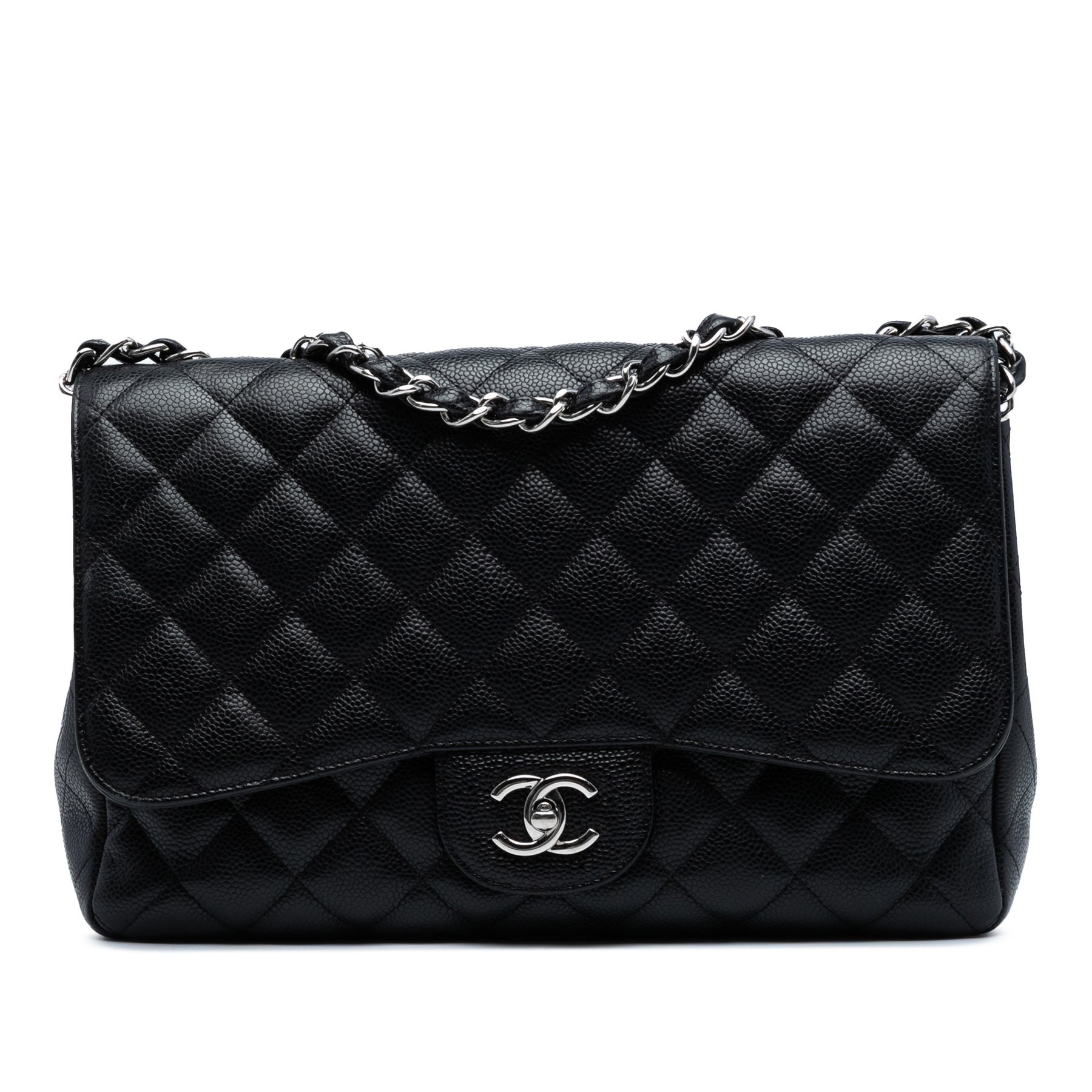 Ce sac bandoulière est confectionné en cuir caviar matelassé et possède une bandoulière en chaîne tressée de cuir, un rabat avant orné du double C et d'une fermeture à tourniquet, ainsi que des poches intérieures zippées et plaquées. Il est en bon état.