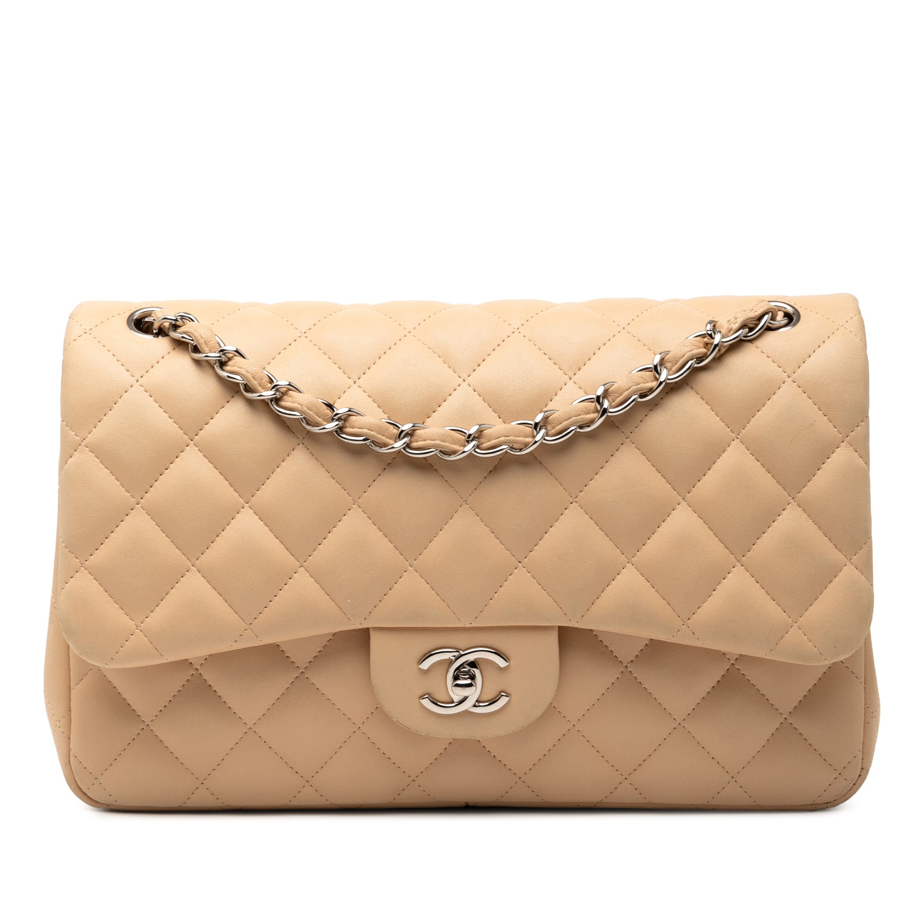 Le sac Classic Jumbo Flap est confectionné en cuir d'agneau, possède des bandoulières chaîne, un rabat avant avec fermoir tourniquet à double C, une poche extérieure au dos, ainsi que des poches intérieures zippées et ouvertes. Il est en bon état.
