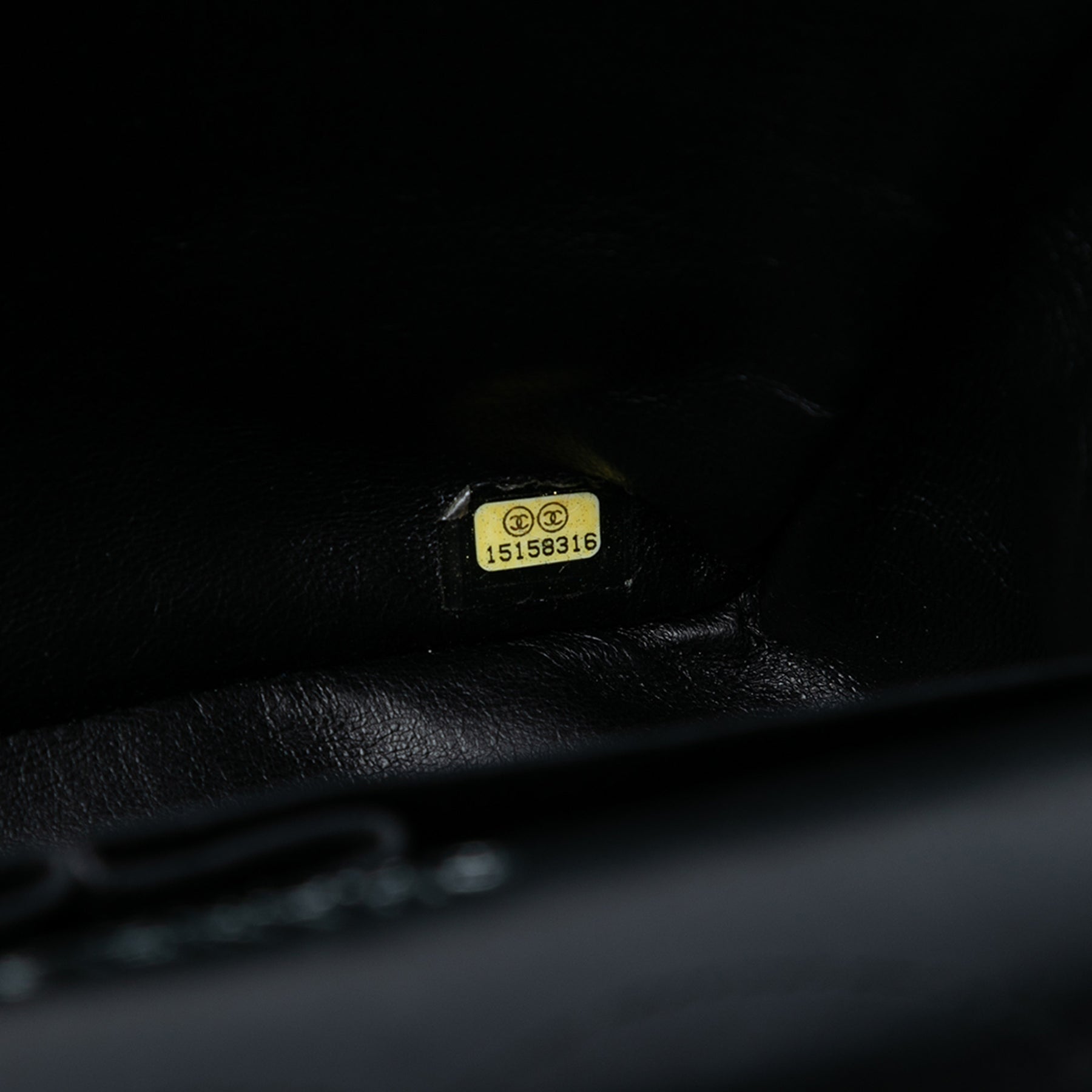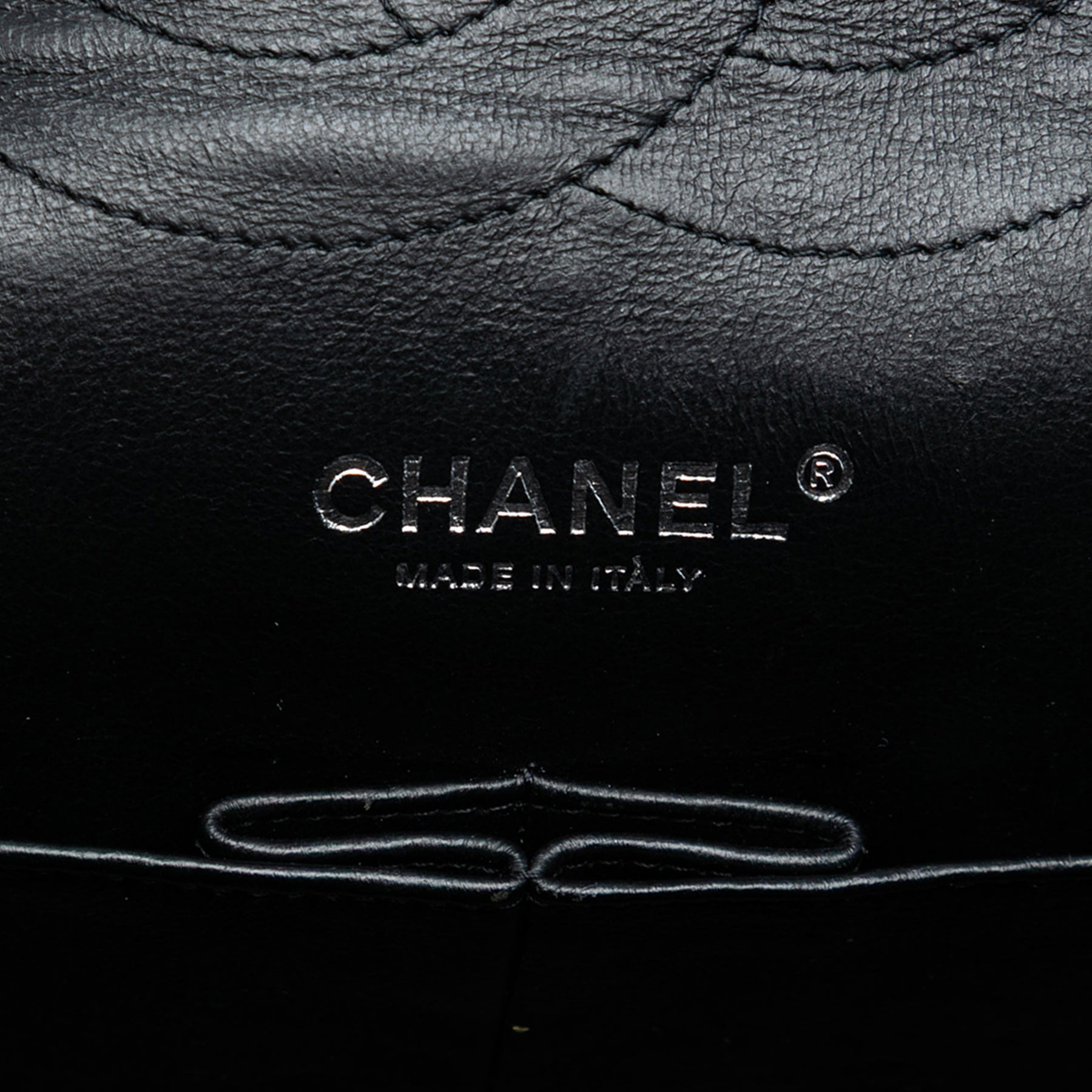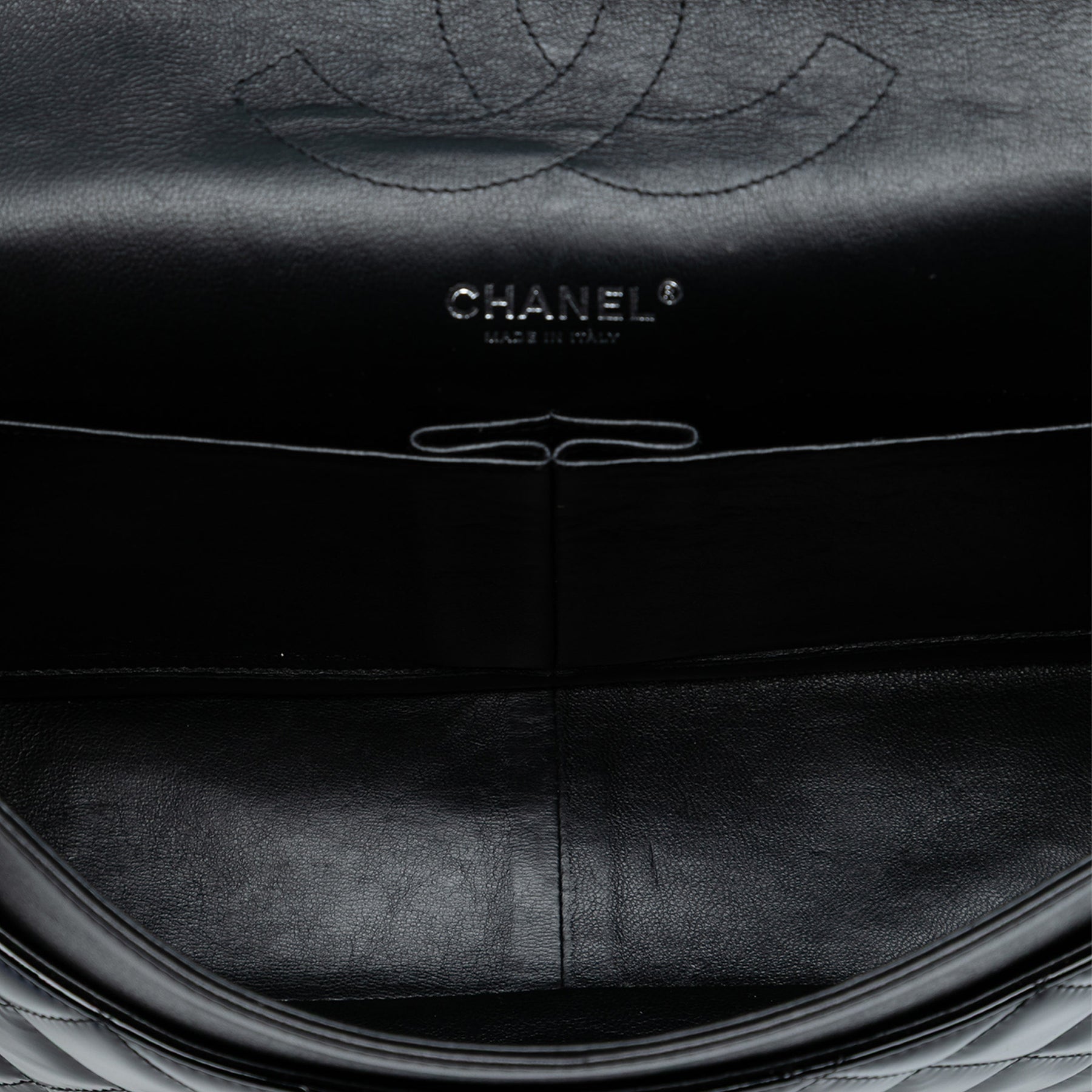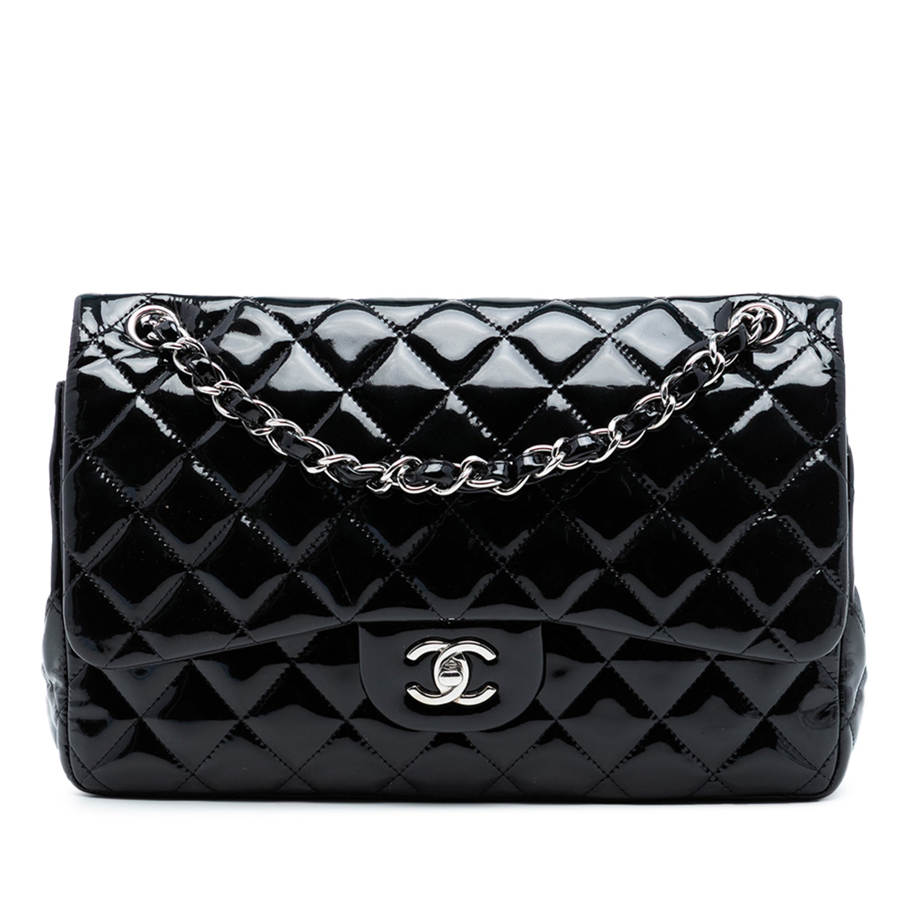 Le modèle Classic Medium présente un corps en cuir verni matelassé, une bandoulière en chaîne tressée argentée, un double rabat avant orné du double C entrelacé et d'une fermeture à tourniquet, une poche plaquée extérieure au dos, ainsi que des poches intérieures zippées et plaquées. Il est en bon état.