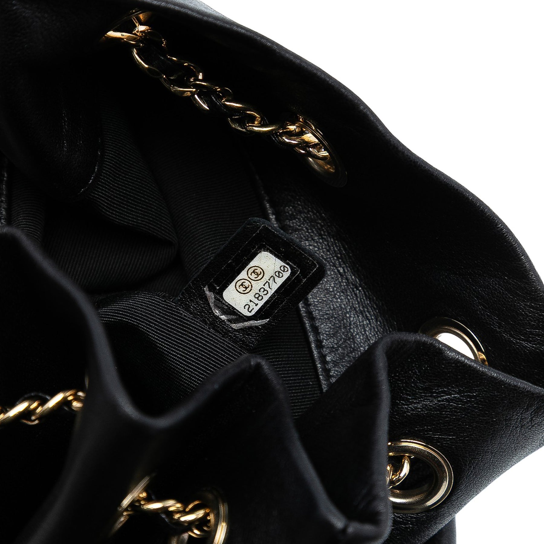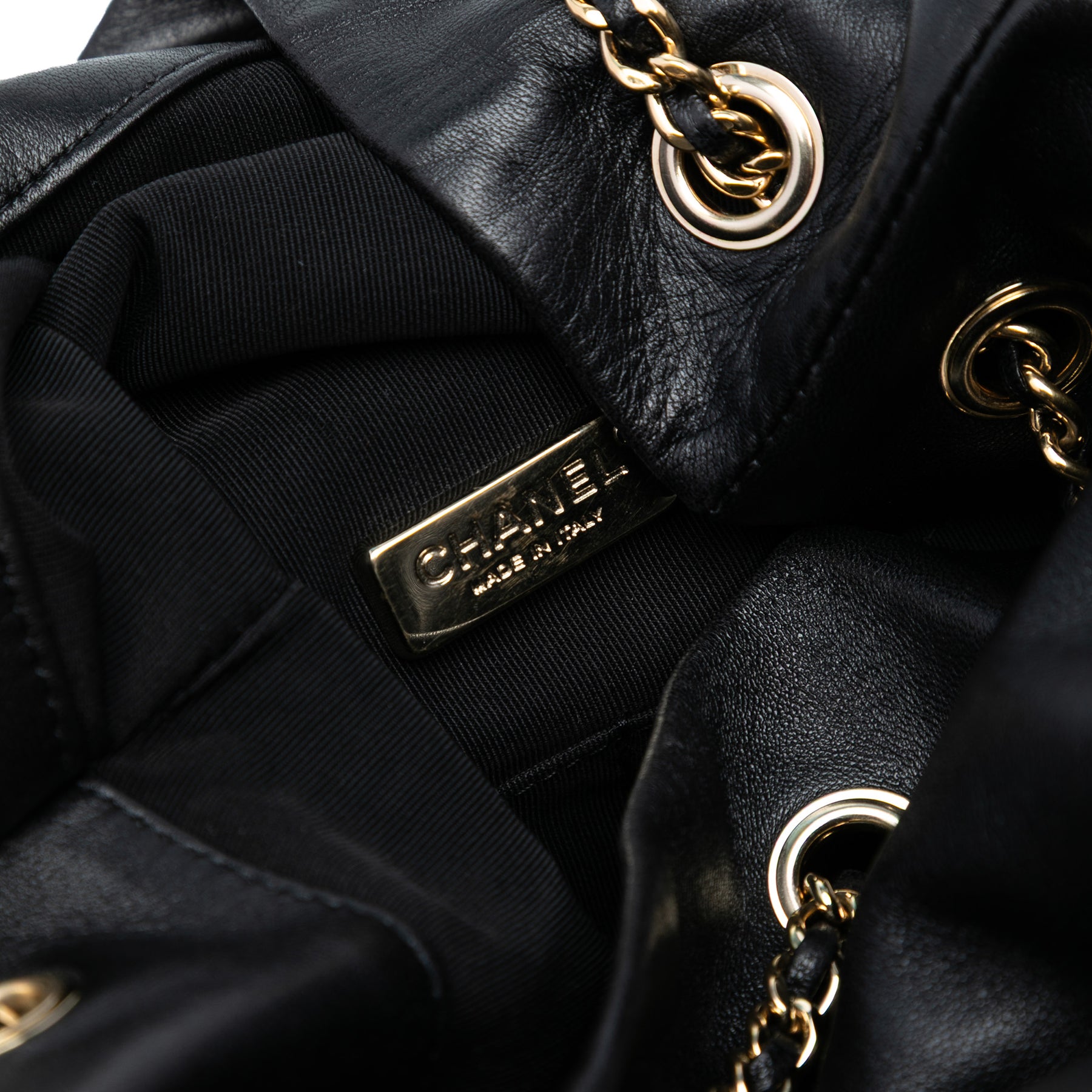 Le sac à dos In Seoul est confectionné en cuir d'agneau, avec des bretelles en chaîne tressée de cuir, une fermeture à cordon sur le dessus, une poche extérieure à rabat sur le devant avec fermoir CC et une poche plaquée au dos, ainsi que des poches intérieures plaquées. Il est en excellent état.
