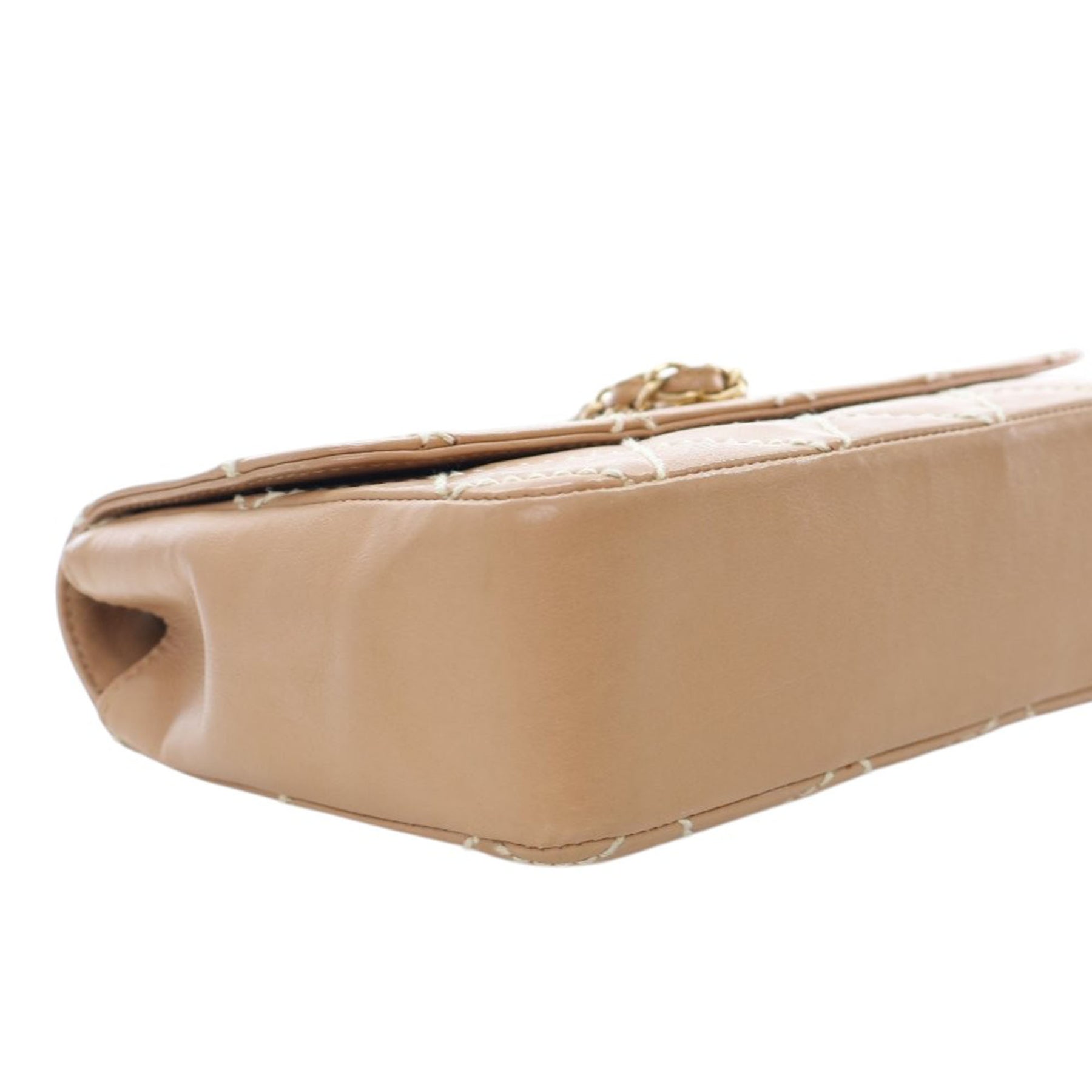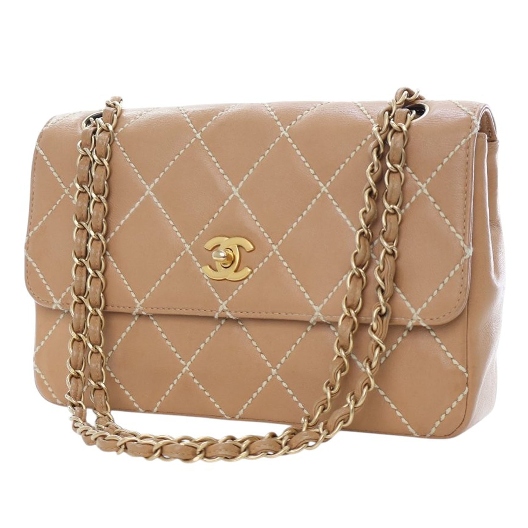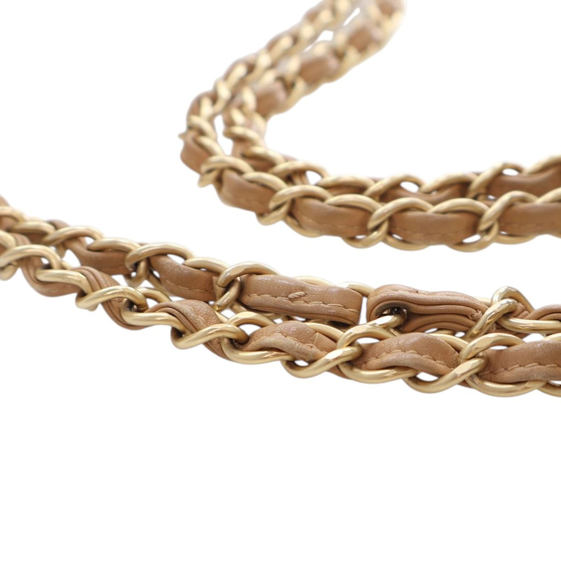 Ce sac bandoulière est en cuir matelassé, avec une bandoulière en chaîne tressée de cuir, un rabat avant avec fermoir CC, une poche plaquée extérieure au dos et des poches intérieures zippées et plaquées. Il est en excellent état.