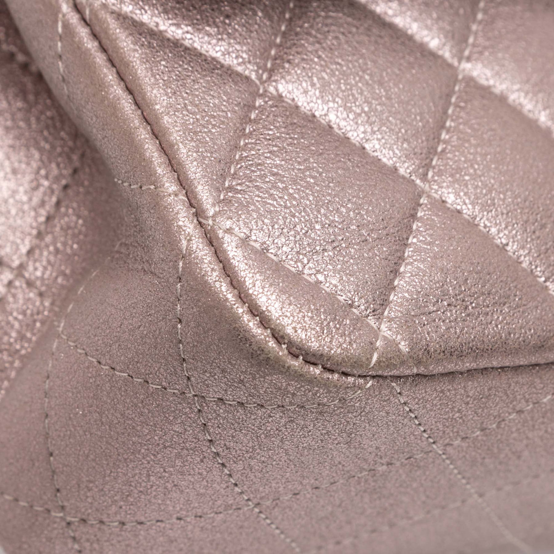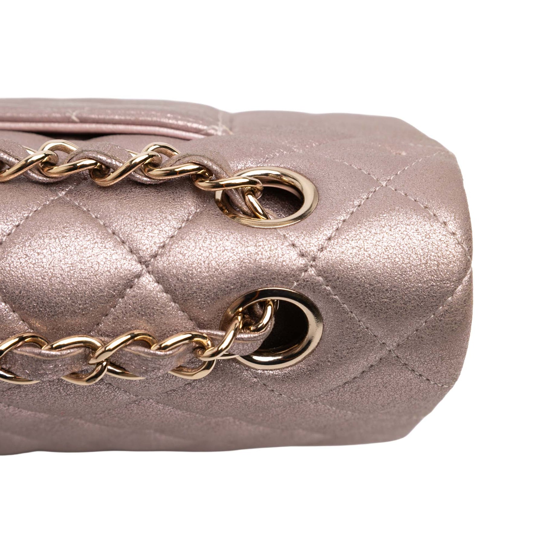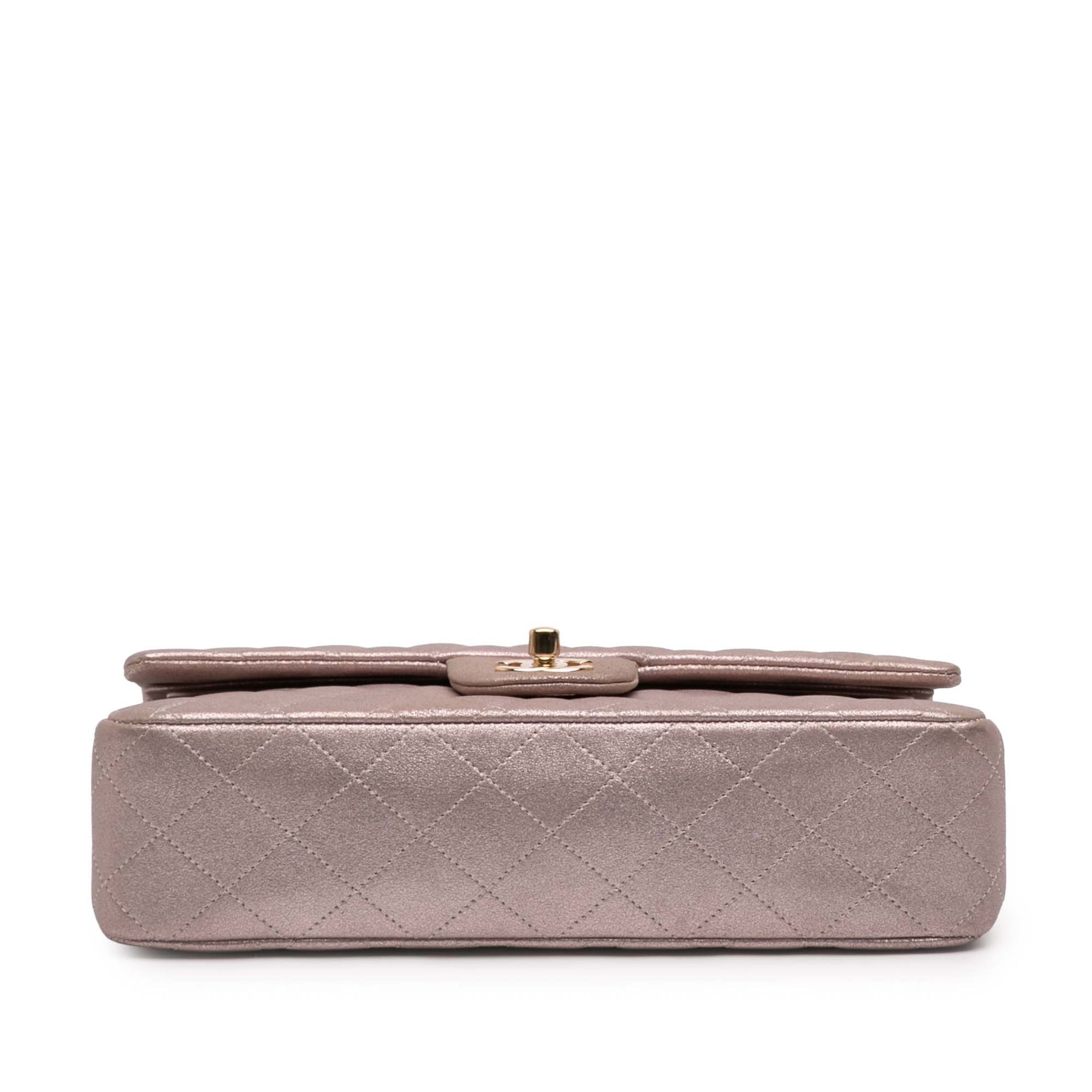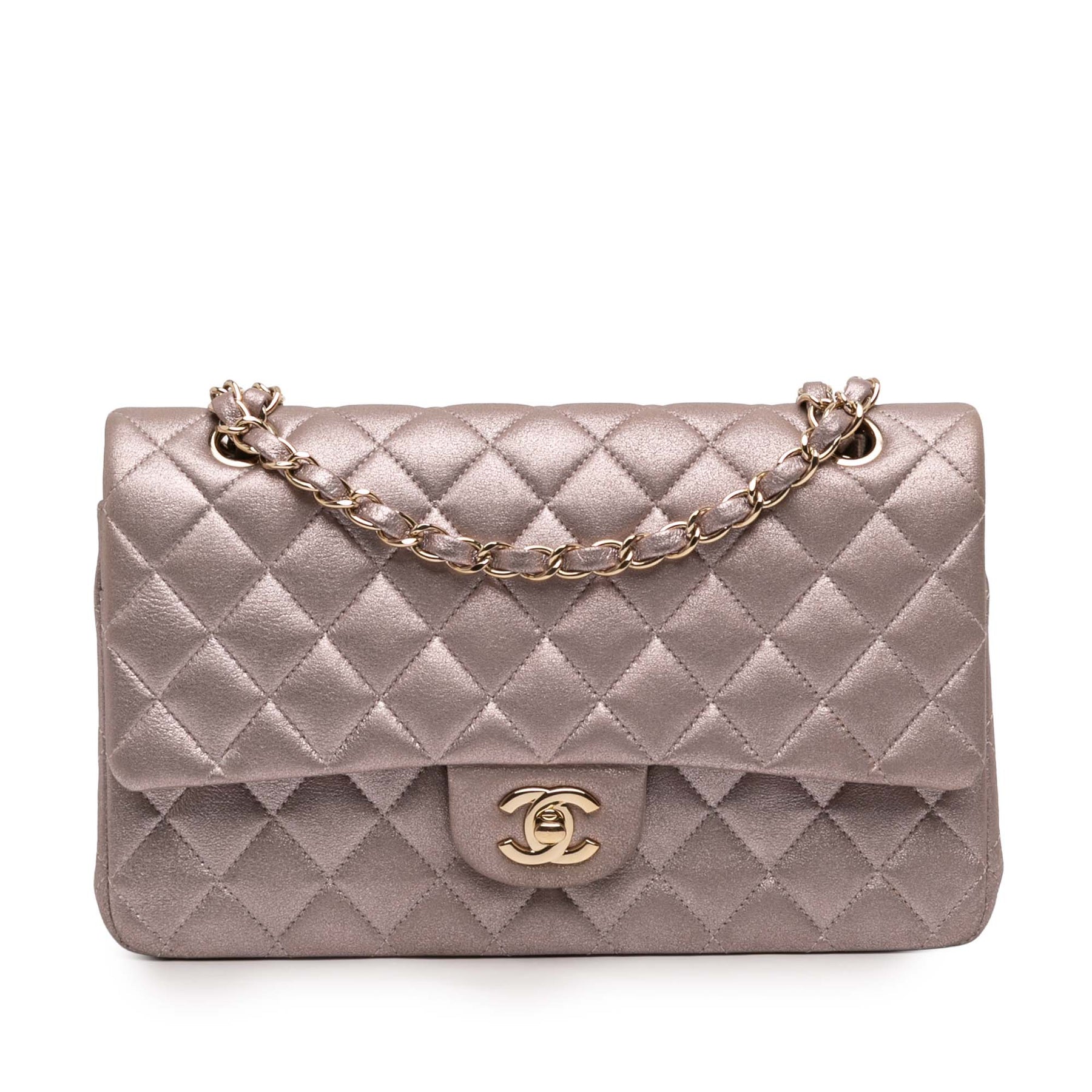 Le sac Classic Flap est confectionné en cuir d'agneau métallisé matelassé, avec une bandoulière en chaîne tressée couleur or, un double rabat supérieur à fermoir CC, une poche plaquée extérieure au dos et des poches intérieures zippées et plaquées. Il est en bon état.