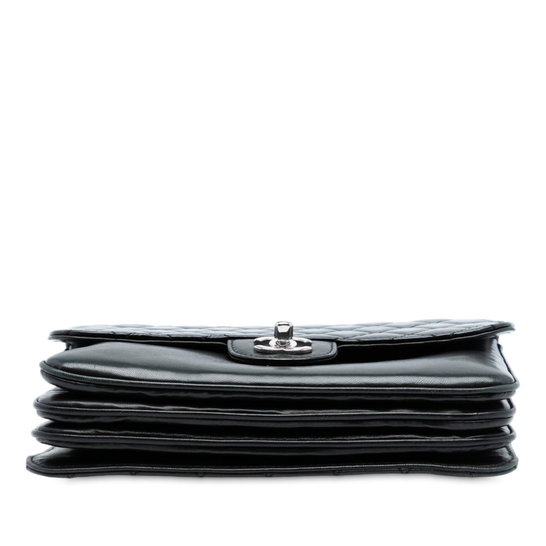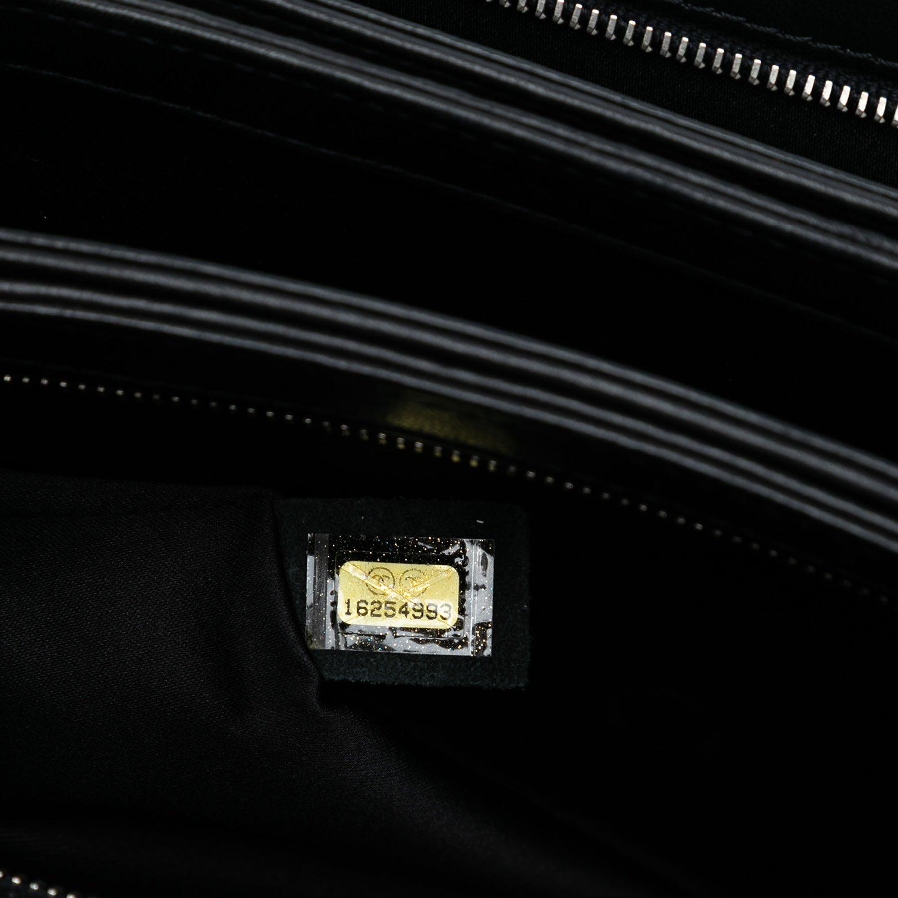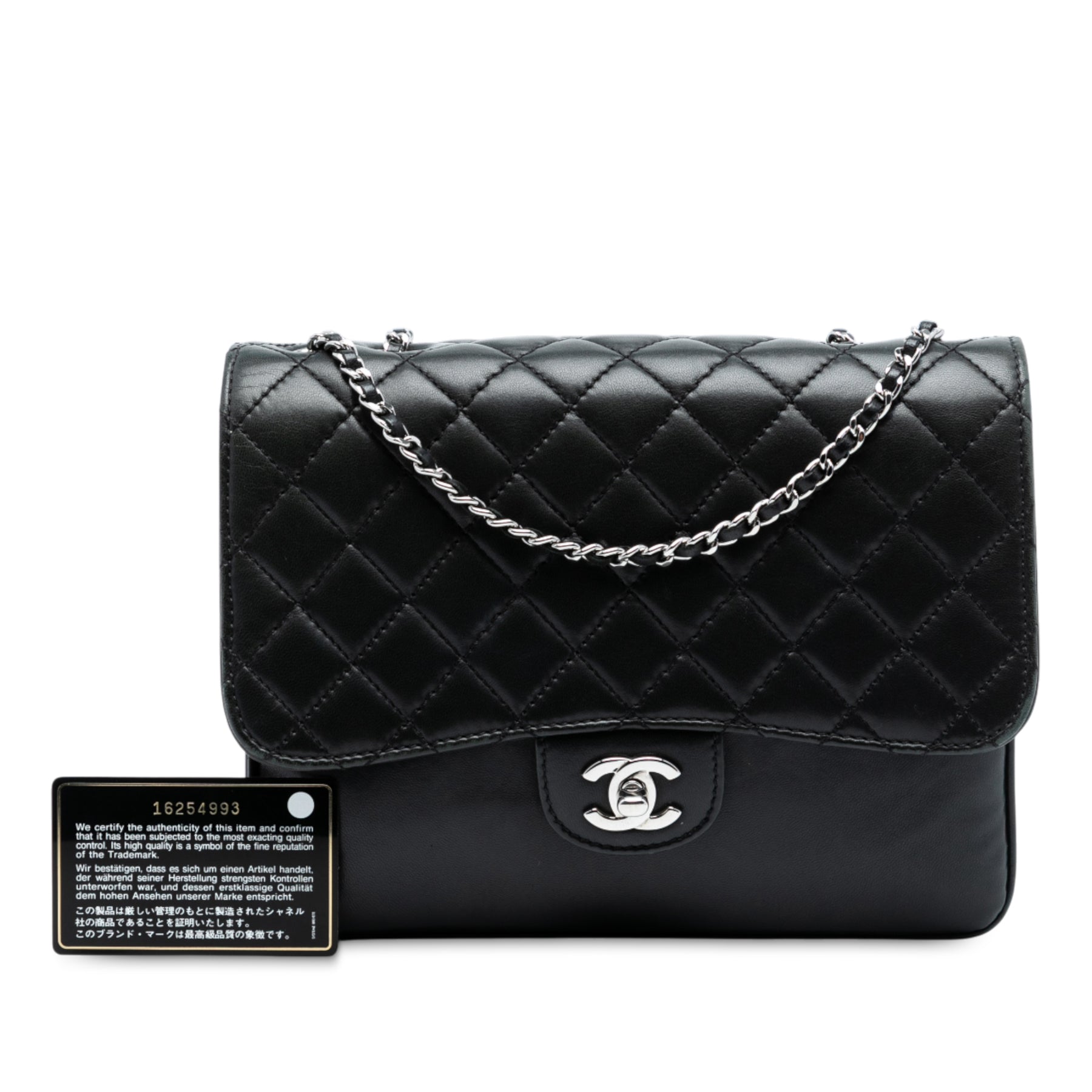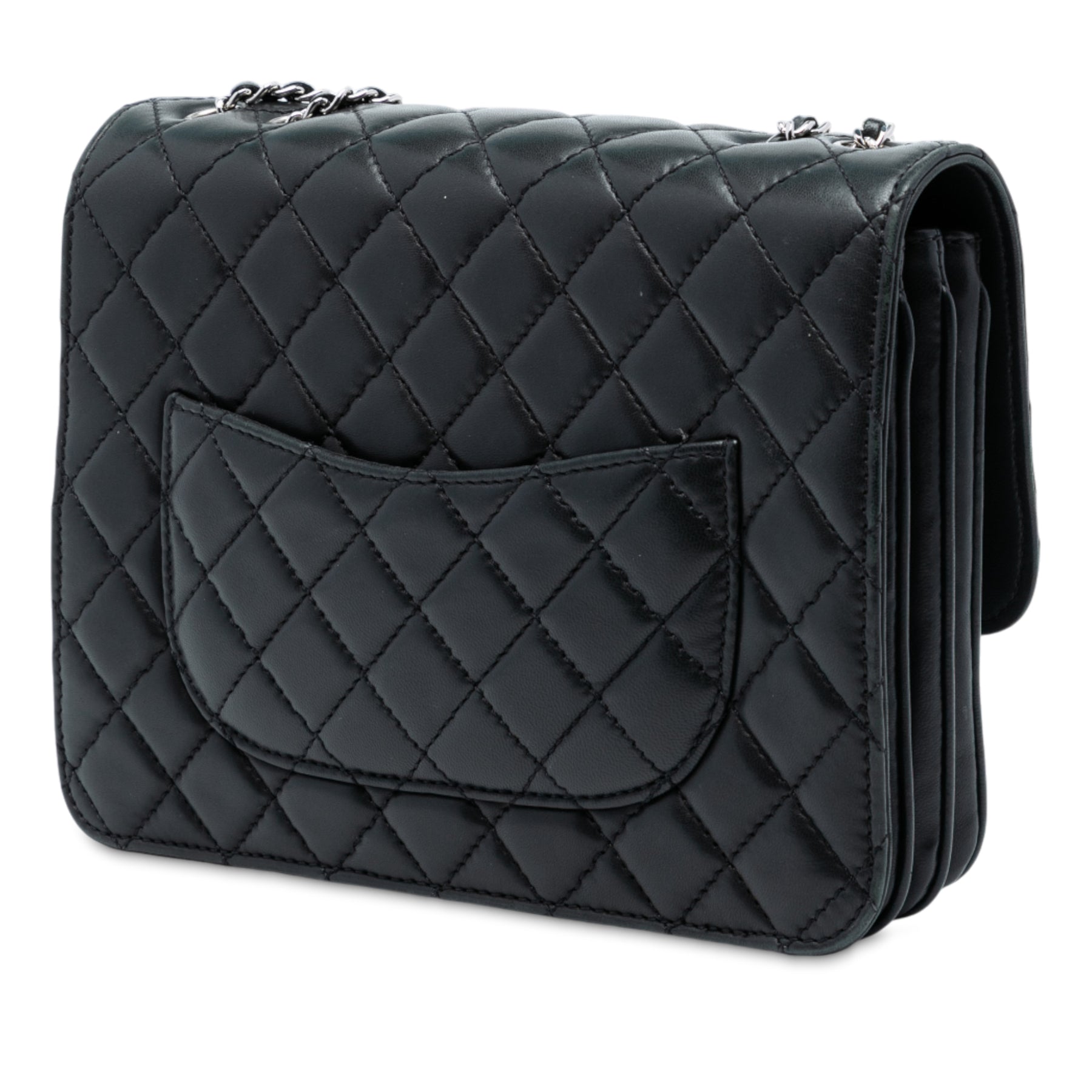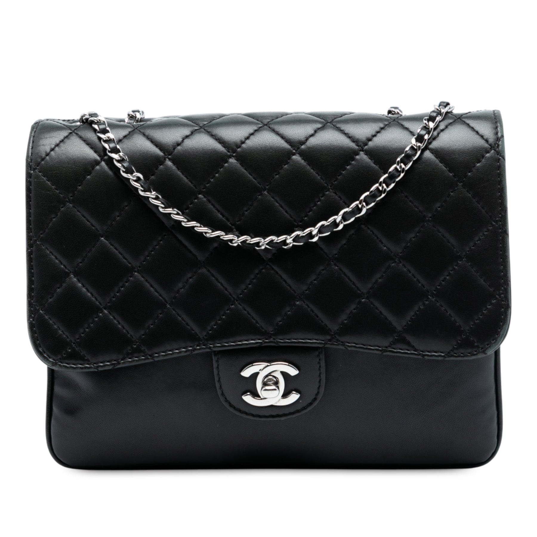 Ce sac bandoulière est confectionné en cuir d'agneau matelassé, avec des bandoulières en chaîne tressée de cuir, un rabat avant à fermoir CC, une poche plaquée extérieure au dos, des compartiments intérieurs zippés et ouverts, ainsi qu'une poche intérieure zippée. Il est en bon état.