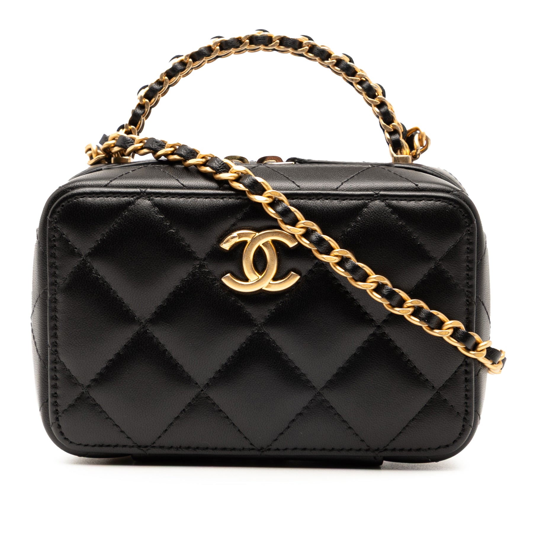 Ce sac à main est confectionné en cuir d'agneau matelassé et présente une poignée supérieure et une bandoulière en chaîne tressée de cuir, une fermeture zippée et une poche intérieure plaquée. Il est en excellent état.