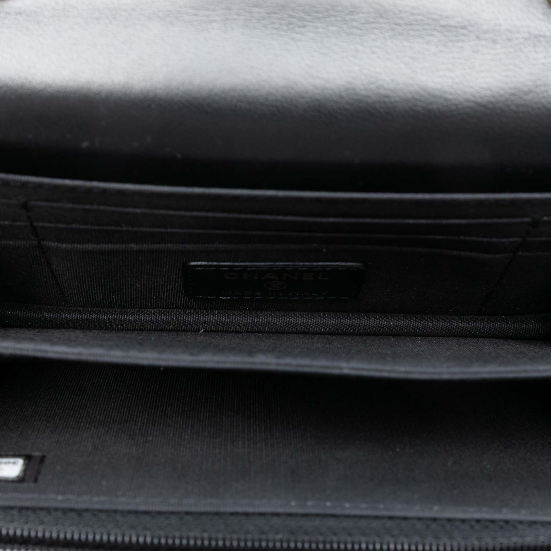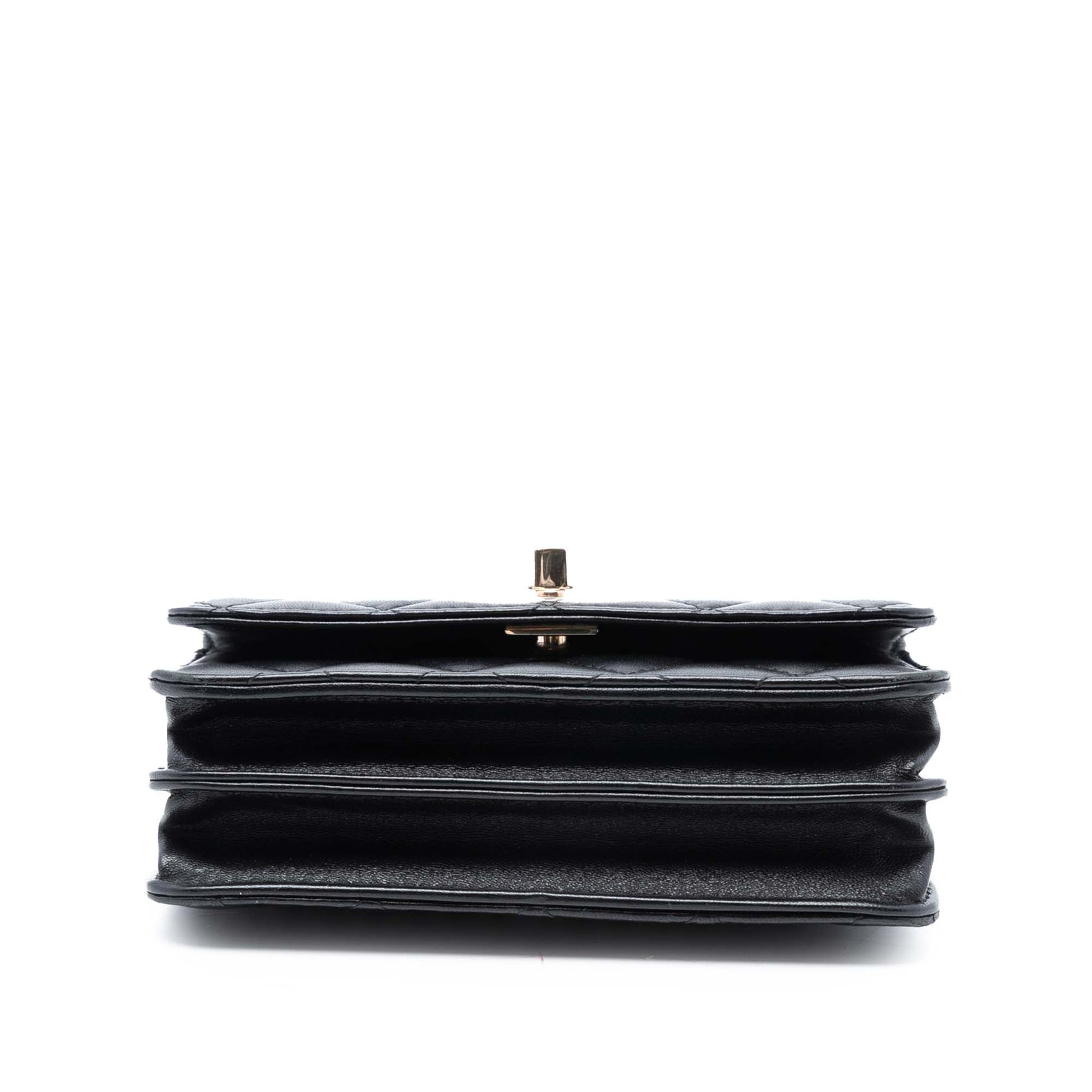 Ce portefeuille à chaîne est confectionné en cuir d'agneau matelassé et possède une bandoulière en chaîne tressée de cuir, un rabat avant avec fermoir tourniquet en forme de C et des poches intérieures zippées et plaquées. Il est en bon état.