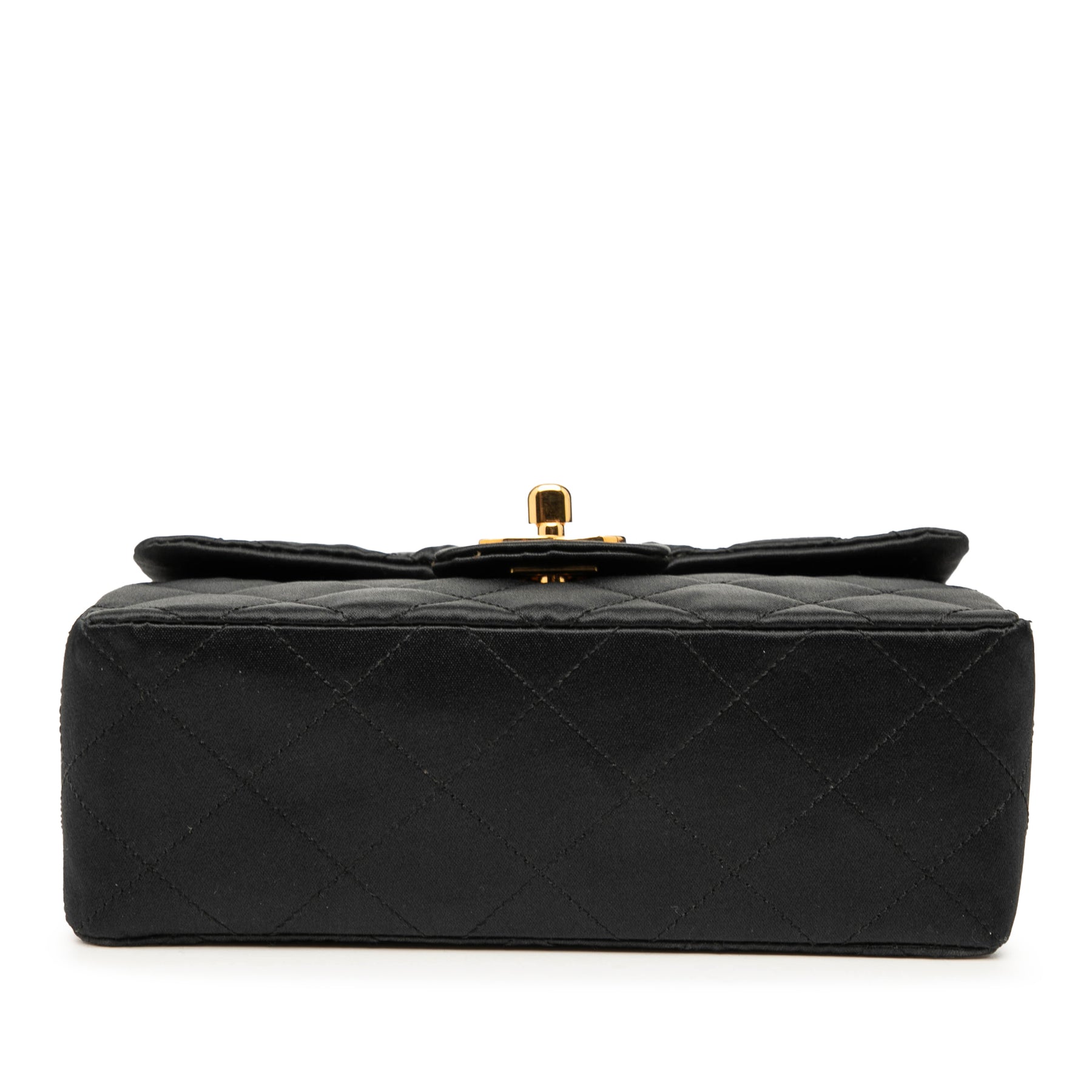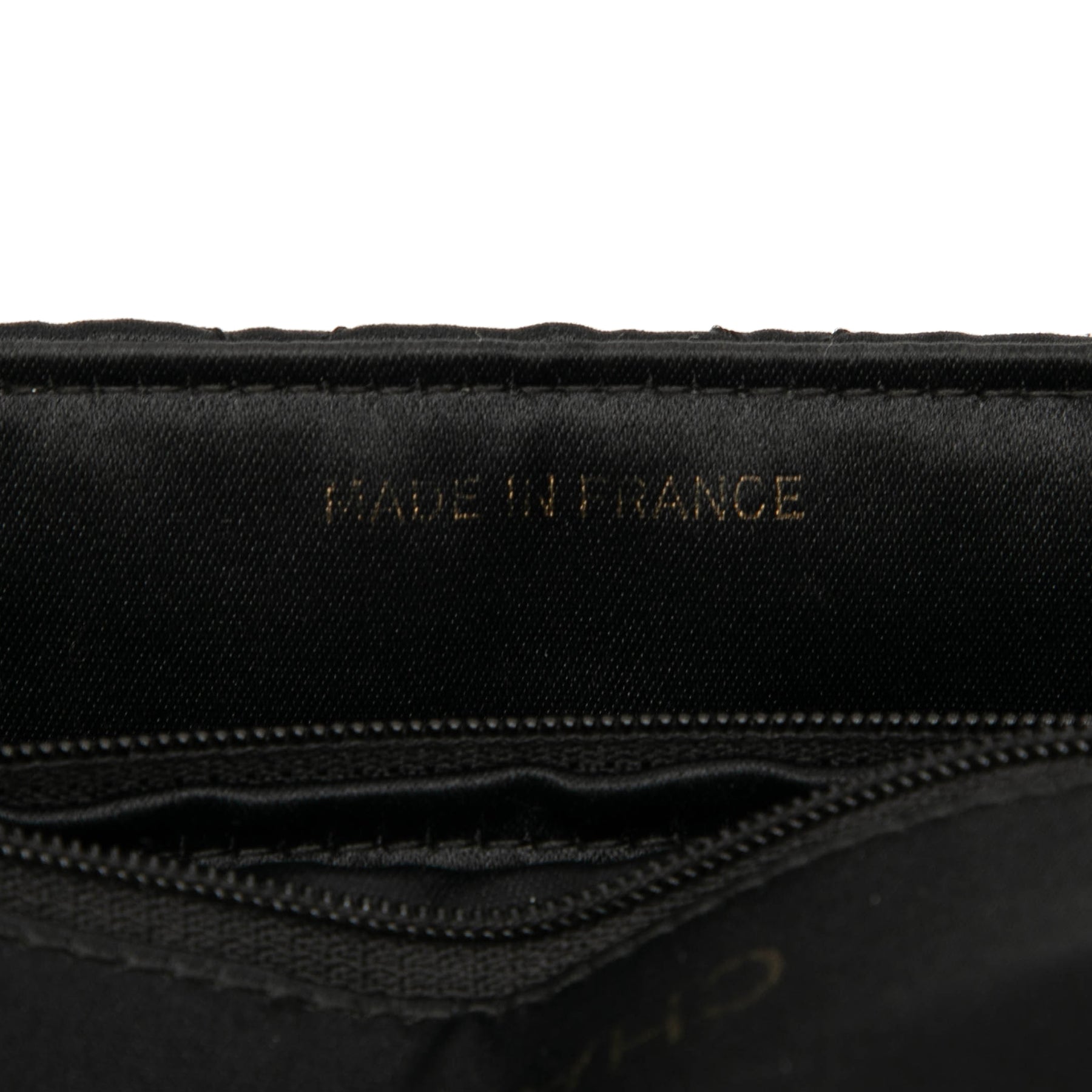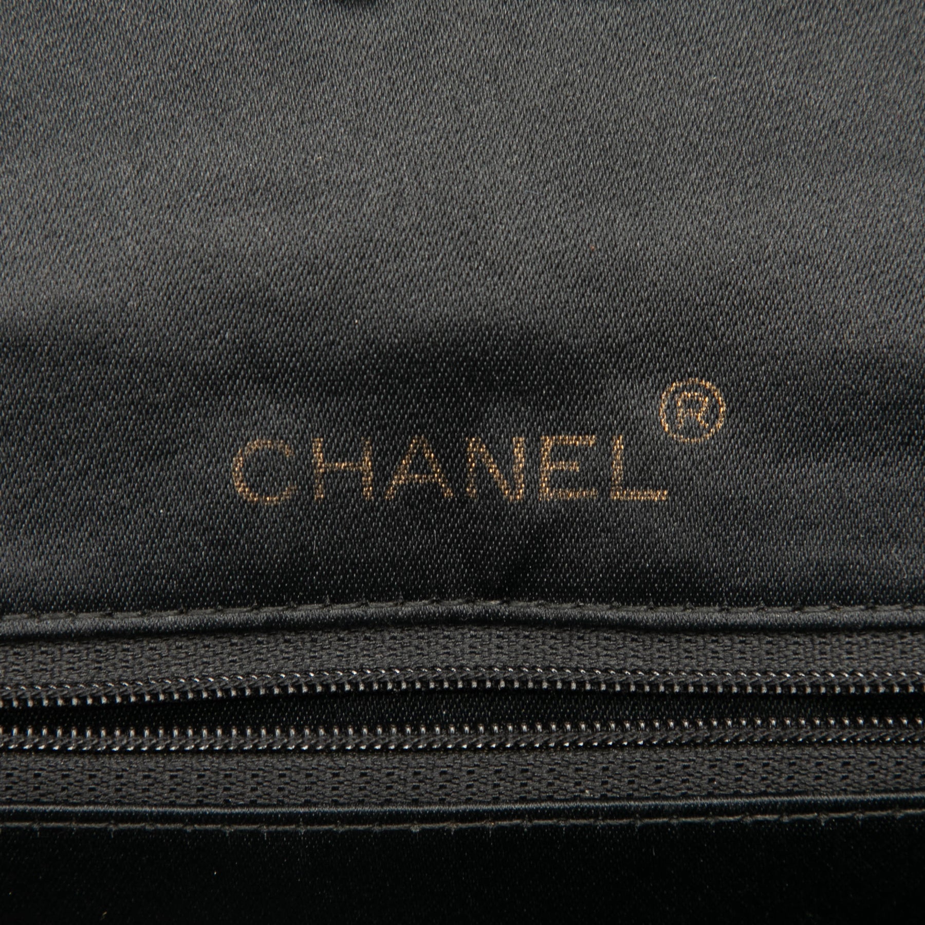 Ce sac bandoulière est en satin, avec une bandoulière chaîne tissée, un rabat à fermoir CC, une poche plaquée extérieure au dos et des poches intérieures zippées et plaquées. Il est en bon état.